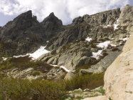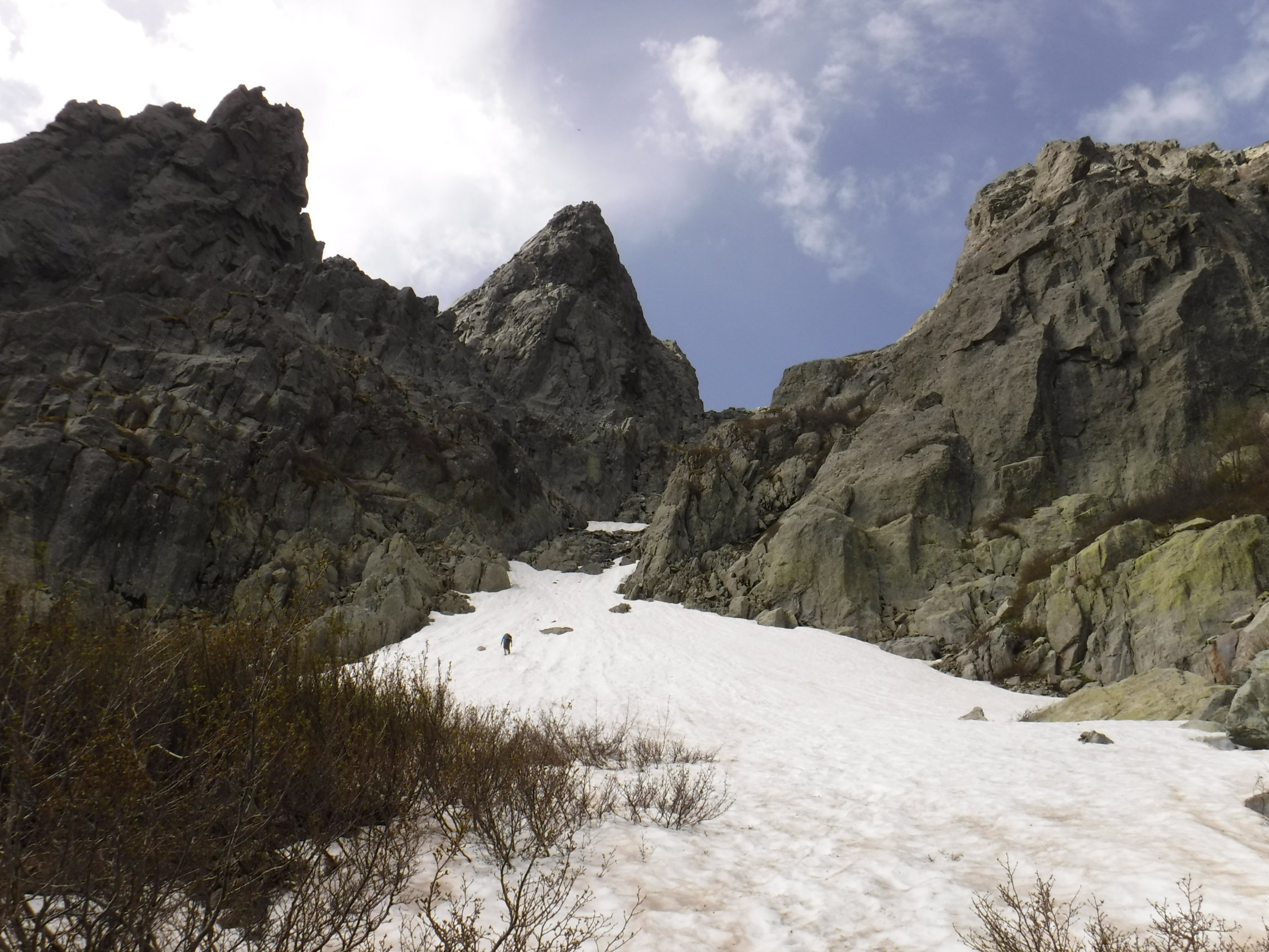 Tourenbeginn um 06:11 Uhr bei 13°C und heiterem Wetter. Im Nordost-Couloir lag noch Schnee, der noch stark verfirnt war, so dass ich Steigeisen aufzog, da ich sie dabei hatte aufgrund meiner Erfahrung am Monte Rotondo.