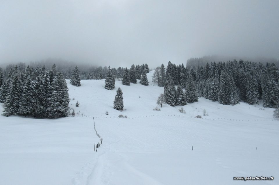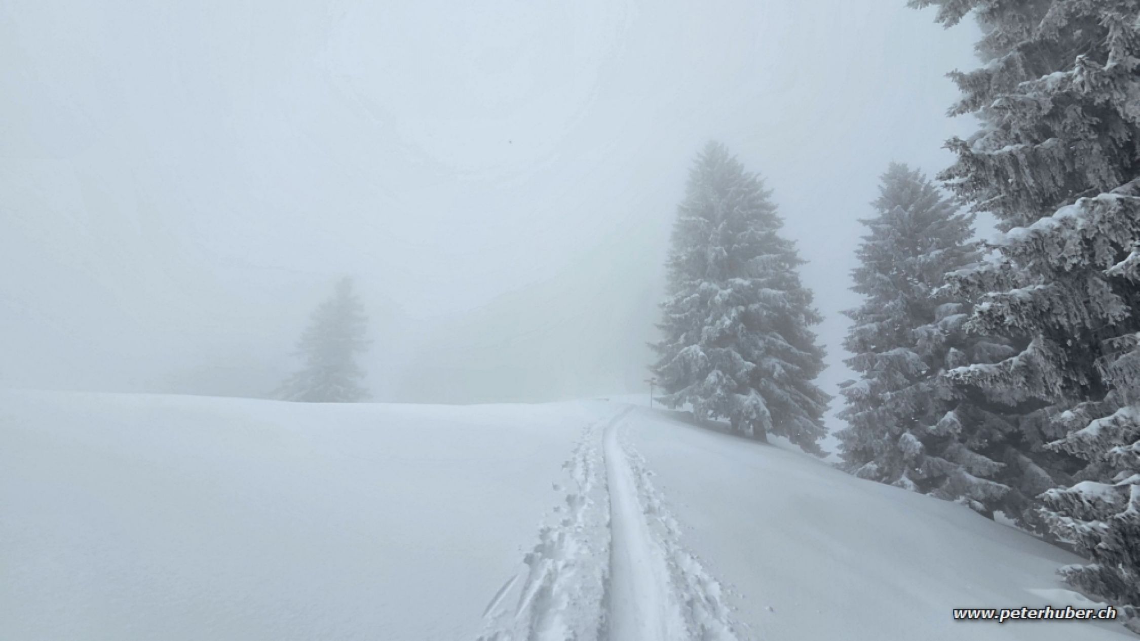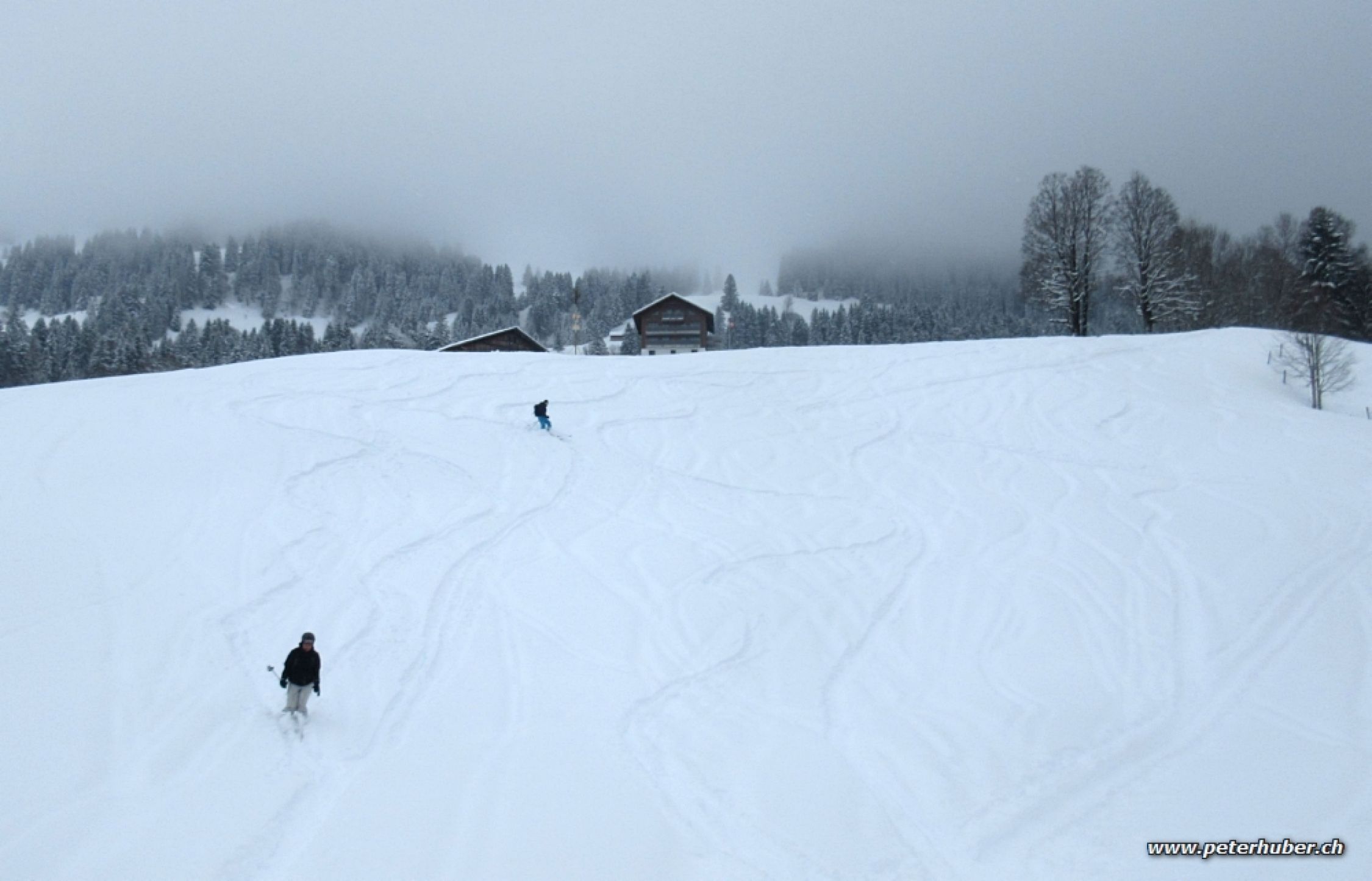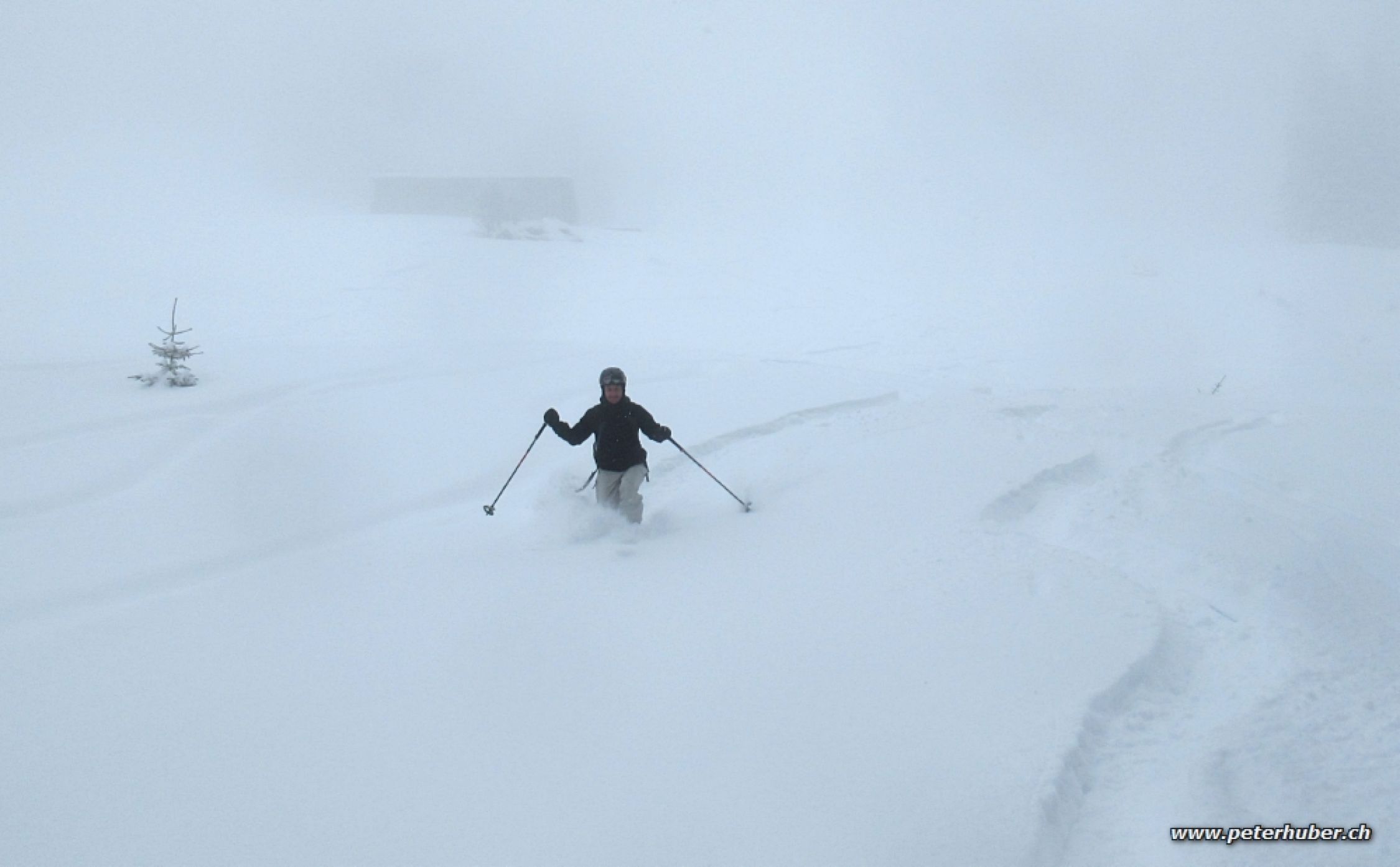Abfahrt - Bis 1500 m dichter Nebel, wenig Sicht, aber toller fast knietiefer, lockerer Pulverschnee. Dann sehr schöne Verhältnisse auf der Lichtung bei der Alphütte nahe P 1485 und weiter unten bei Grossweid. Ganz unten wurde der Schnee dann schon feucht und schwingen war nicht mehr gefragt.