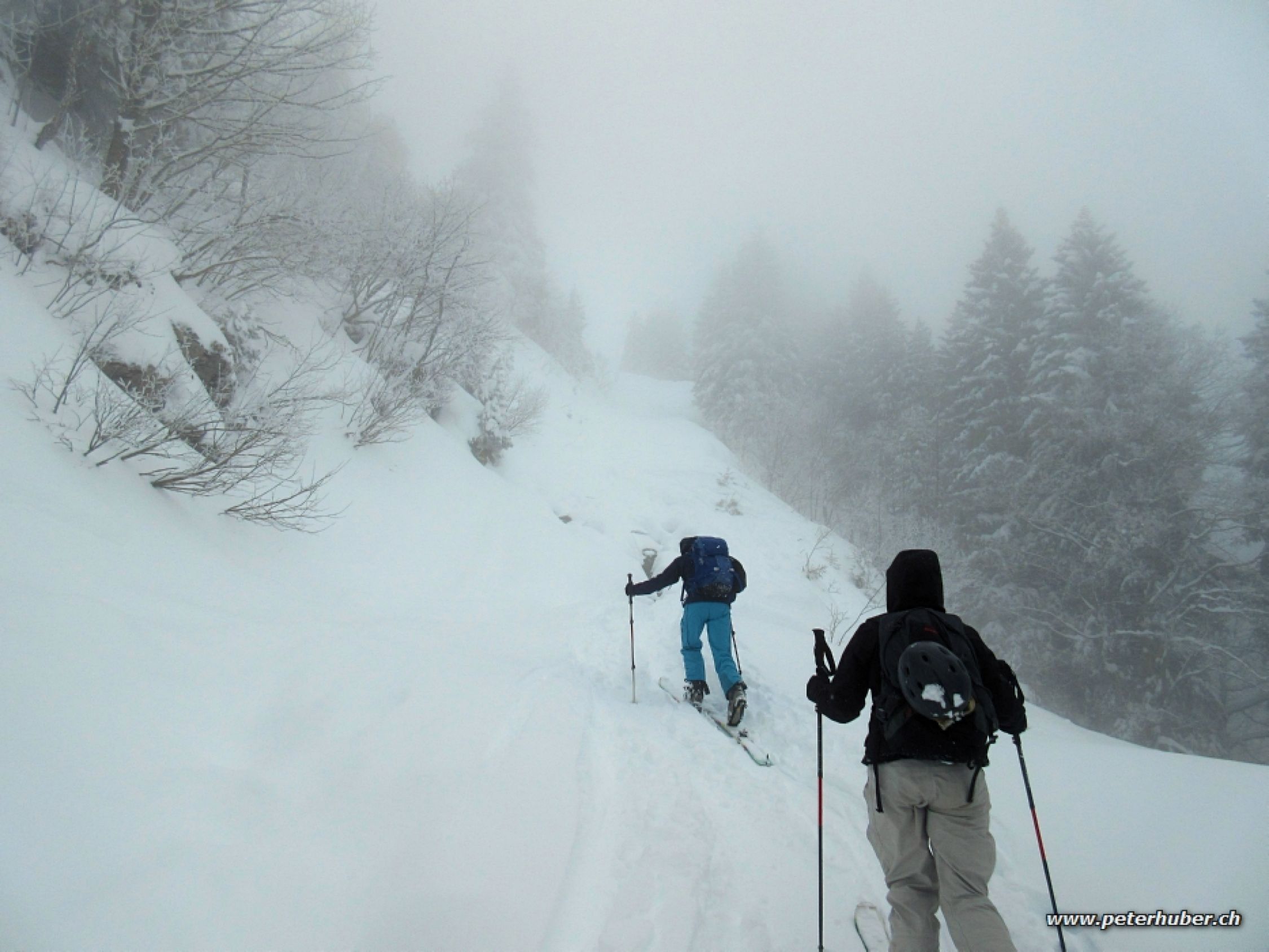 Eigentlich wollten wir aufs Laucherenstöckli. Doch wegen des vielen Neuschnees entschieden wir uns um, denn wir wollten die langen Flachstrecken nicht schieben.