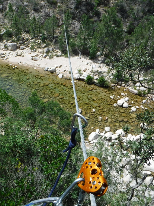 Bin die Tour mit eigenem KS-Material gestiegen. Die Doppelseilrolle von Fabr. Petzl für Seildurchmesser < 13 mm passt auf den Seilen, ist jedoch etwas langsam bei den flachen Seil-Lagen. Der Steig macht einen etwas verlassenen Eindruck, zwar sind die Schilder noch vorhanden. Man sieht denen aber das Alter an. Im Gehgelände (Abstieg nach dem Bach) ist der Pfad stellenweise mit Dornengesträuch eingewachsen. Es sind aber frische Trittspuren vorhanden. Von der großen Seilrutsche kann man den Leuten beim Schwimmen im Fluss zuschauen. Abschließend kann man sich selber dort erfrischen.