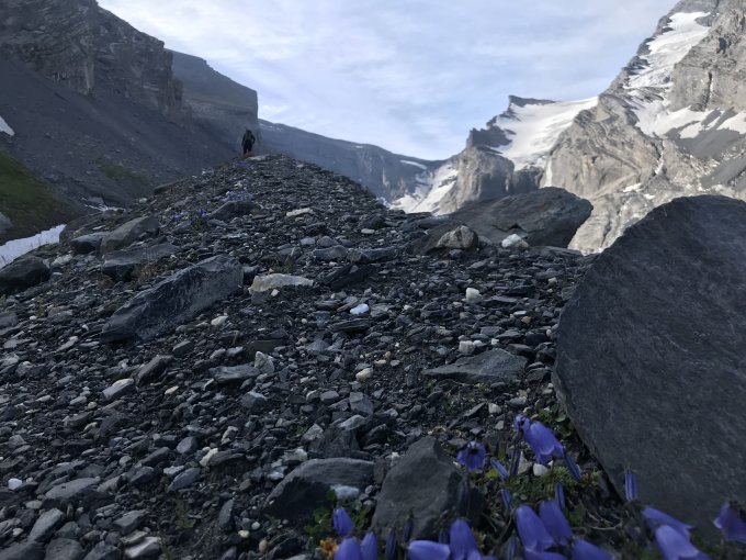 Achtung auf die fallenden Felsbrocken unterhalb des Rinderhorns. Üblicherweise kommen sie vom Zackengrat angerollt