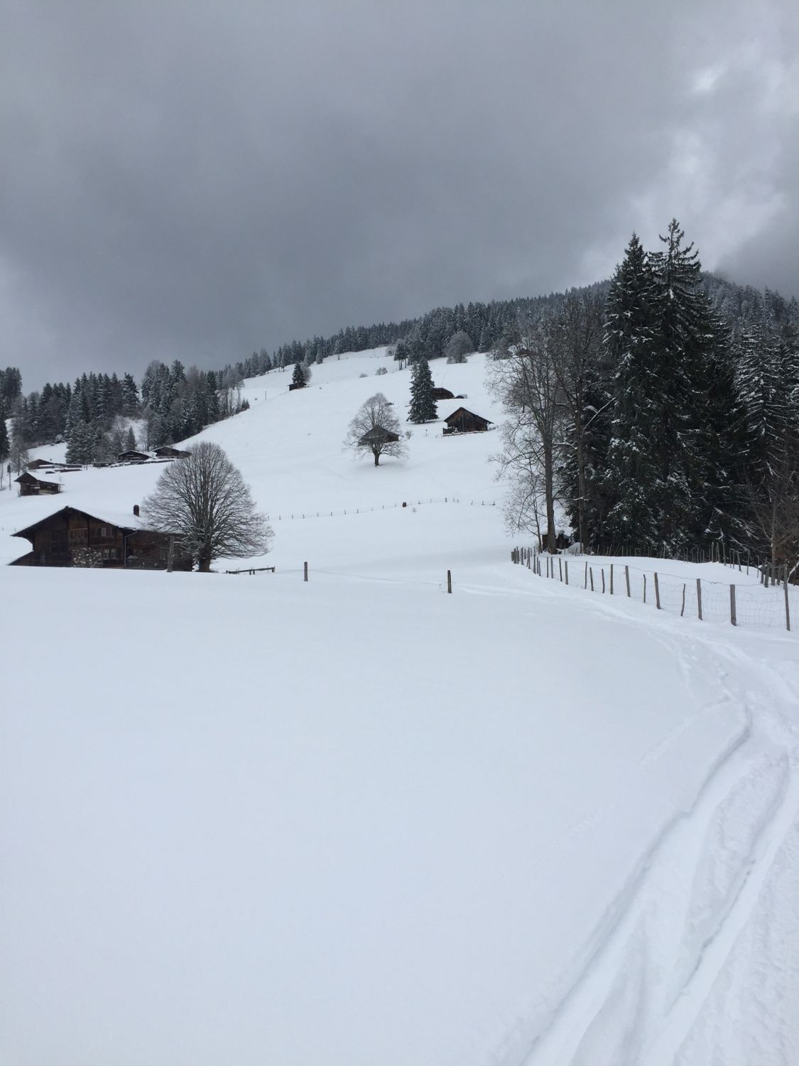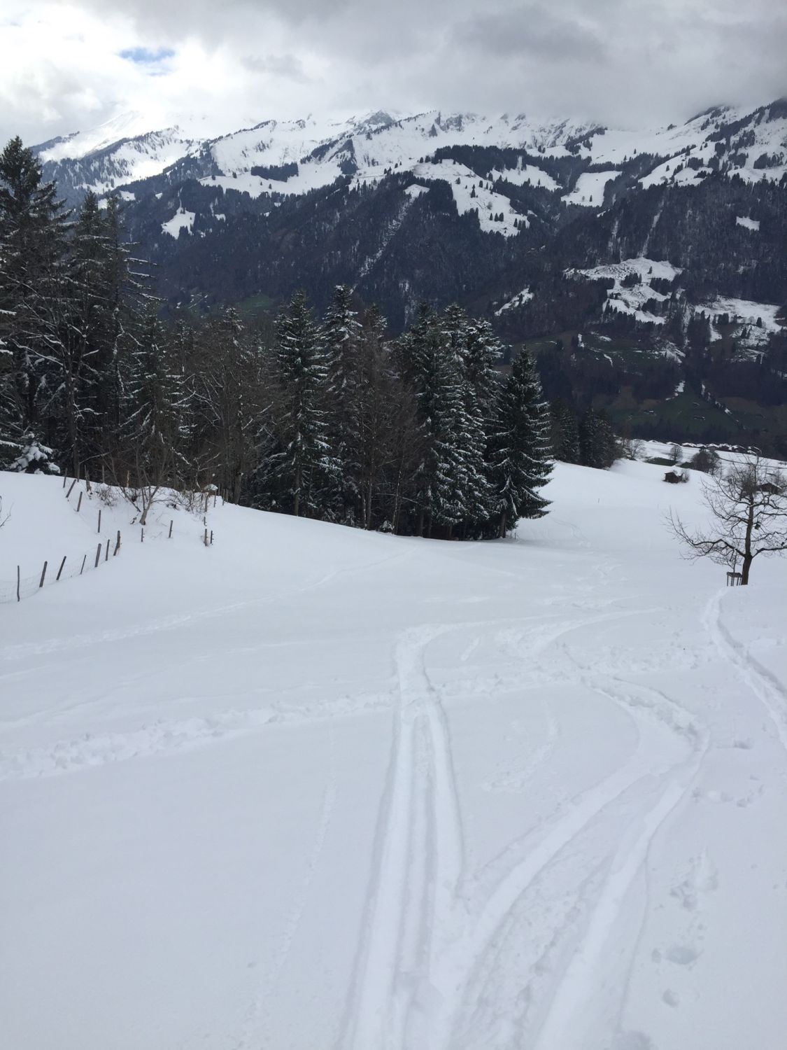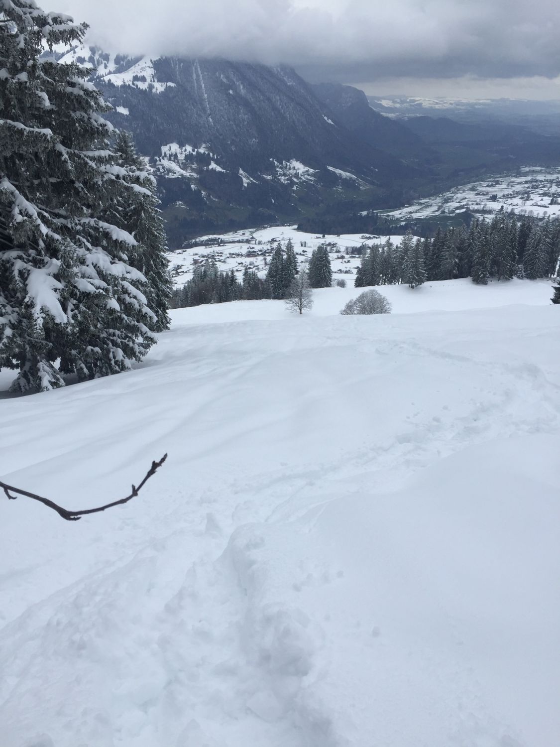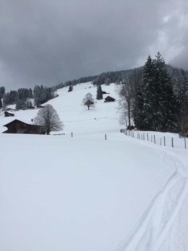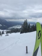 Später Start um 14.45. Temperatur knapp über Null. Wetter verhangen. Beim Start auf 900 m.ü.M 20-30 cm Nassschnee. Ab 1200 in Pulver übergehend. Oben 50 cm Pulver eher Feucht. Gut fahrbar!