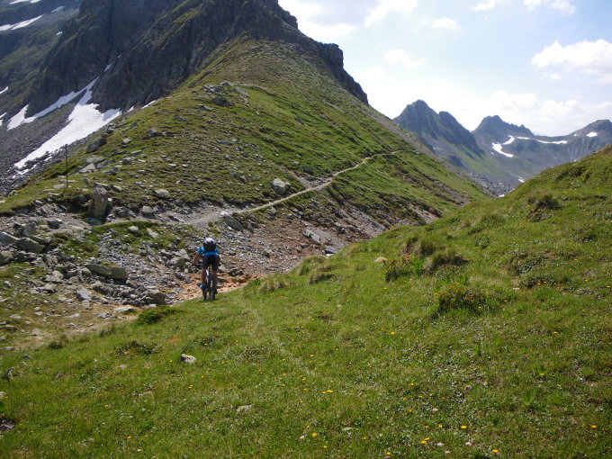Am Schweizer Tor oben hat man die Wahl hinabzufahren ins Relstal, oder in westliche Richtung zum Verajoch und dann zum Lünersee, oder in östliche Richtung zum Öfapass (so wie wir). Den erreicht man nur nach ca. 150hm teils fahrend teils schiebend relativ rasch. Dann hinunter zur Lindauer Hütte in anspruchsvollen Singeltrail - zum Bier.