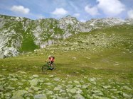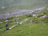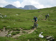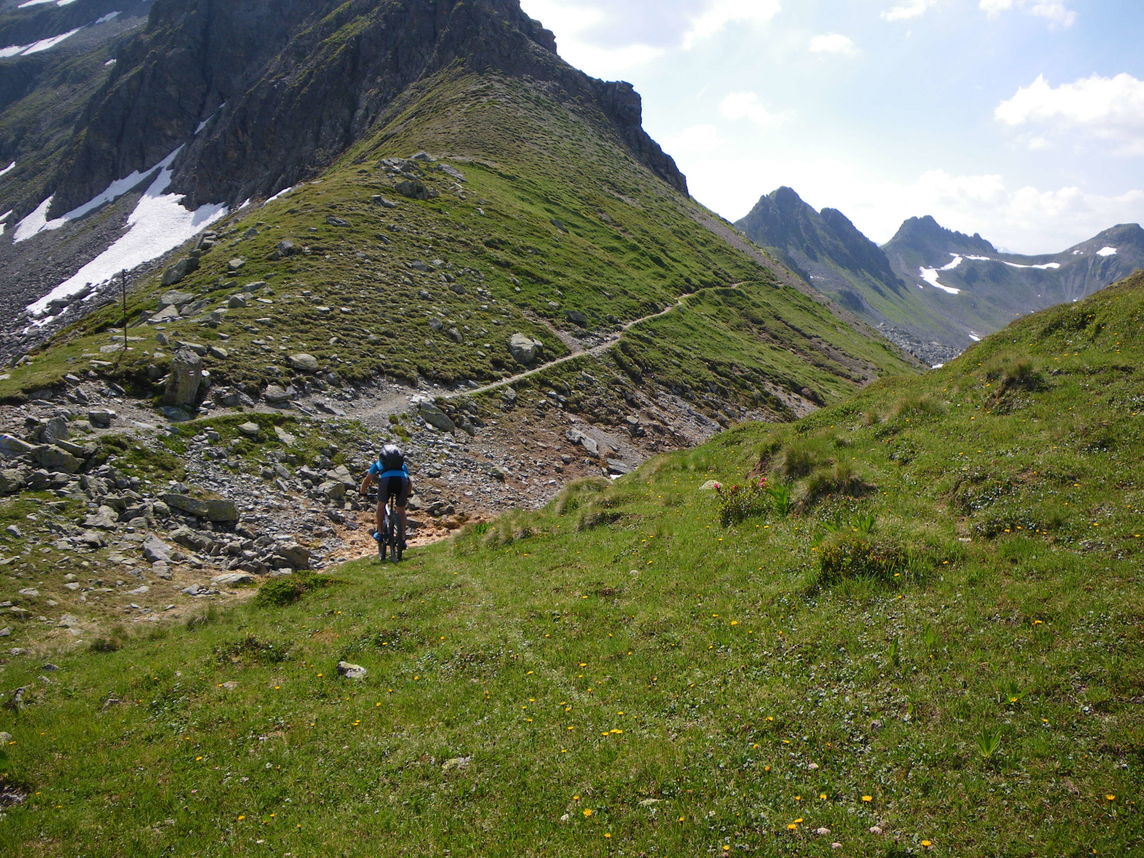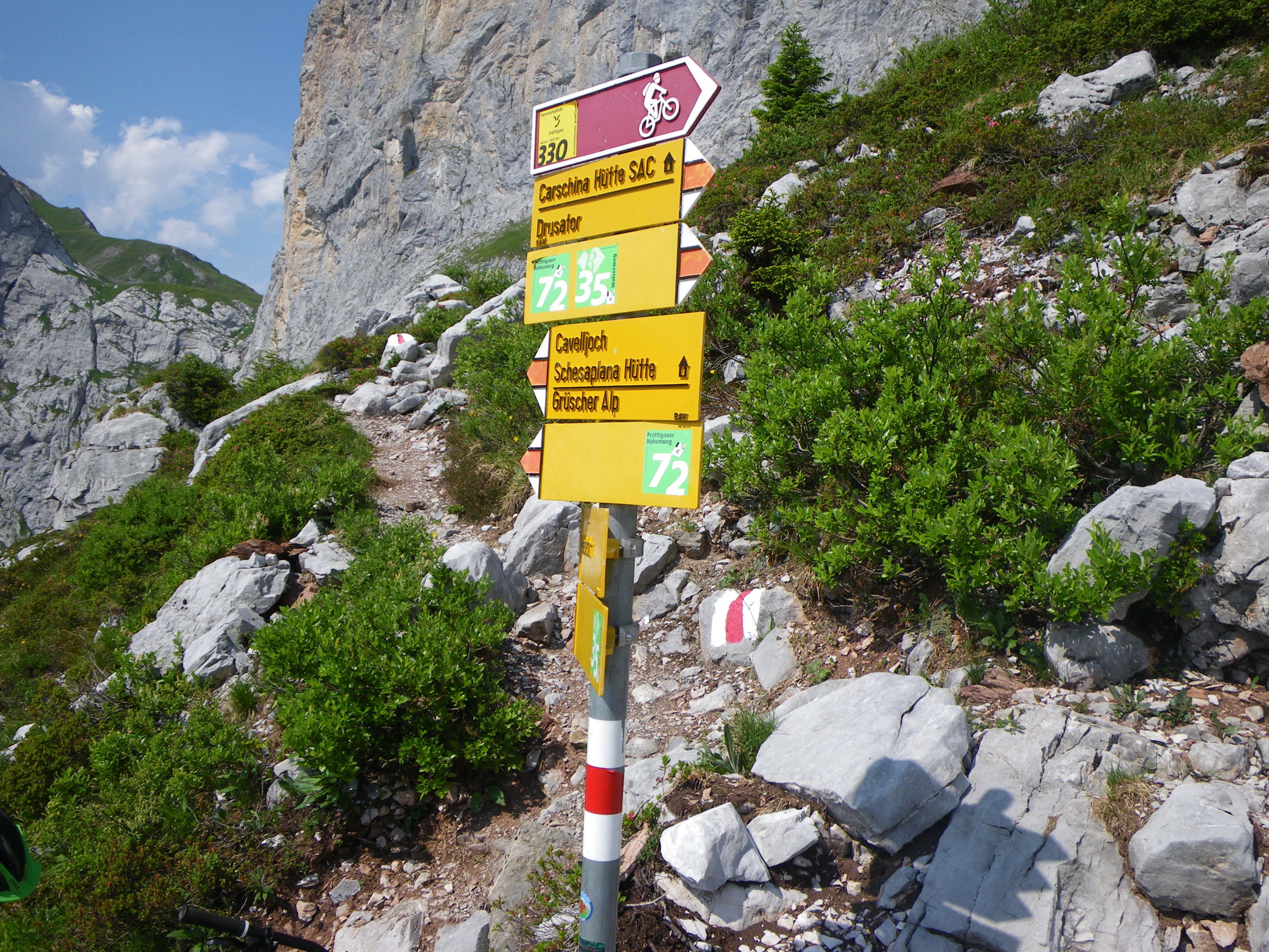 Die Abfahrt vom Plasseggenpass nach Partnun, in der "Enge" ist sehr anspruchsvoll und keine Schande wenn man dieses Teilstück schiebt. Vom Alpenrösle zuerst in schönem Fahrweg einige Höhenmeter hinauf und dann der Beschilderung nach zur Carschina Hütte in teils fahrbarem und teils zu schiebenden Trails (Wanderweg).