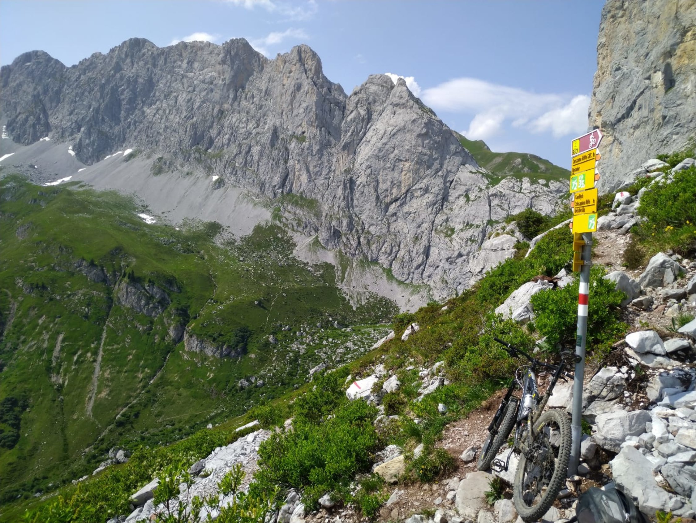 In einer wunderschönen Kulisse unter der Drusenfluh dem Prättigauer Höhenweg entlang ist beinah alles fahrbar. Dann bei der Abzweigung zum Schweizer Tor das Rad teilweise schiebend, fahrend und tragend weiter bis es ganz steil wird zum Schweizer Tor. Teilversichert mit Stahlseil und eine kurze Passage über eine Stahlleiter hinauf.