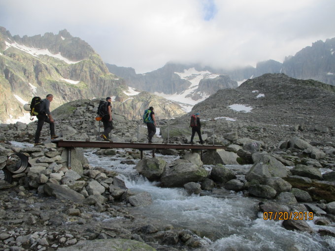Vorhandene Schneefelder waren weich genug, sodass deren Begehung ohne Pickel und Eisen möglich war. Die größte Ausdehnung hat derzeit noch das Schneefeld zwischen der Sidelenhütte und der Unteren Bielenlücke. Das unter der letzten Abseilrampe schlummernde Schneefeld kann im Zuge des Abseilens gleich mit überwunden werden.
