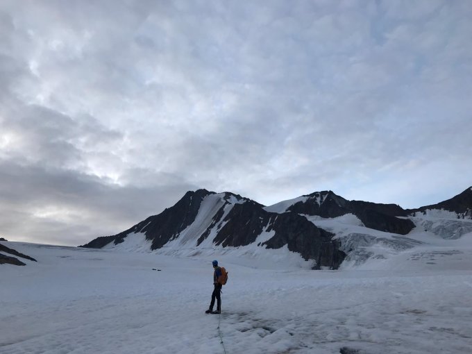 Vorallem im oberen Bereich des großen Gletscherbeckens liegt noch einiges an Schnee. Spalten sind kaum sichtbar (wahrscheinlich noch großflächig verdeckt). Schneedecke harrschartig; manche Stellen anstrengend wegen Einbruch durch die oberste Schneedecke. Mittags Firn/Sulz.