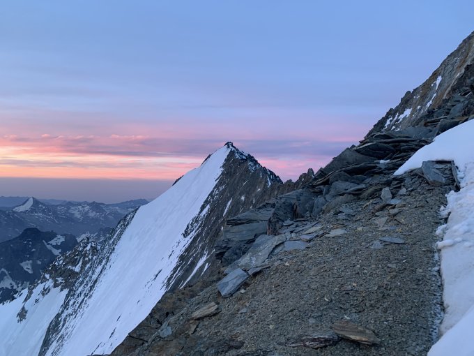 Sehr gute Bedingungen. Die exponierten Stellen am Firngrat können als Alternative auf dem Grat überklettern werden oder auf den Bändern in der Ostwand umgangen werden.
