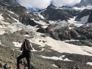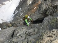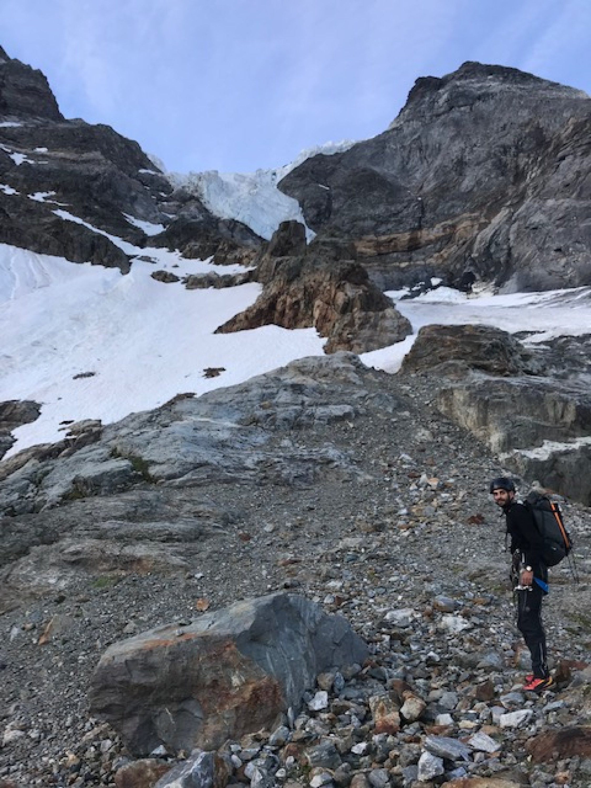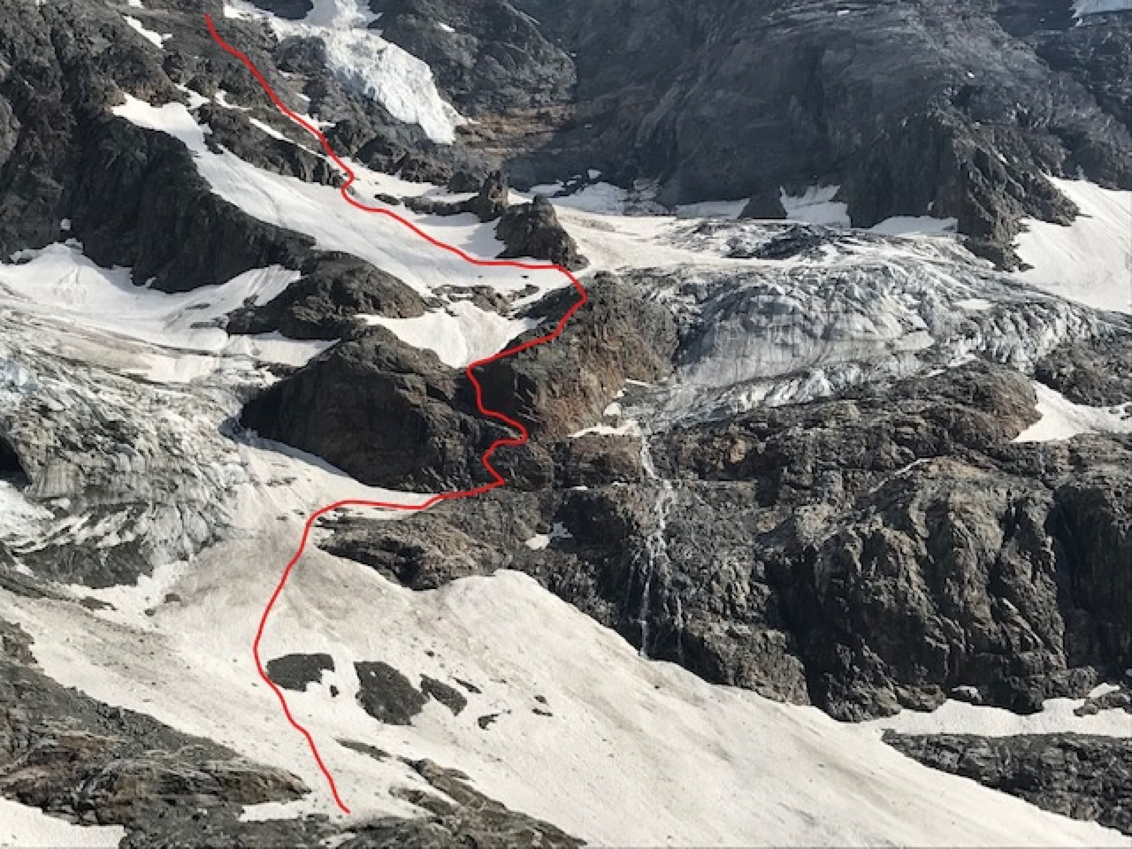 Führe: Nach der Schmadrihütte Richtung Südwesten ansteigend über die markante Moräne. Diese verlassen wir nach 10 Minuten und steuern über Block- und Firnfelder das sich senkrecht aufstellende Bollwerk rechts vom “hintern Schmadrigletscher“ an. Unterhalb dessen queren wir über die Terrasse nach rechts und überschreiten den kleinen Bach, der als Wasserfall in der gut sichtbaren Verschneidung über die Felsen fliesst.
