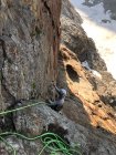 15m nach dem Wasserfall befindet sich am Wandfuss ein Steinmann. Von hier aus wird die kleine gegen links ansteigende Rampe in griffigem Granit erklettert II (Zwischensicherung Friend). Der Aufschwung flacht rasch ab und leicht rechts ansteigend nach 30m direkt über dem Einstieg befindet sich der 1. BH, geeignet für die Nachsicherung. Weiter folgen wir rechterhand der senkrechten Wand der Rampe (Zwischensicherung mit Friend) hoch, bis zu einem kurzen Steilaufschwung (IV Schlüsselstelle). Hier und fortfolgend befinden sich in kurzen Abständen an der Wand weitere 4 BH, welche das Erklettern der oft nassen fein gestuften Platten erleichtern. Nach dem letzten BH übersteigt man rechts den kurzen Aufschwung III und erreicht das Plateau, auf welchem sich der letzte BH für die Nachsicherung befindet.