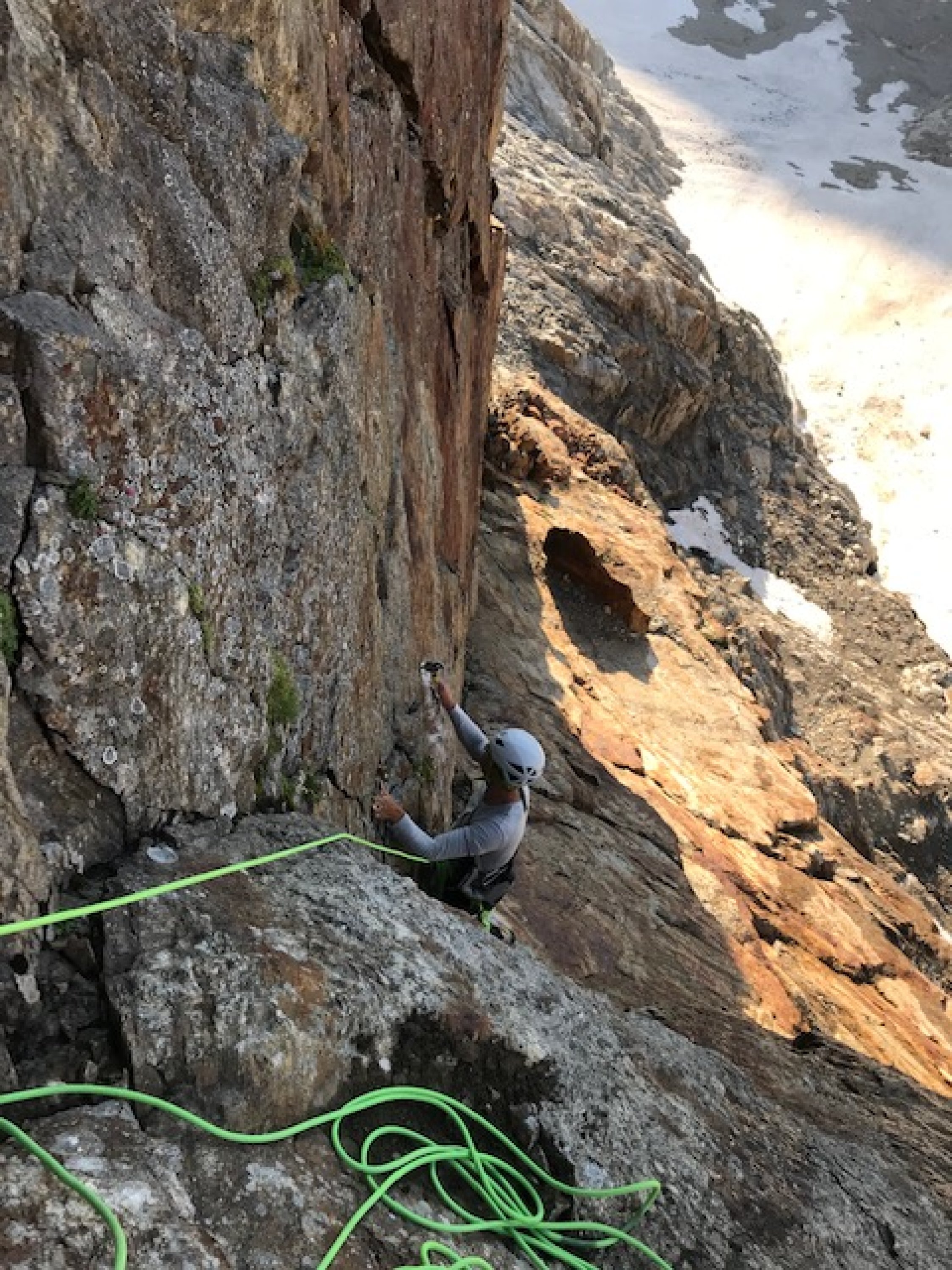 Deshalb erstellten wir am Vortag einen mit Borhacken gesicherten direkten Zugang im Felsen, welcher gut mit kleinen Friends zusätzlich gesichert werden kann.