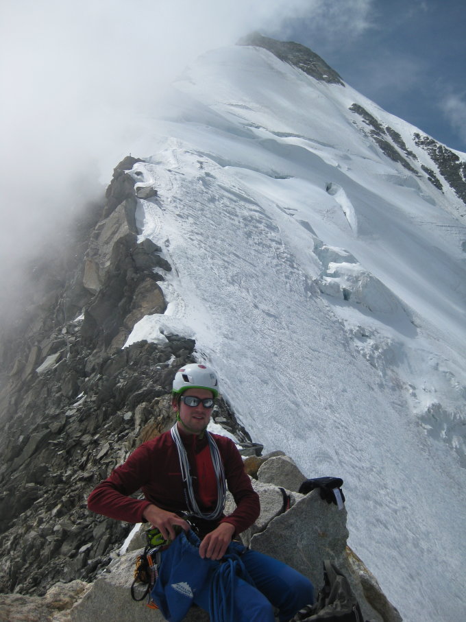 Felsen trocken, jeden Tag erreichen ca. 5 Seilschaften via Ostgrat den Gipfel. Allerdings sind die "Zuckerverhältnisse" vorderhand vorbei. Der obere Teil des Firngrates ist schon recht blank, die Tour richtet sich nun eher an die Fortgeschrittenen. Viele Seilschaften (so auch wir) ziehen es vor, den oberen, bis ca 45 Grad geneigten Grat im Abstieg über ca. 120 hm mit Eisschrauben abzusichern. Im Grat darunter guter Trittfirn. Daher ein (gut) "machbar".