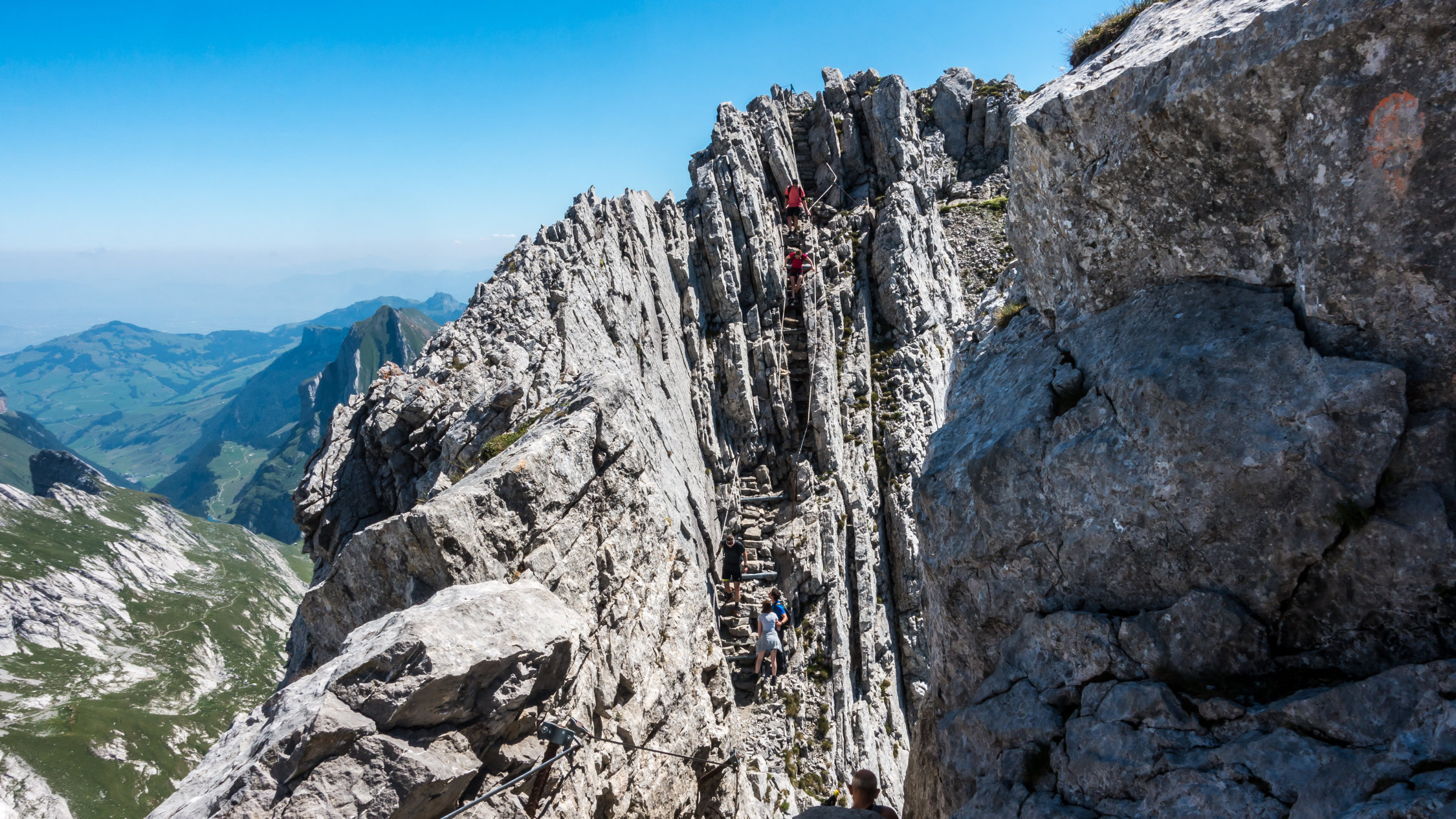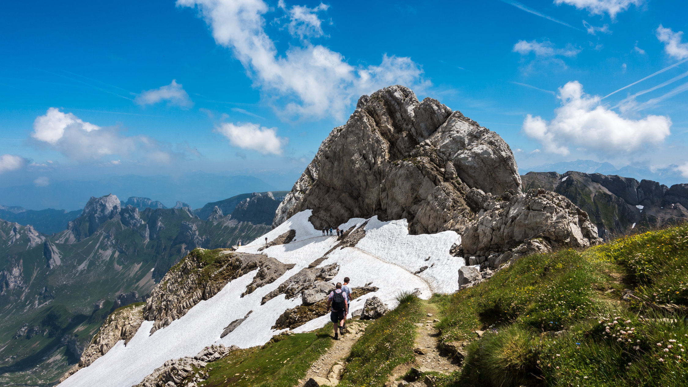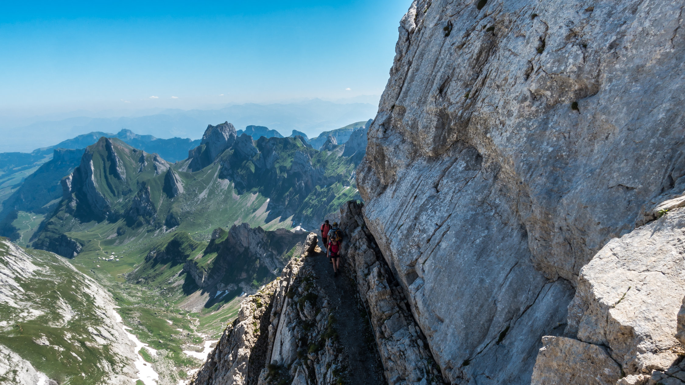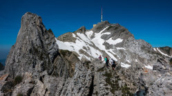 Traumtag, warm aber im oberen Teil mit leichtem Wind angenehm. Bis am frühen Nachmittag wolkenlos, danach ein paar harmlose Quellwolken. Noch mehrere, teils ausgedehnte Schneefelder zu überqueren, sonst trocken. Die exponierten Stellen an der Fliswand und am Lisengrat sind alle sehr gut mit Drahtseilen gesichert. Abstieg zurück über Lisengrat und vom Rotsteinpass über Schafboden - Gamplüt zurück nach Wildhaus (ganze Runde 20 km, 2000 Hm)