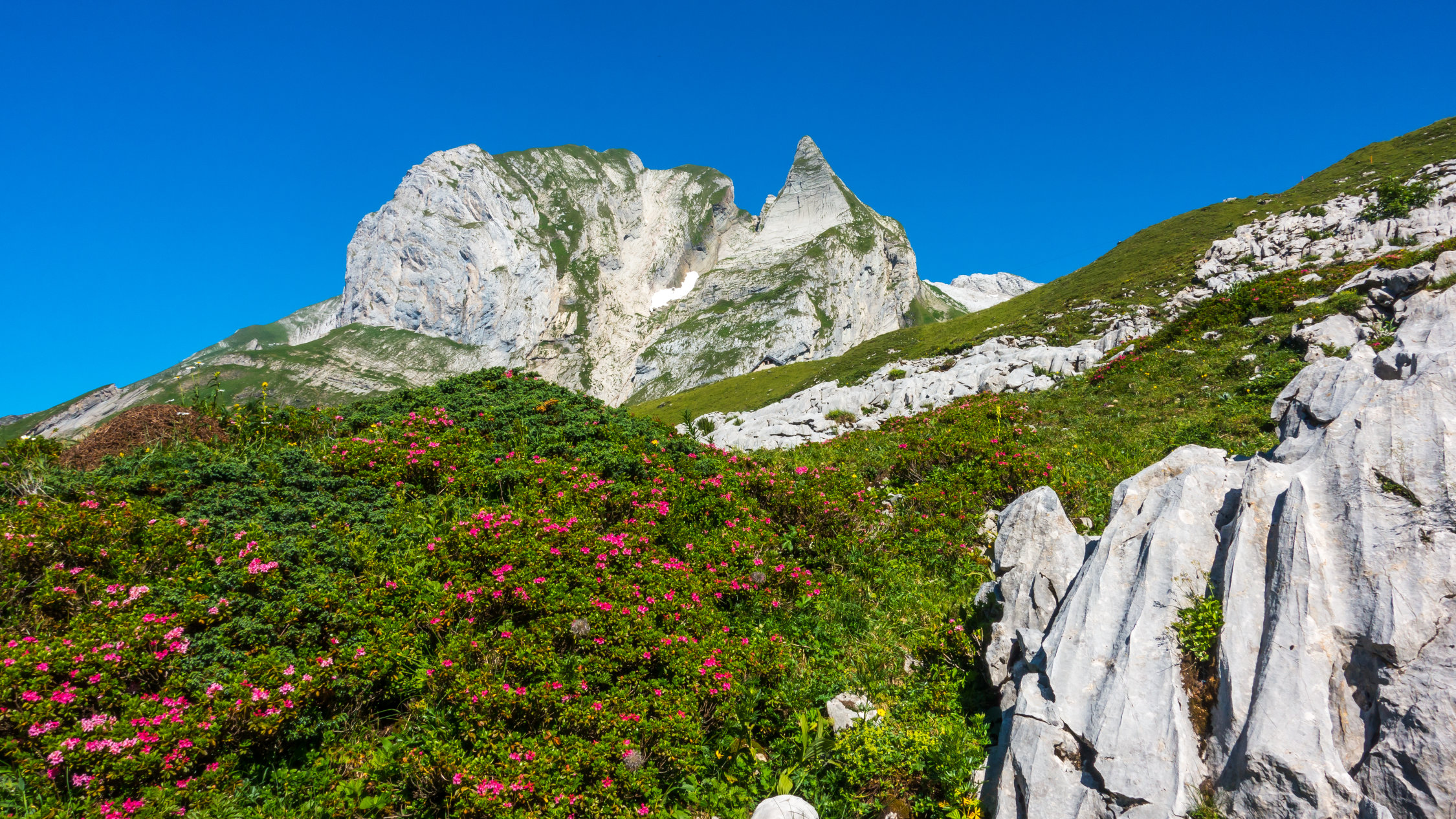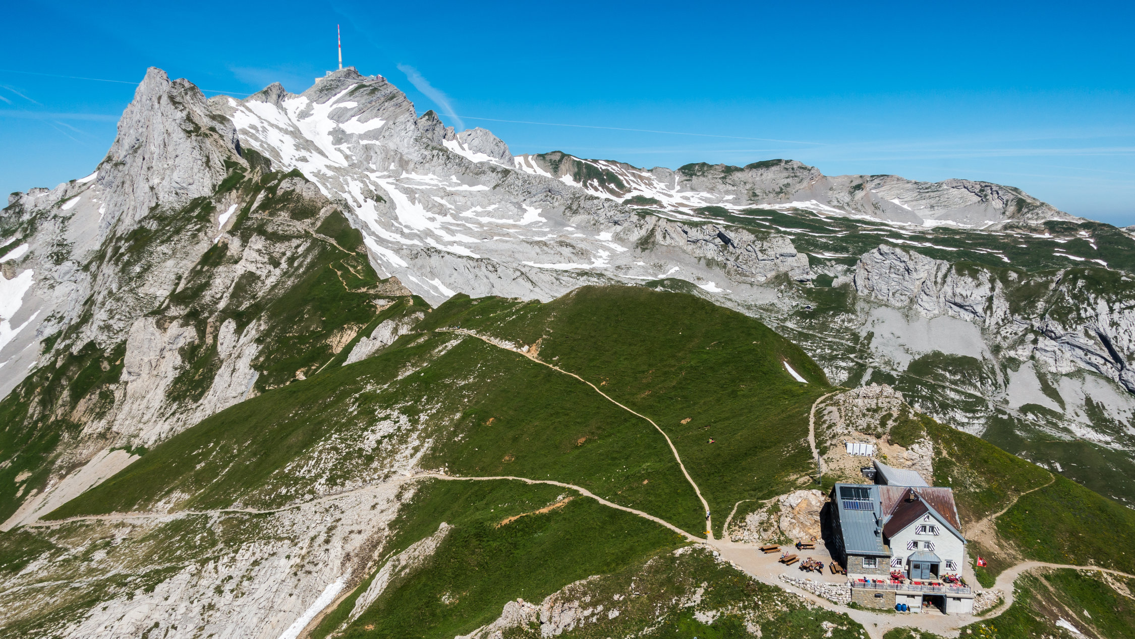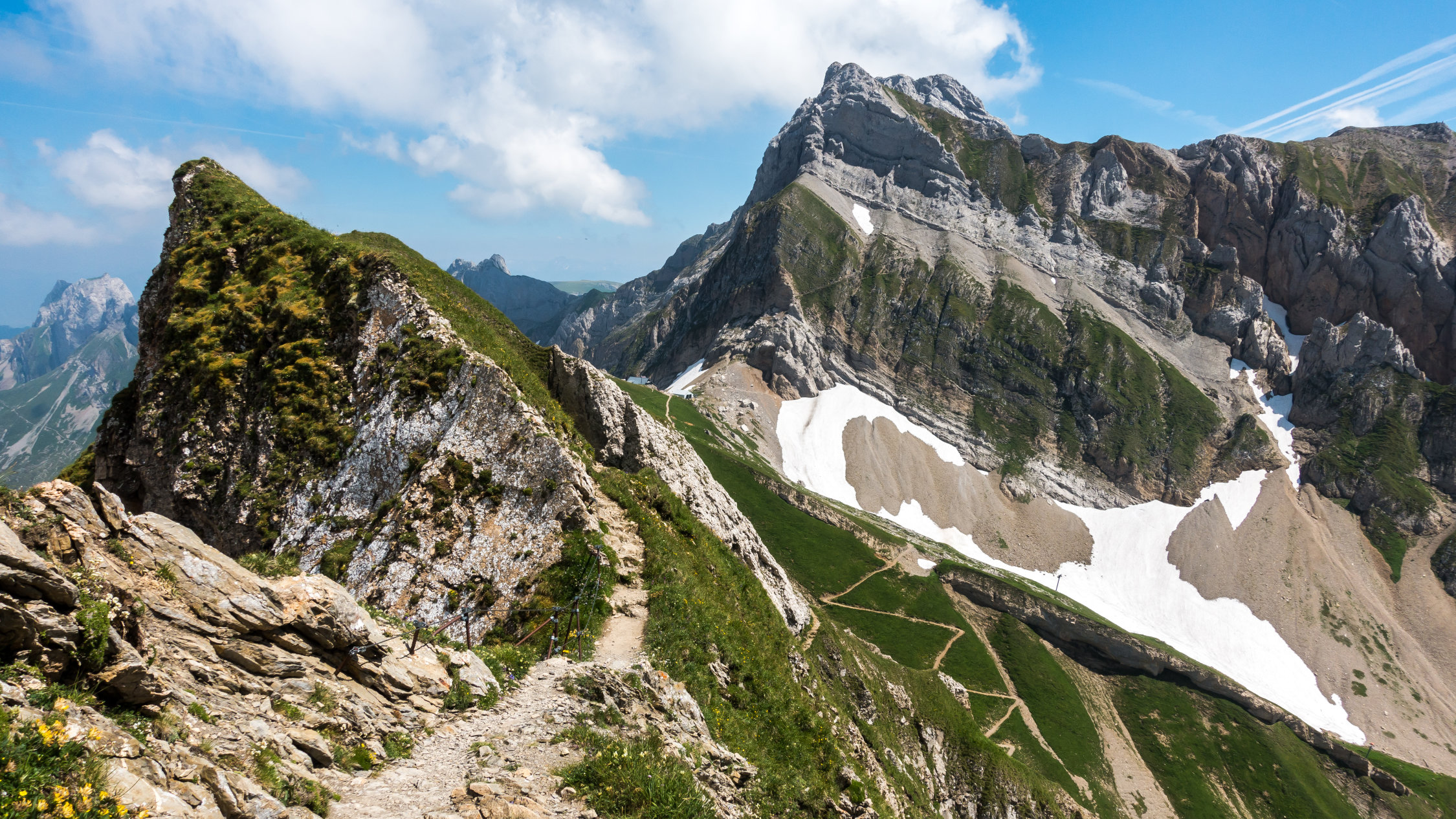 Traumtag, warm aber im oberen Teil mit leichtem Wind angenehm. Bis am frühen Nachmittag wolkenlos, danach ein paar harmlose Quellwolken. Noch mehrere, teils ausgedehnte Schneefelder zu überqueren, sonst trocken. Die exponierten Stellen an der Fliswand und am Lisengrat sind alle sehr gut mit Drahtseilen gesichert. Abstieg zurück über Lisengrat und vom Rotsteinpass über Schafboden - Gamplüt zurück nach Wildhaus (ganze Runde 20 km, 2000 Hm)