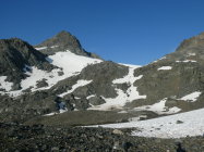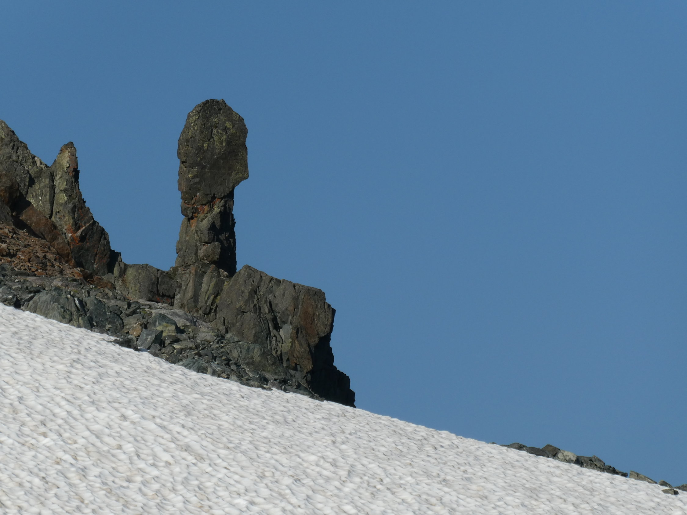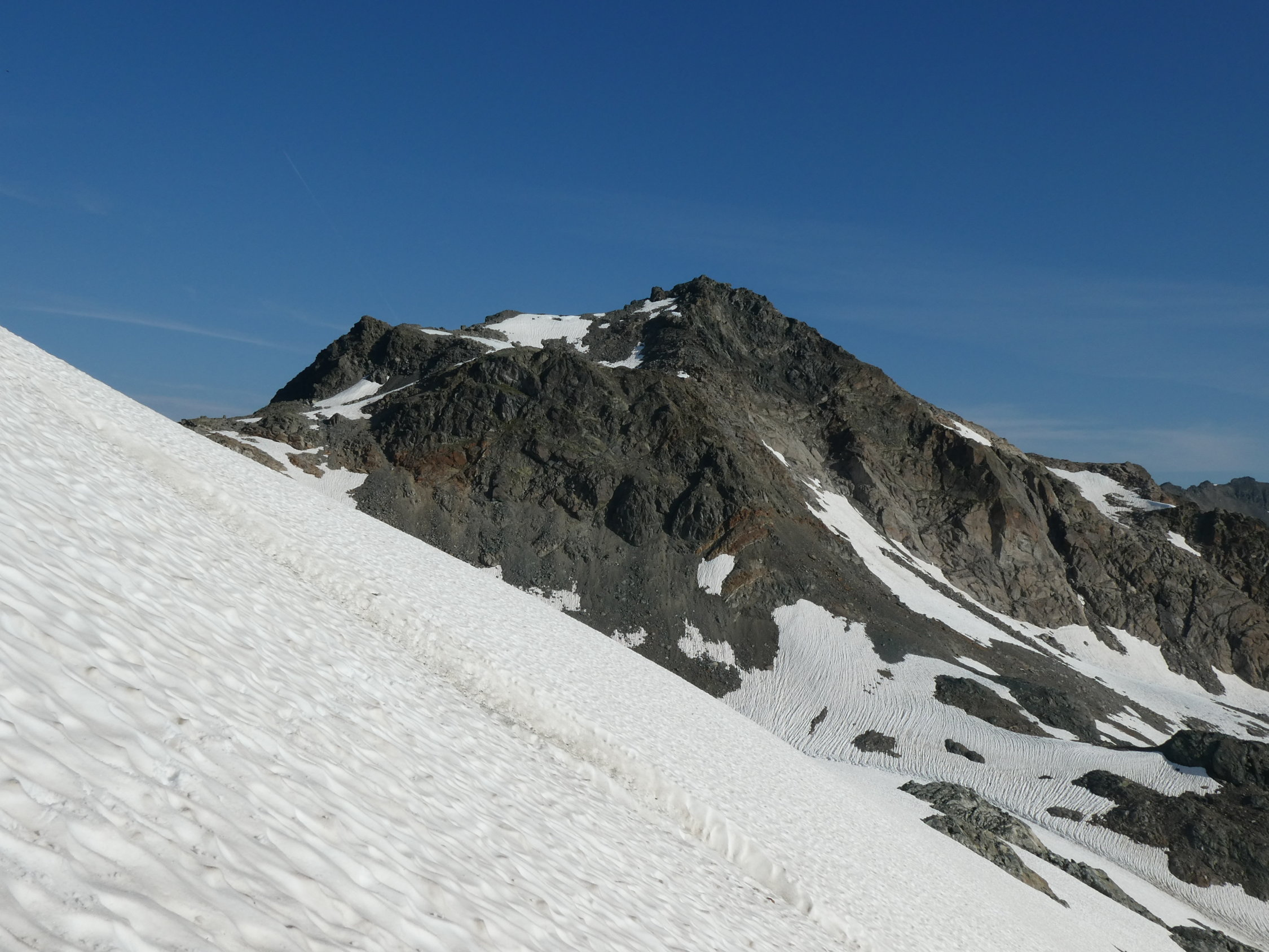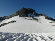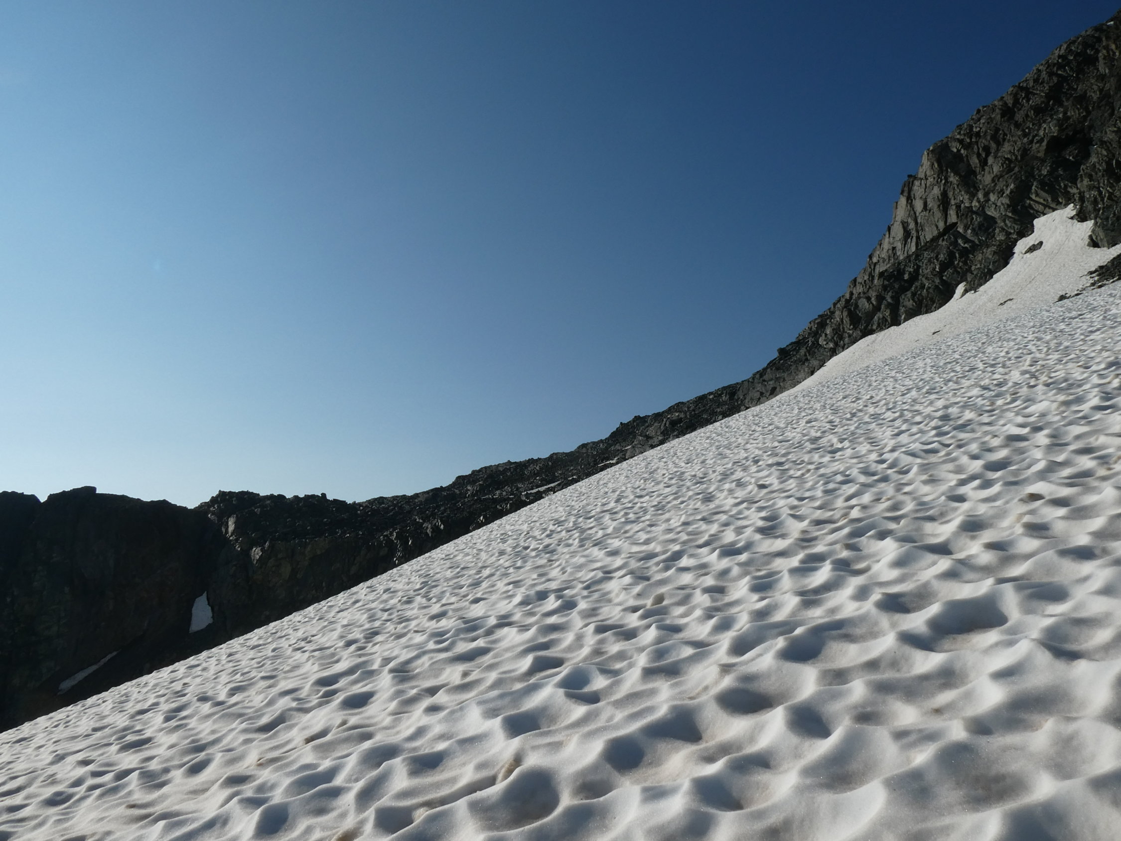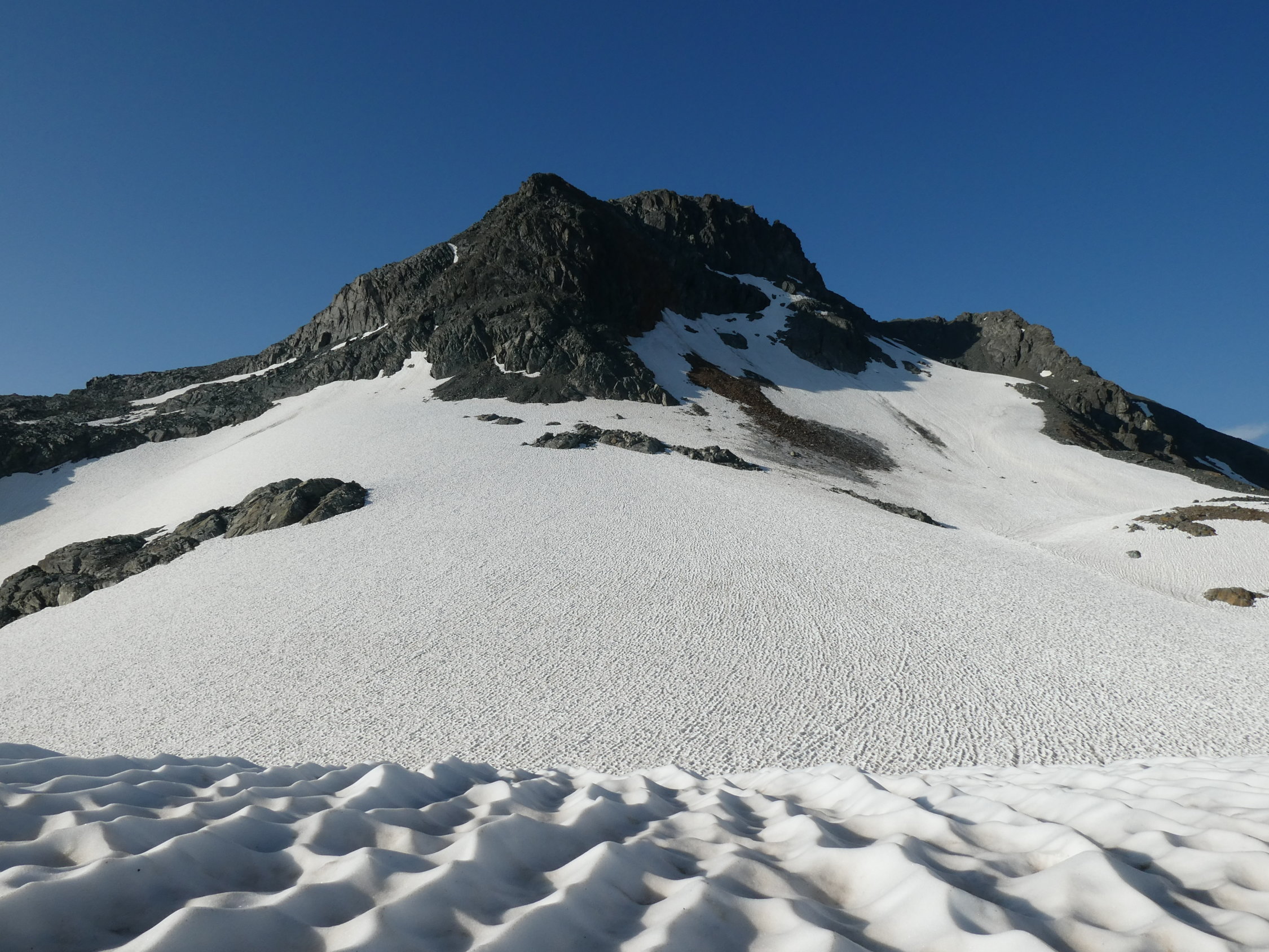 Im weglosen Aufstieg zum Gletscher liegen ebenfalls einige Schneefelder, die man aber auch umgehen kann. Beim Nordende des Gletschers liegt immernoch durchgehend Schnee.