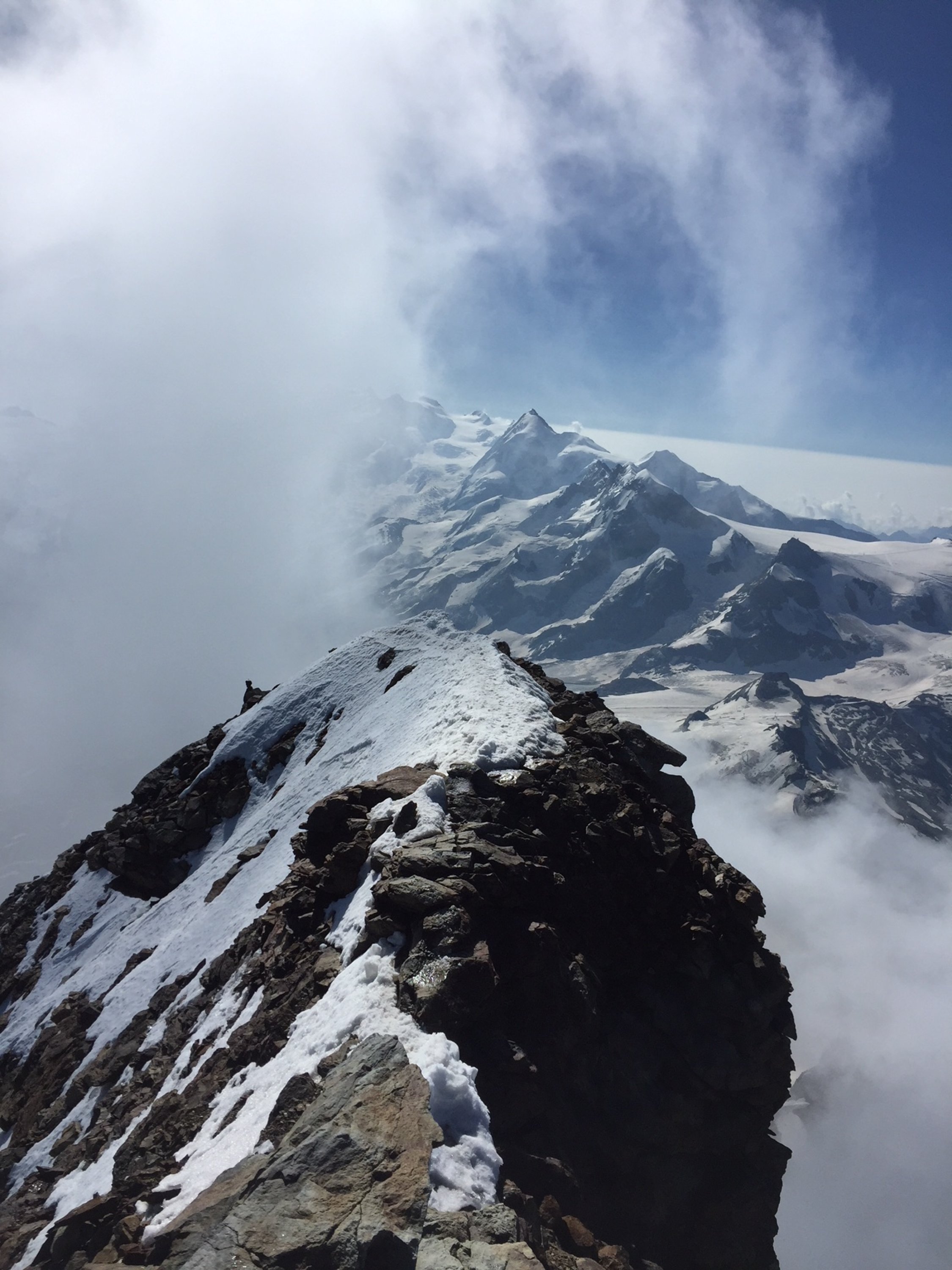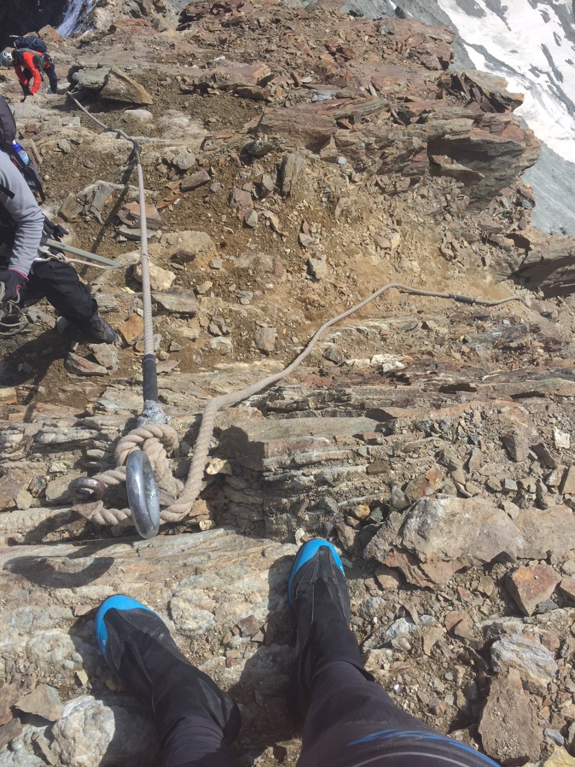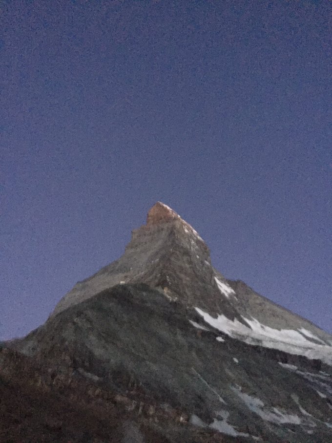 Wir sind in der Nacht von Randa mit dem Rad gestartet, nach Zermatt gefahren und von dort aus weiter zur Hörnlihütte gelaufen, welche wir um 5:50 erreichten. Die Wegfindung nach der Hütte gestaltete sich schwierig und wir haben uns ab und zu mal verstiegen. Steigeisen und Pickel helfen ab dem oberem Dach. Die Verhältnisse an sich waren sehr gut, doch leider haben wir miterlebt, wie oberhalb der Schulter ein Fels indem eine Sicherungsstange steckte, zersprang und dadurch Bergsteiger in die Ostwand stürzten.