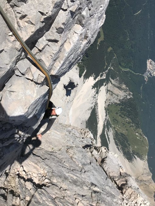 Route absolut trocken, aber Vorsicht: Die ersten 10 Seillängen täuschen mit festem Gestein und guter Absicherung,im oberen Teil ist das Gestein grundlegend brüchig und die silberfarbenen Bolts sind soweit auseinander, dass man sie nur schwer findet. Außerdem besteht die 19. Seillänge aus drei Längen, wobei man vollkommen ohne Bolts auskommen muß. Das ist ein krasser Stilbruch im Vergleich zum ersten Teil. Mehrere absurde Runouts in heiklem Gelände würzen das Unternehmen. In der letzten Länge gibt es im unteren brüchigen 6.Grad einen besonders blöden Runout. Insgesamt eine alpinistische Unternehmung, wobei alle, die in den ersten Längen denken es wäre brüchig oder schlecht abgesichert, sofort umdrehen sollten. Angesichts der Brüchigkeit der Route, sollte nur eine Seilschacht pro Tag einsteigen. Die Gefahr der Überfüllung besteht eh nicht: wir waren in 13 Jahren, seit Bestehen der Tour, etwa die 50. Seilschaft.