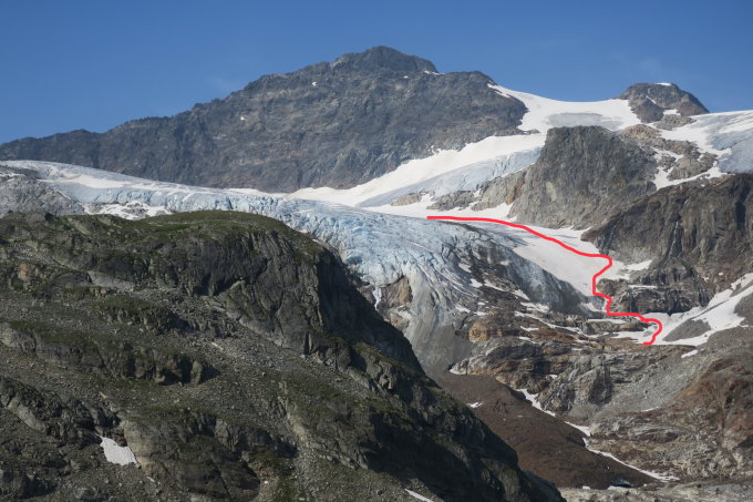 Noch hat es einen ca 3m breiten Schneestreifen (siehe Bild 1 und 2)beim Ochsentaler Gletscher um ohne direkten Eiskontakt hoch zu kommen. .