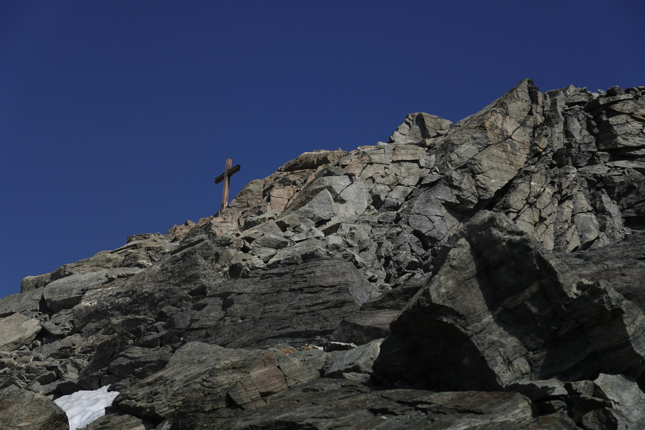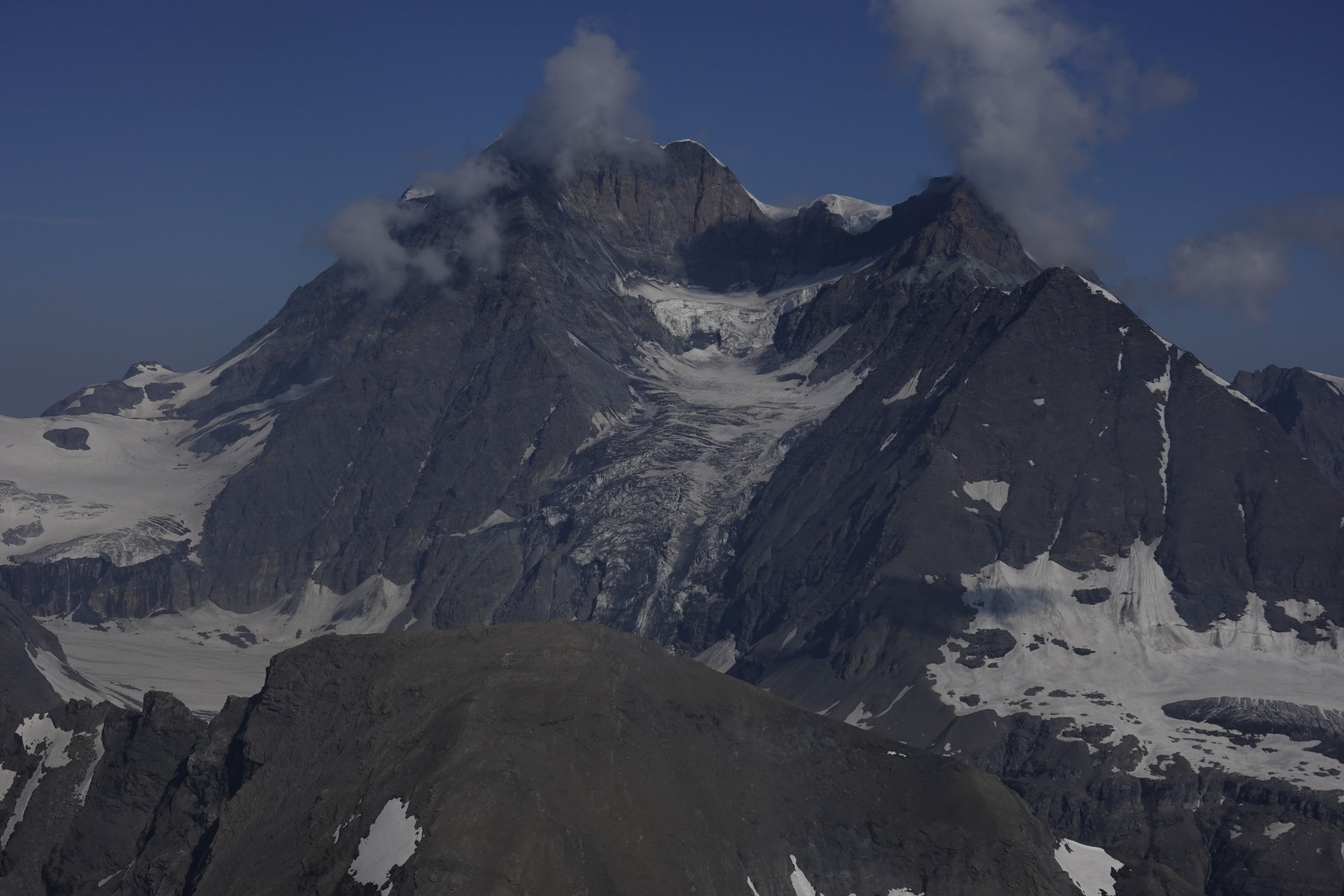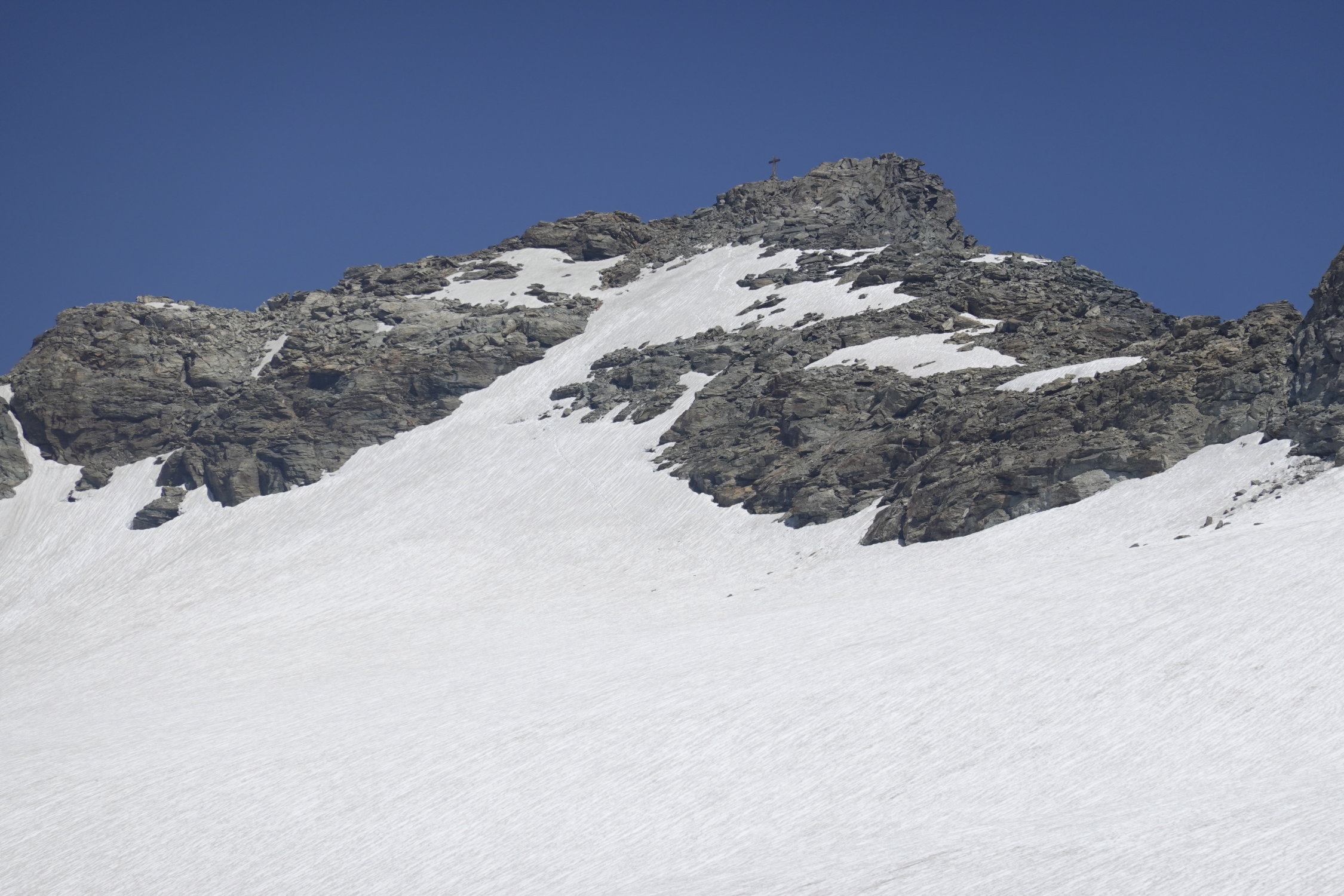 Beste Bedingungen. Route sehr gut markiert bis zum Glacier du Mont Gelé, der in seinem auf dieser Route begangenen oberen Teil noch sehr gut schneebedeckt ist. Man macht derzeit keine Begegnung mit Spalten (die es auf diesem Gletscher durchaus hat, wie ich von einer früheren Begehung weiss). Bleibt man so lange wie möglich auf dem Firn, hat es fast zuoberst einen kleinen Bergschrund, der sich aber im Westen gut überschreiten lässt. Man kann aber auch früher in die gestuften, leichten Gipfelfelsen wechseln.