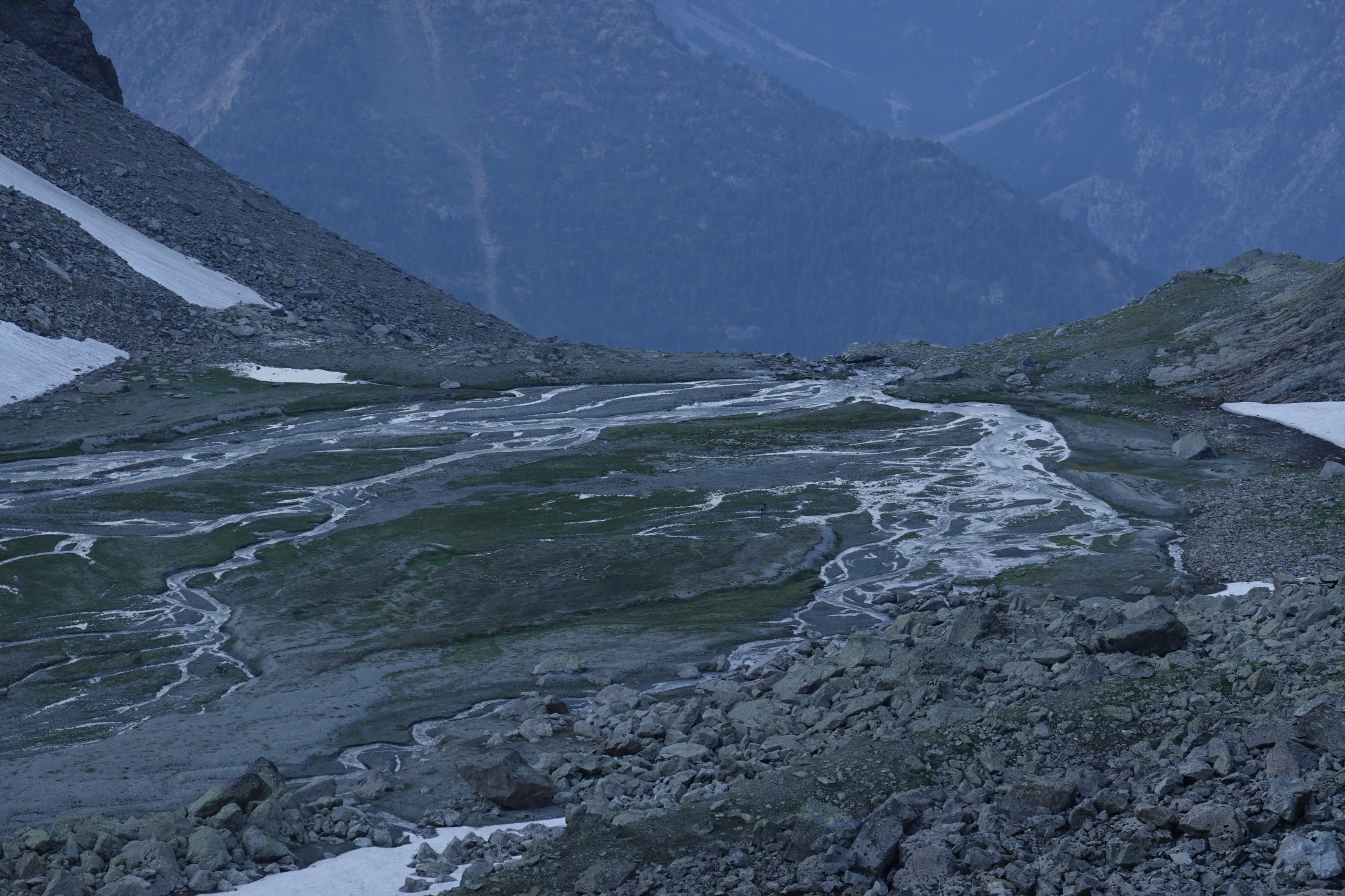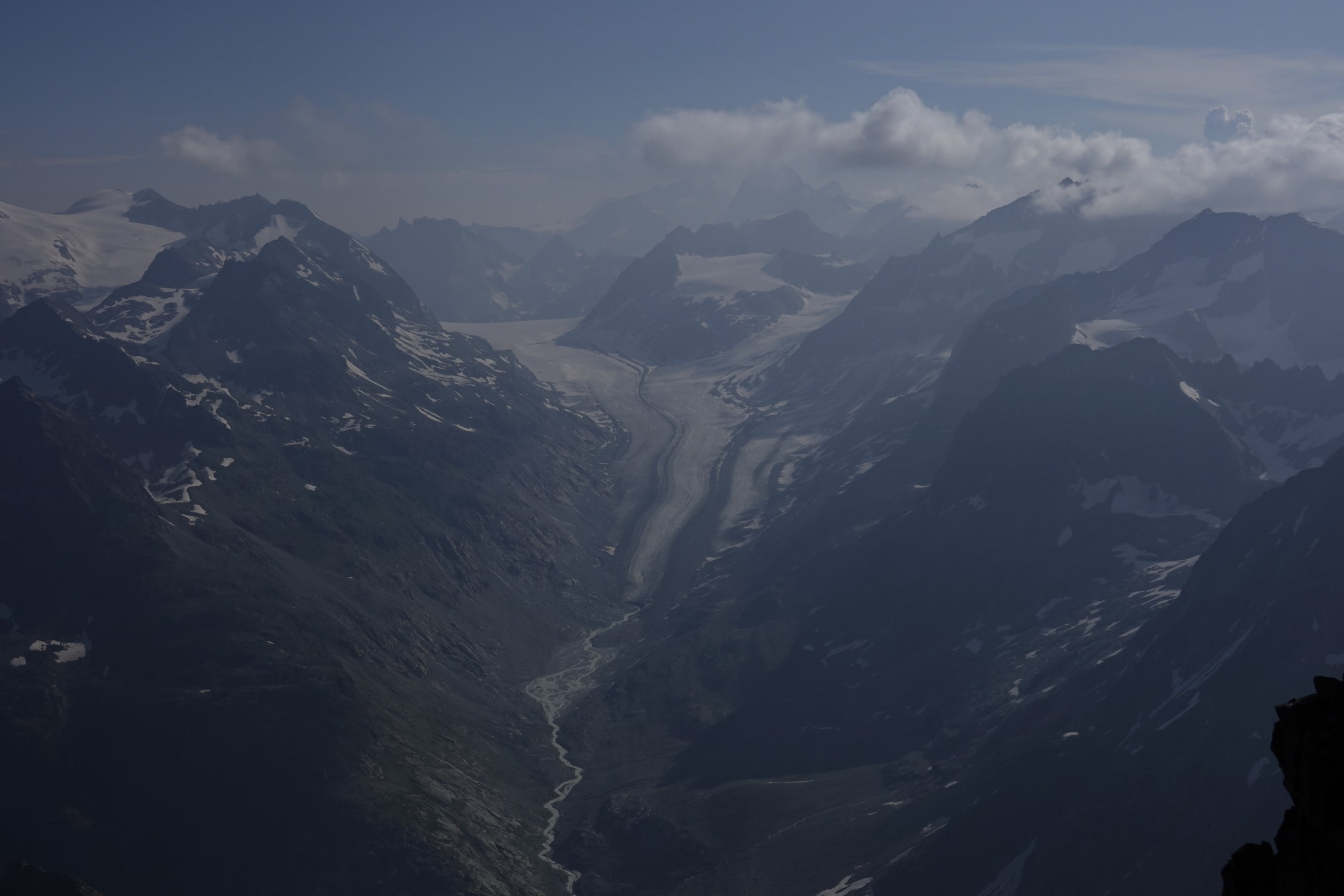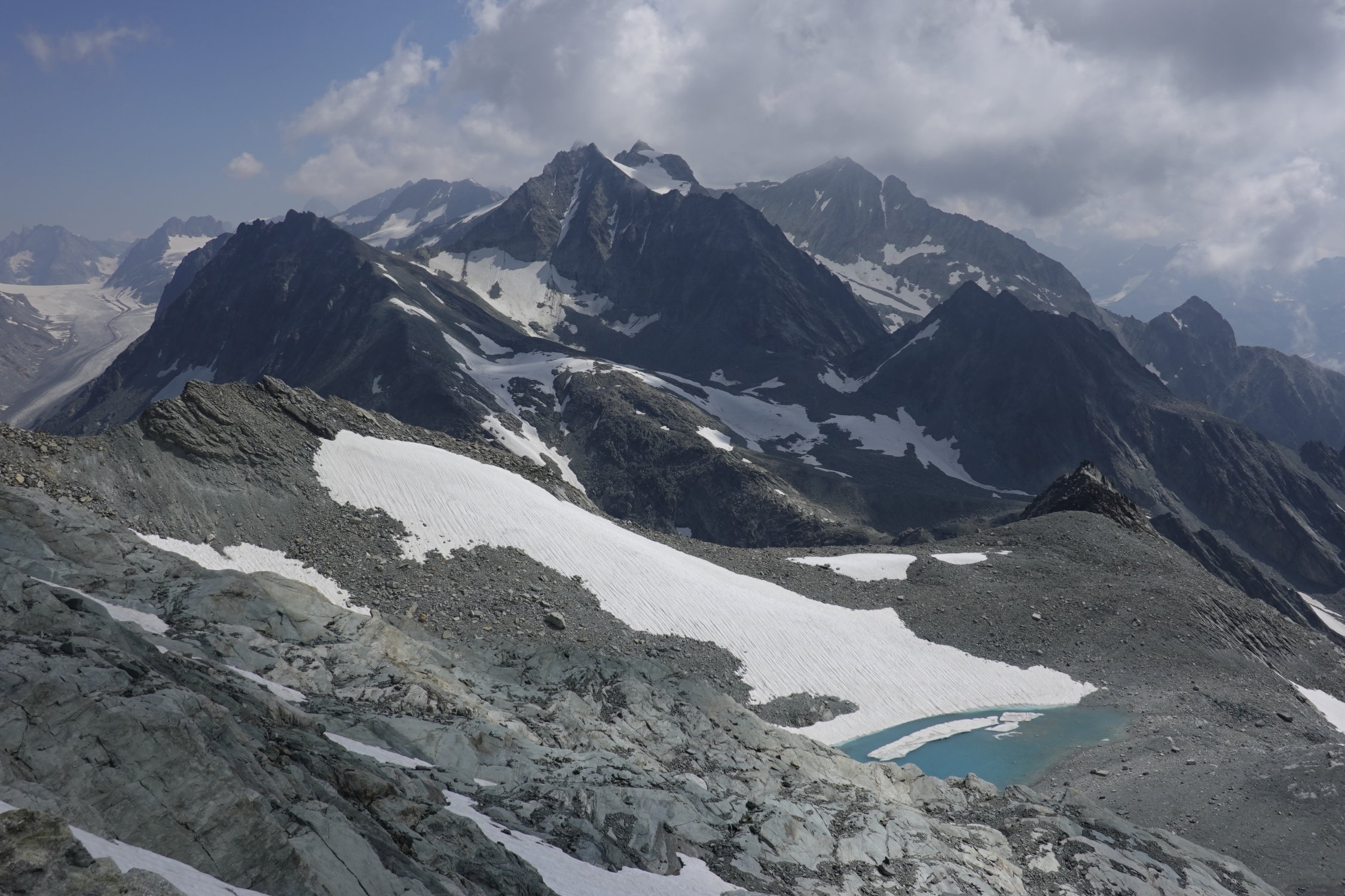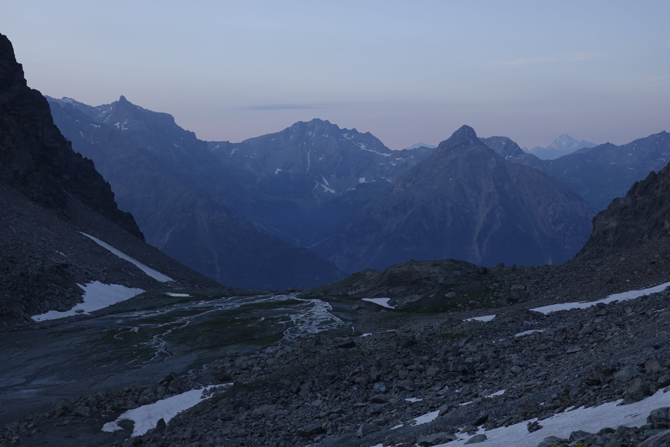 Danke an Martin für die angenehme Begleitung auf dieser hübschen Valpelline-Tourenwoche (anderer Gipfeleintrag vom 22. Juli: Pointe Marcel Kurz), die sich dank wenig gefährlicher Gletscher bestens für eine Zweiergruppe eignet: Arolla - Col Collon - Pointe Marcel Kurz - Rif. Nacamuli - Prarayer - Tageswanderung durch ein wunderbar wildes Tal zum gastfreundlichen Rifugio Aosta und zurück - Place Moulin - Rif. Crête Sèche - Mont Gelé - Cabane Chanrion - Mauvoisin. Wir haben die erste Nacht im Refuge des Bouquetins verbracht (gemütliches Selbstversorgerhüttchen, aber etwas abseits vom Aufstieg zum Col Collon).