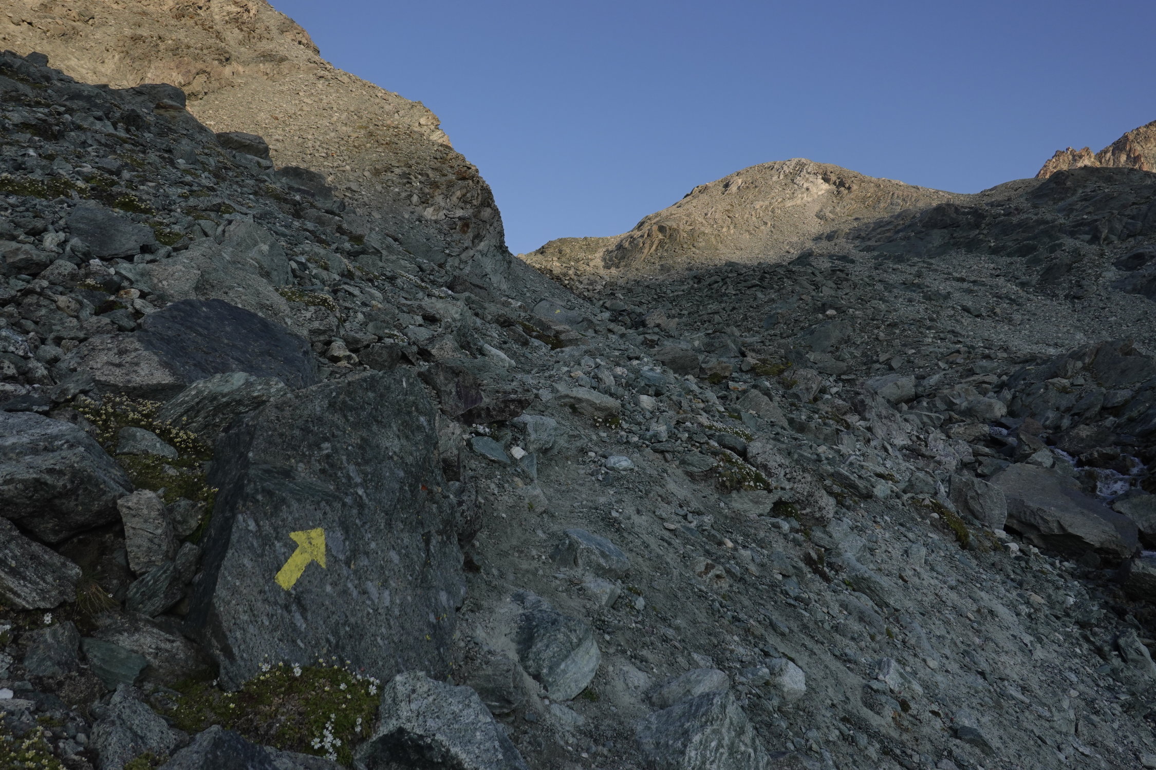 Abstieg vom Mont Gelé zur Cabane de Chanrion vom Col d' Ayace über steile, mühsame Schuttfelder. Geht im Abstieg recht gut, einen Aufstieg würde ich hier aber nicht machen wollen ...