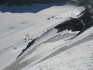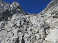 Monte Cristallo: Höchstens "machbar". Nur bis zur Hälfte der Route geschafft, obwohl Lifte benutzt um Kraft zu sparen. Niemand sonst unterwegs. Für ca. 50 hM mehrere Stunden gebraucht trotz frühen Aufbruch mit erster Bahn um 06:30 Uhr. Skitourenschuhe mit Steigeisen war Herausforderung und bei der ersten Kraxelwand (IIer-Stelle ??) umgekehrt. Auch das Personal sagte: "Adesso non è buono per il Cristallo. Troppo caldo..". Zu warm. Steine waren dementsprechend wacklig und Schnee viel zu weich oder nicht-existent (Blankeis).