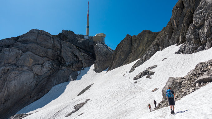 Perfektes Wanderwetter, angenehme Temperaturen und nicht mehr so dunstig wie bei der Hitzewelle letzte Woche. Beim Abstieg vom Säntis bis zur Höchnideri sind noch grosse Schneefelder zu queren. Sonst alles trocken. Alle exponierten Passagen sind mit Drahtseilen gesichert.