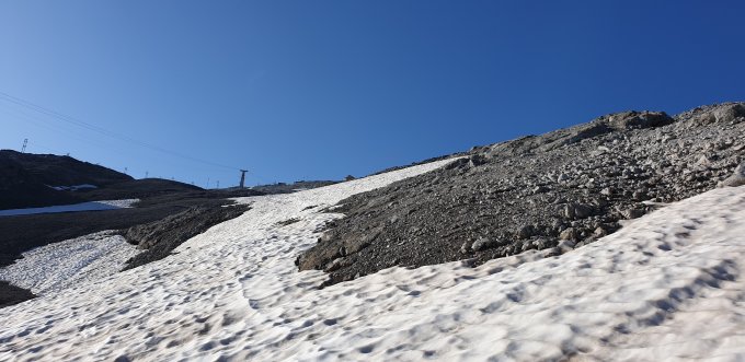 Start der Tour am 7.45 Uhr beim Stilfser Joch , das Wetter schön aber sehr kalt für den Hochsommer, schon nach wenigen Minuten konnten die Ski montiert werden, dann aber 3-4 mal tragen bis zum Ortlerhaus, dann Schnee bis Gipfelhang, leider kamen bald mit dem kalten Nordwind Nebelschwaden von Süden her, nach kurzen Abstecher entlang des Grates nach Süden zur Punta del Cristallo, gings nach der Abfahrt noch zur Punta del Naso (Naglerspitze), dort war der Schlussaufstieg auch aper, nach dem Ortlerhaus ist man schon sehr nahe beim nächsten Gipfelziel dem Monte Scorluzzo ,
