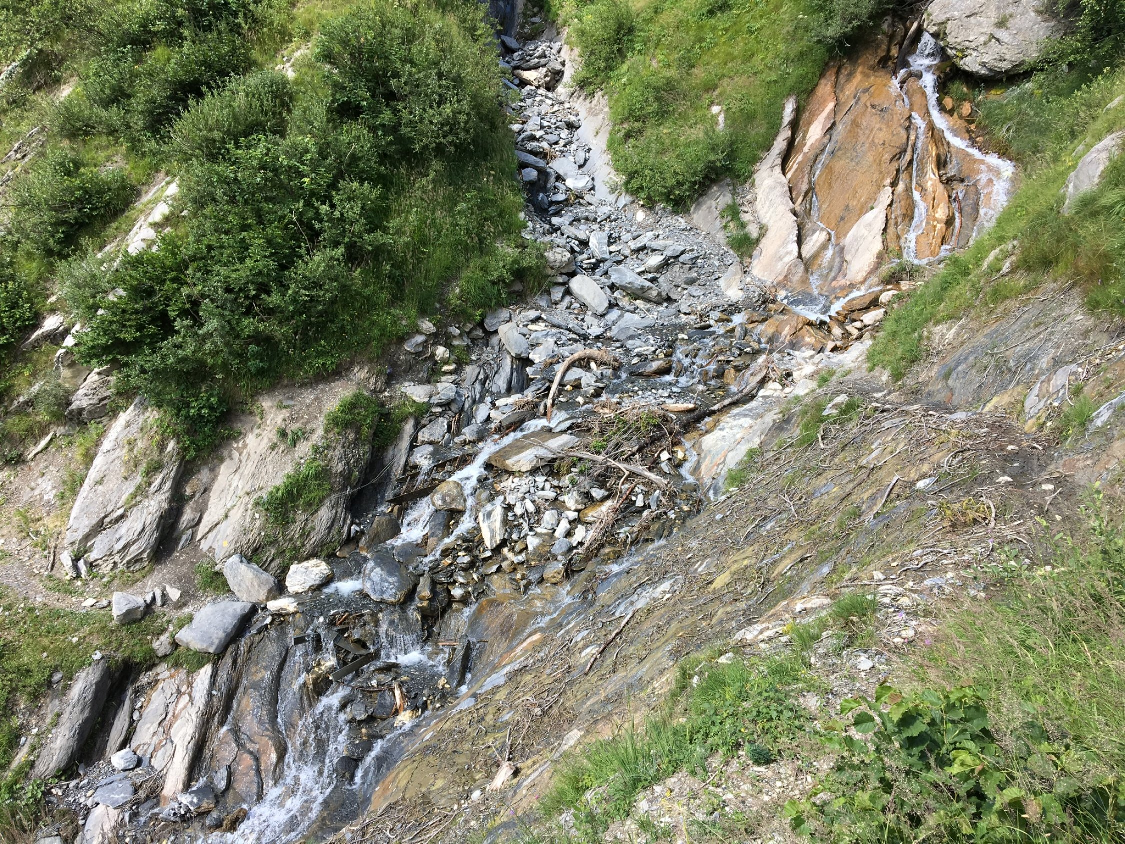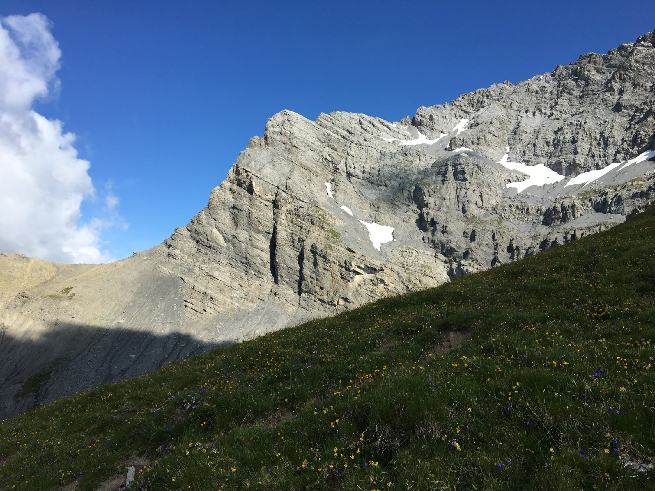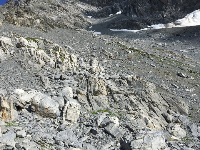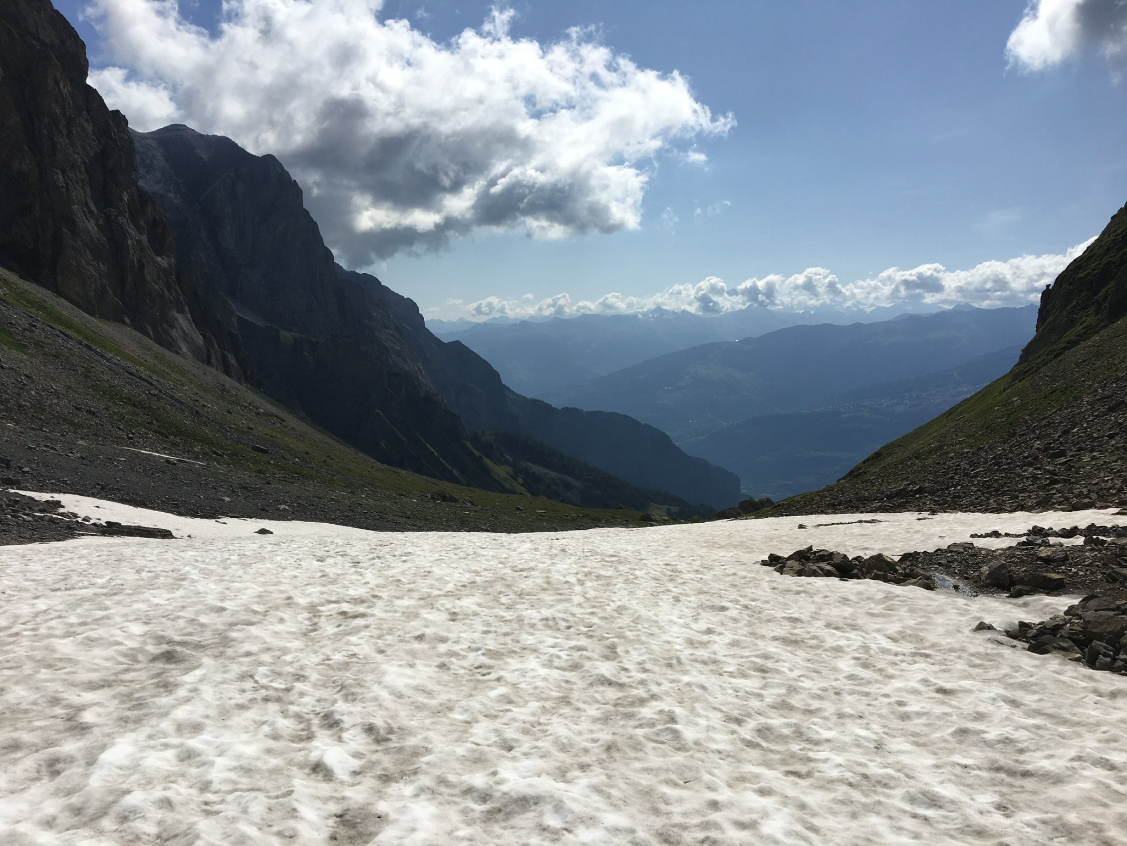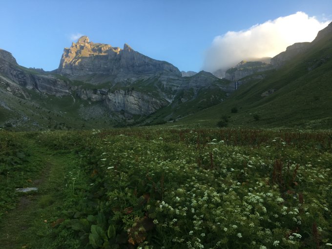 Start um 6:30 am Ortsausgang Ovronnaz (Telesiège, 1334m) bei angenehmen 12 Grad. Weg über Saille aper, Südwand trocken, Abstieg zur Alp Chamontsee im Bereich Les Outannes bequem über ausgedehnte Firnfelder. Brücke über Grand Tséné ist zerstört, provisorisch mit Stahlseilen gesichert, ggf. hilfreich, wenn Bach nach starken Regenfällen viel Wasser führt.