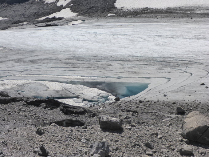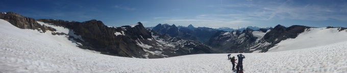 Gletscher noch recht gut eingeschneit. Praktisch keine Spalten. Schnee gut verfirnt. Man sinkt auch am Mittag nur wenig ein.