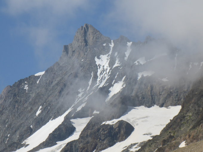 In die Steigeisen bei etwa 3200m. Dank kalter Nacht noch recht harter Schnee bis zum Sattel, nicht wirklich Trittschnee. Am Schneesattel um 09:00. Querung links um das erste Türmchen ein bißchen bröselig, aber trocken und unschwierig. Restlicher Grat blitzsauber, schneefrei und trocken, daher kam nur im Aufstieg mal kurz Sicherungsbedürfnis auf, den Rest gingen wir frei. Am Gipfel um 10:30, zurück am Schneesattel um 12:00. Dort dann schon etwas weicher, aber guter Trittschnee für den Abstieg.
