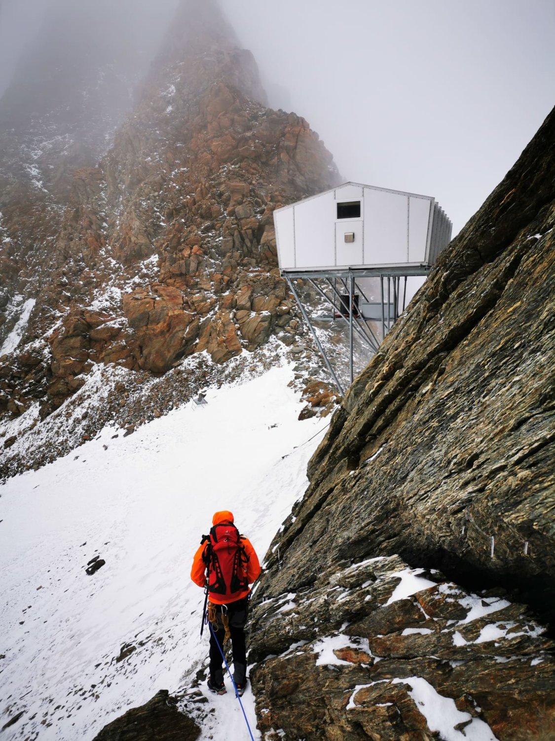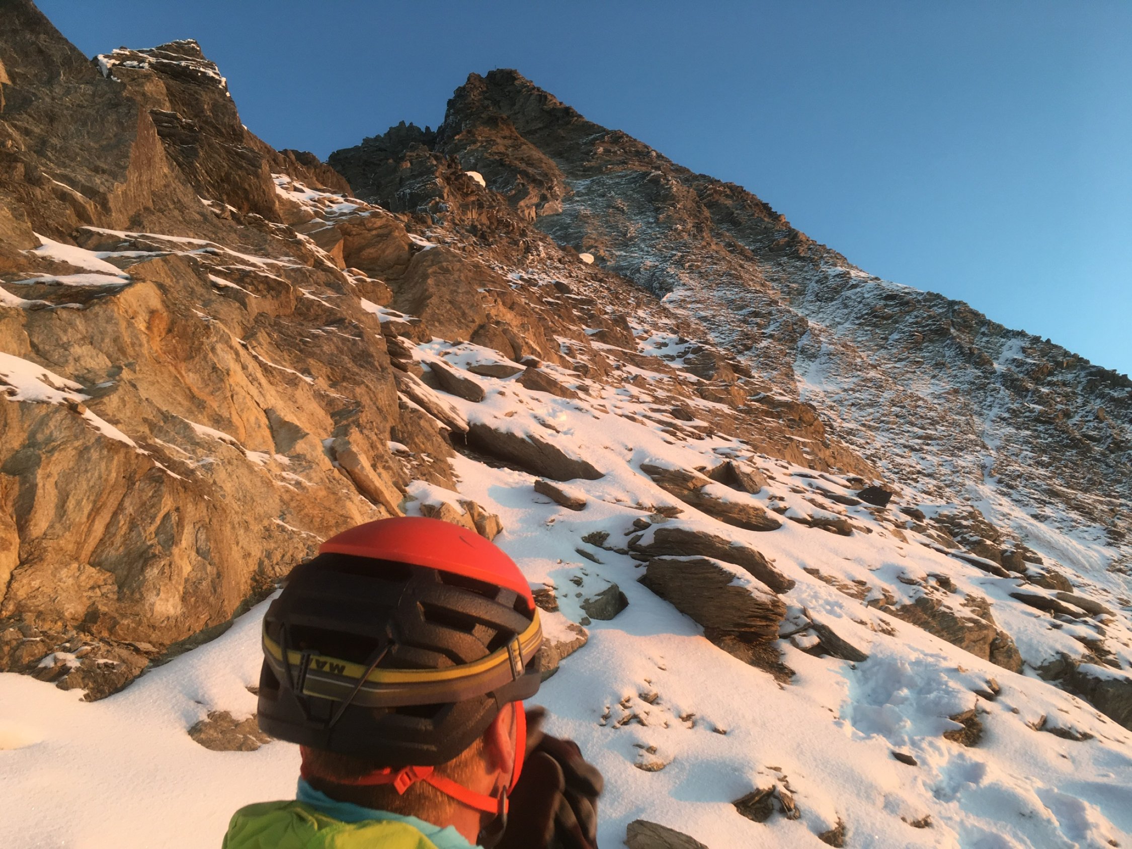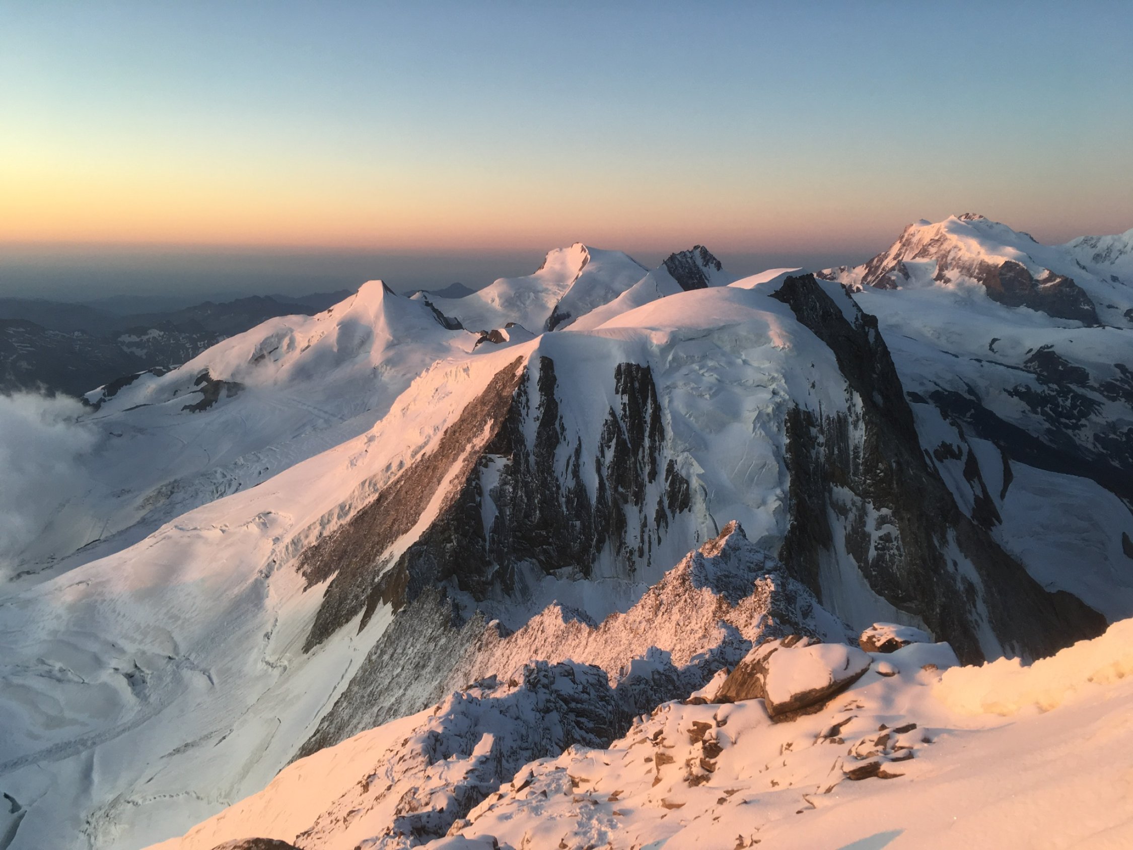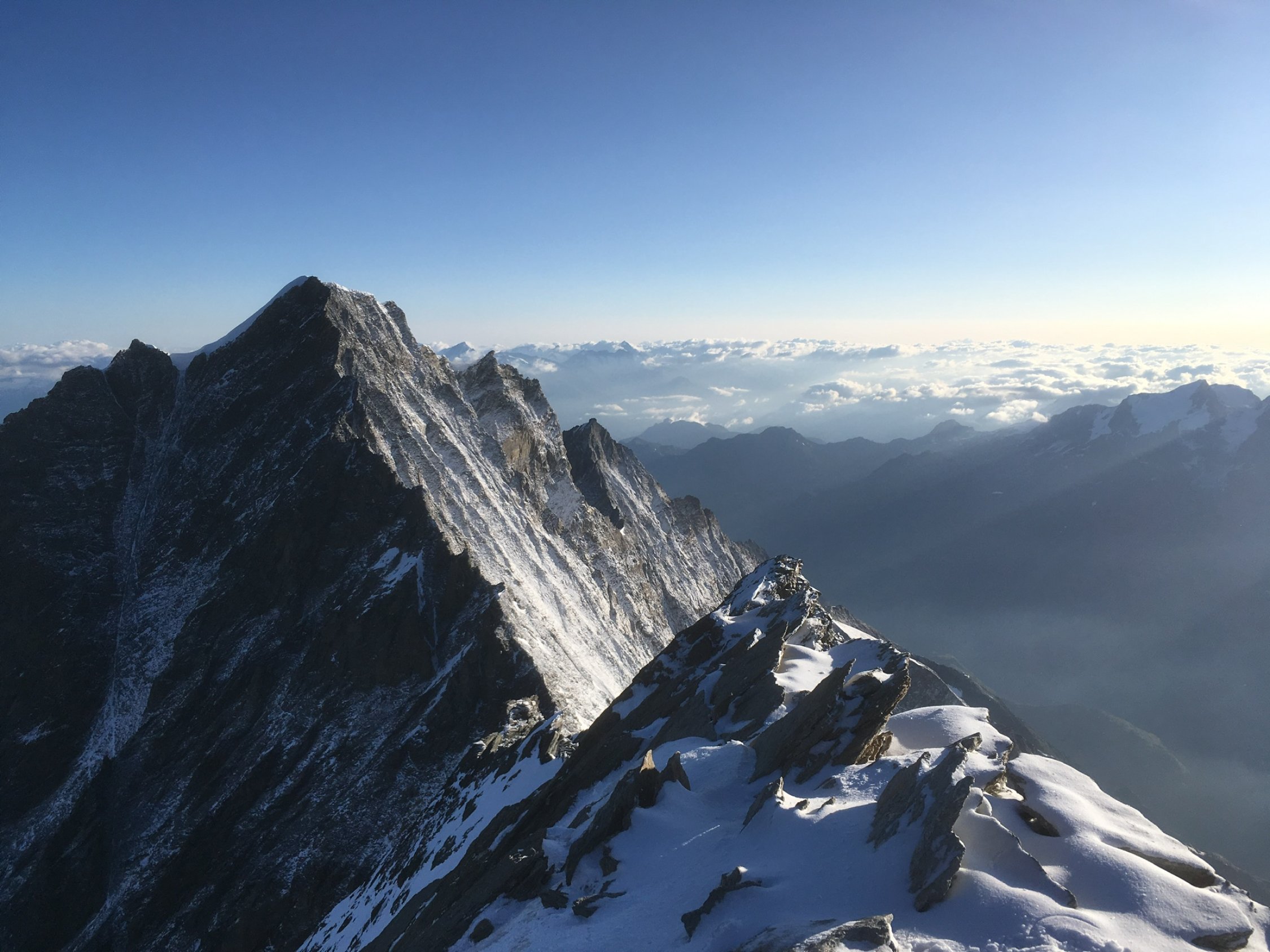 Die Gewitterfront hat den ganzen Grat mit Neuschnee eingedeckt. Wir sind nach einer stürmischen Nacht im Mischabeljochbiwak bei schönstem Wetter los. Die Tour erfolgte komplett mit Steigeisen. Am Gipfel entschieden wir, wie übrigens die anderen 2 Seilschaften auch, wieder zum Biwak abzusteigen. Der Weiterweg in Richtung Domjoch war uns bei diesen Verhältnissen zu heikel.