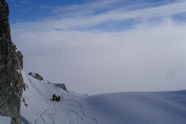 Entlang der Aufstiegsroute hatte es einen Deckel, in den Schattenhaengen hat es aber wunderbaren Tiefschnee, deshalb sind wir Richtung Bischofalp runter gefahren. War super Abfahrt.