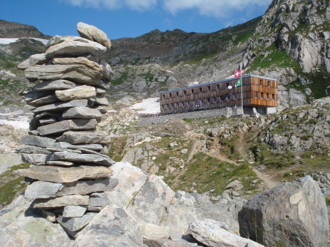 Aufstieg über kleine Schneefelder problemlos machbar. Anschliessend im Zick-Zack hoch. Eine Stunde reichen für den Aufstieg von der Hütte.
