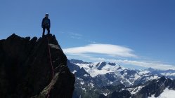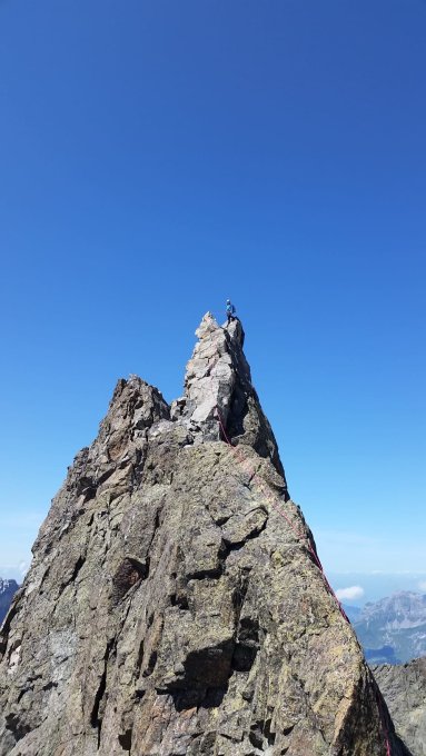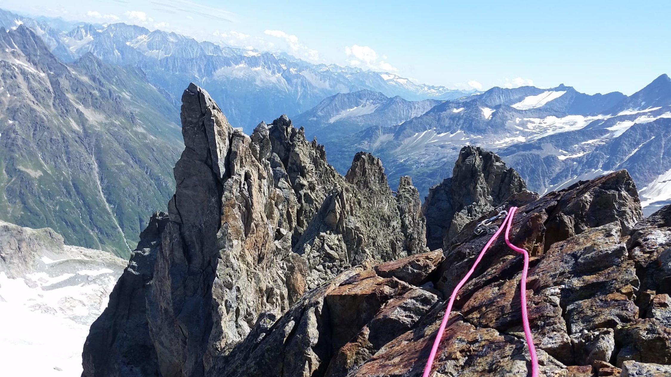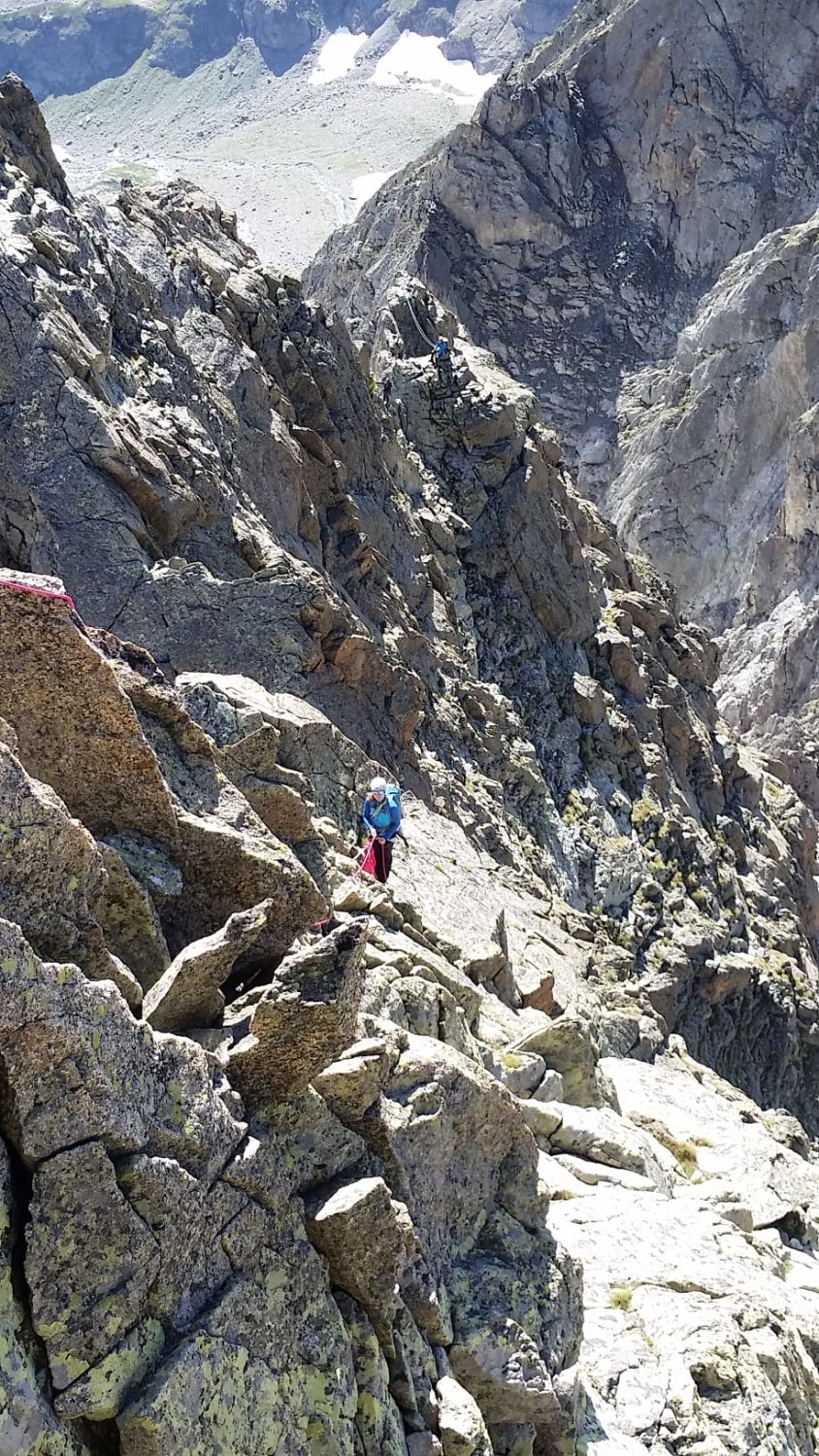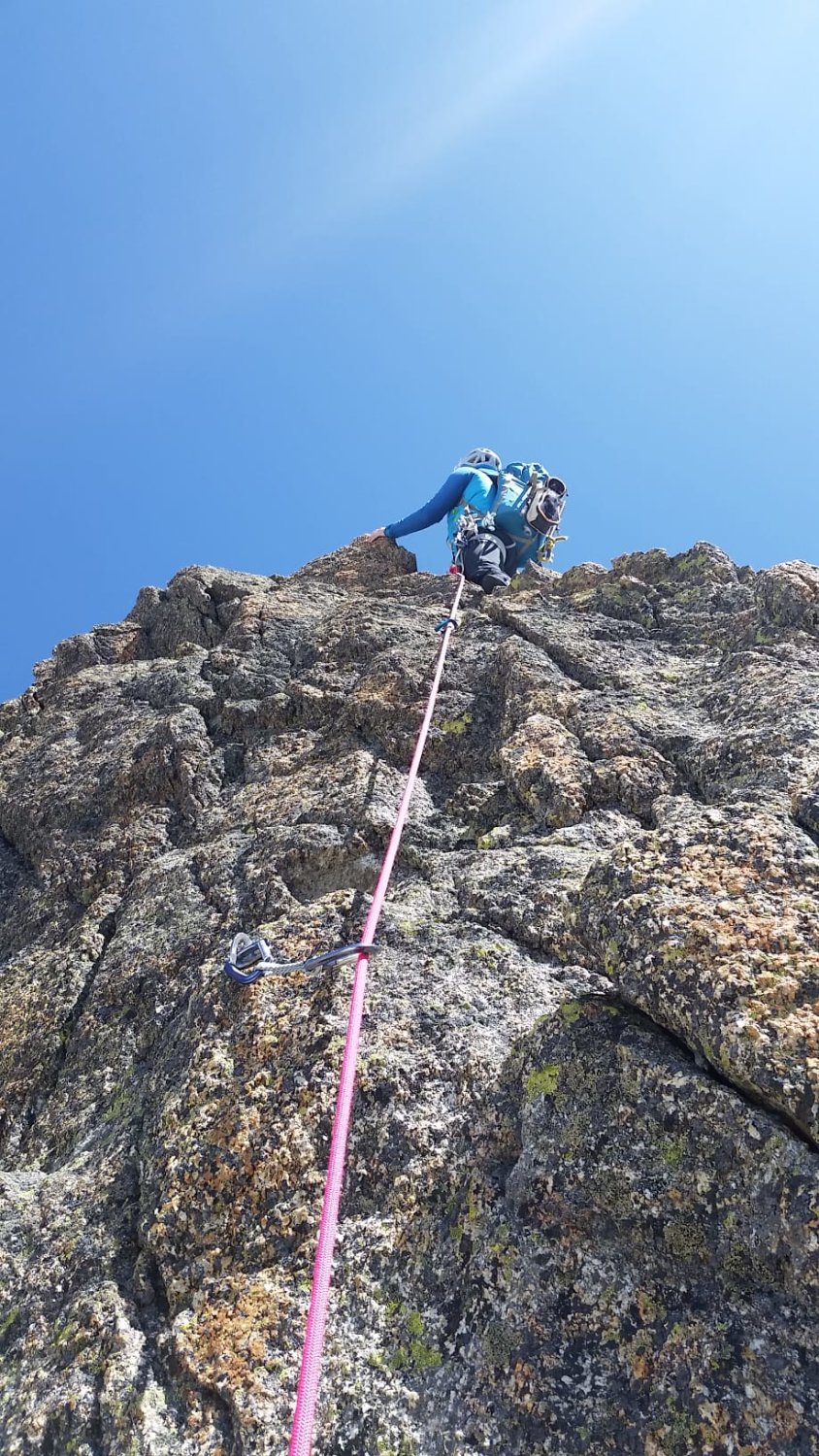 Super Gratkletterei, vor allem auf den Wichelplanggstock in bestem Granit und gut abgesichert. Die Schneefelder im Abstieg verlängern die Abstiegszeit doch etwas, da der Zugang am Bergschrund mittlerweile etwas mühsam ist. Dort Steigeisen und Eispickel notwendig! Der rote Punkt für den letzten Abseiler ist auf der anderen Seite eines kl. Baches- das hat uns ein wenig Zeit gekostet zu finden ( Foto) .