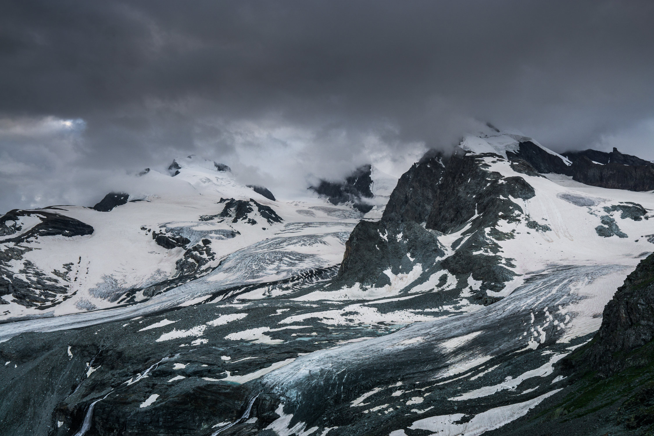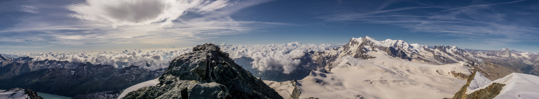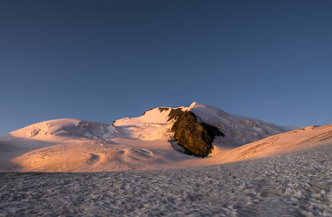 Hohlaubgletscher ab ca. 2950m mit dünner Schneeauflage. Es erschien hier besser über den aperen Teil des Gletschers direkt auf den Sattel zuzugehen (wenige Spalten und gut zu sehen). Anschließend über die nachts gut gefroerene Schneeauflage dem Allalingletscher folgend bis zum Adlerpass und anschließend auf den Gipfel.