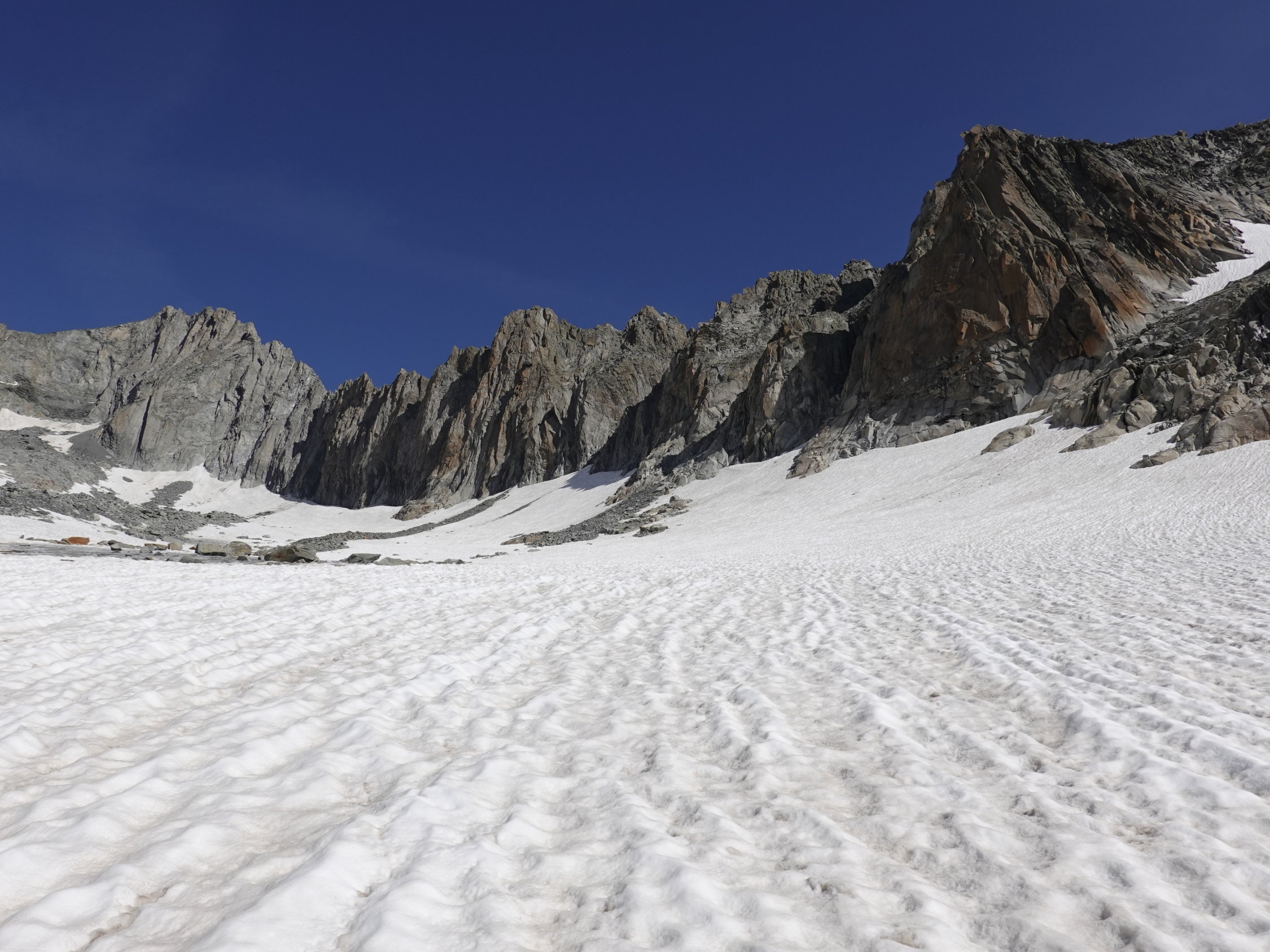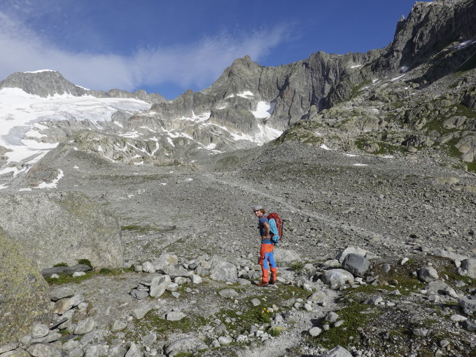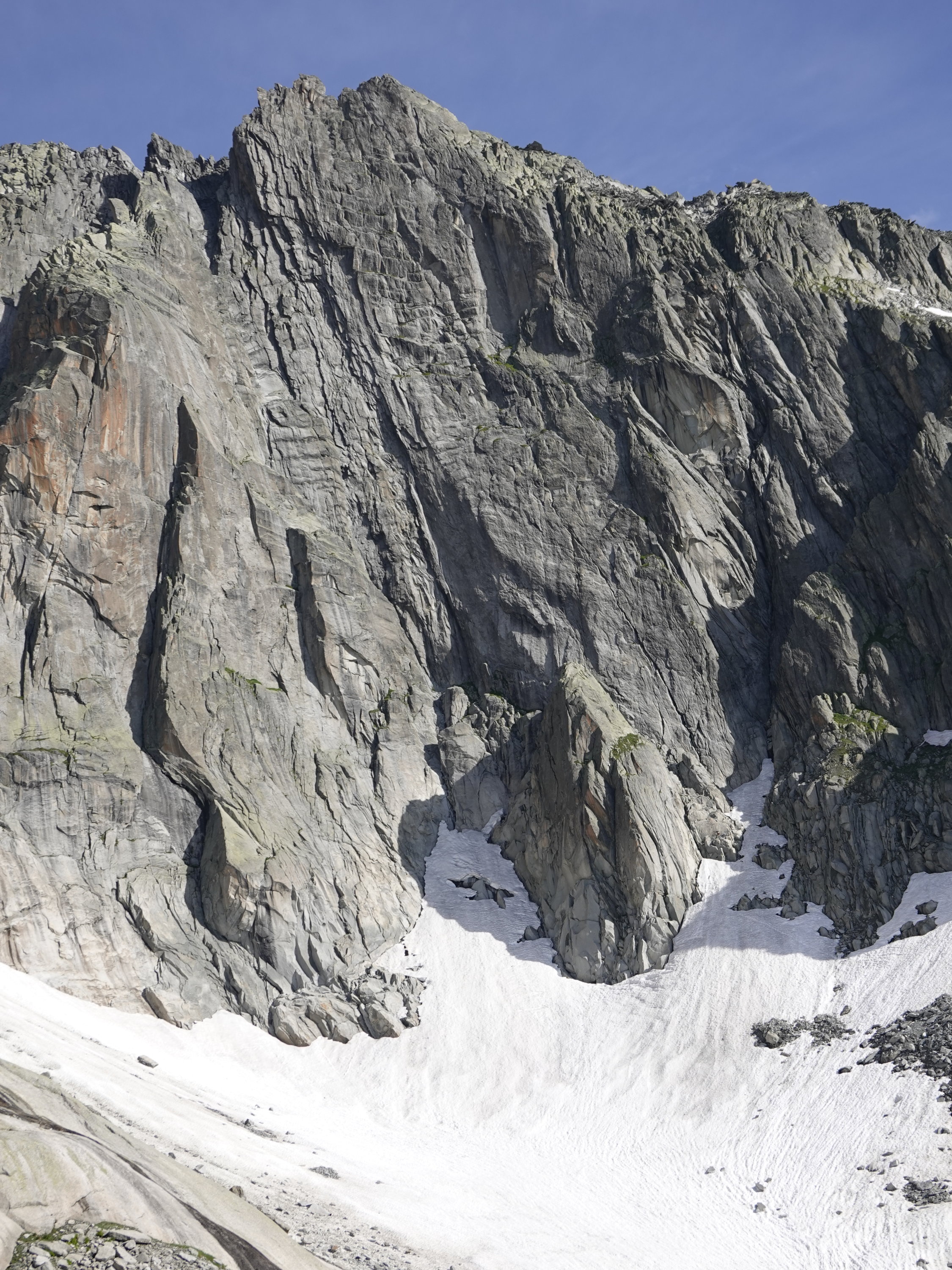 Zustieg auf dem Tiefengletscher problemlos. Erste Stellen Blankeis, die aber umgangen werden können. Ein Pickel war für die steile Flanke unter dem Wandfuss trotzdem hilfreich. Die Randkluft war kaum breiter als 30cm.