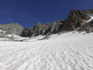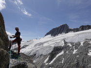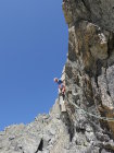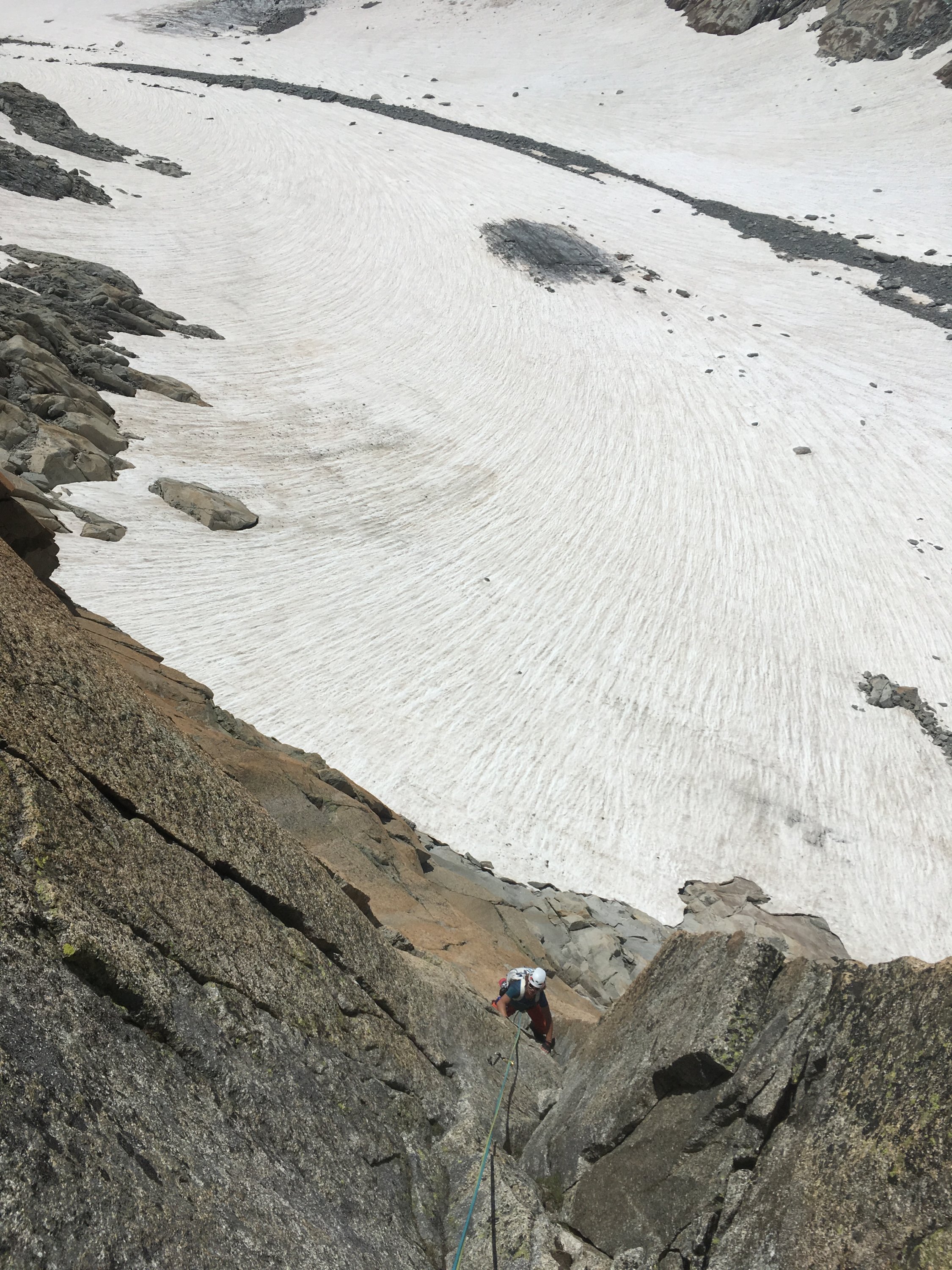 Beim Abseilen mit 60er Seilen sollte man höchstens R3 (vor der Verschneidung) auslassen. Wir hatten auch noch R5 (auf dem Band bei der Quarzader) ausgelassen und das Seil nur mit ach und Krach abgezogen bekommen. Und mit 60m Halbseilen reicht es von R2 gerade nicht bis auf den Gletscher.
