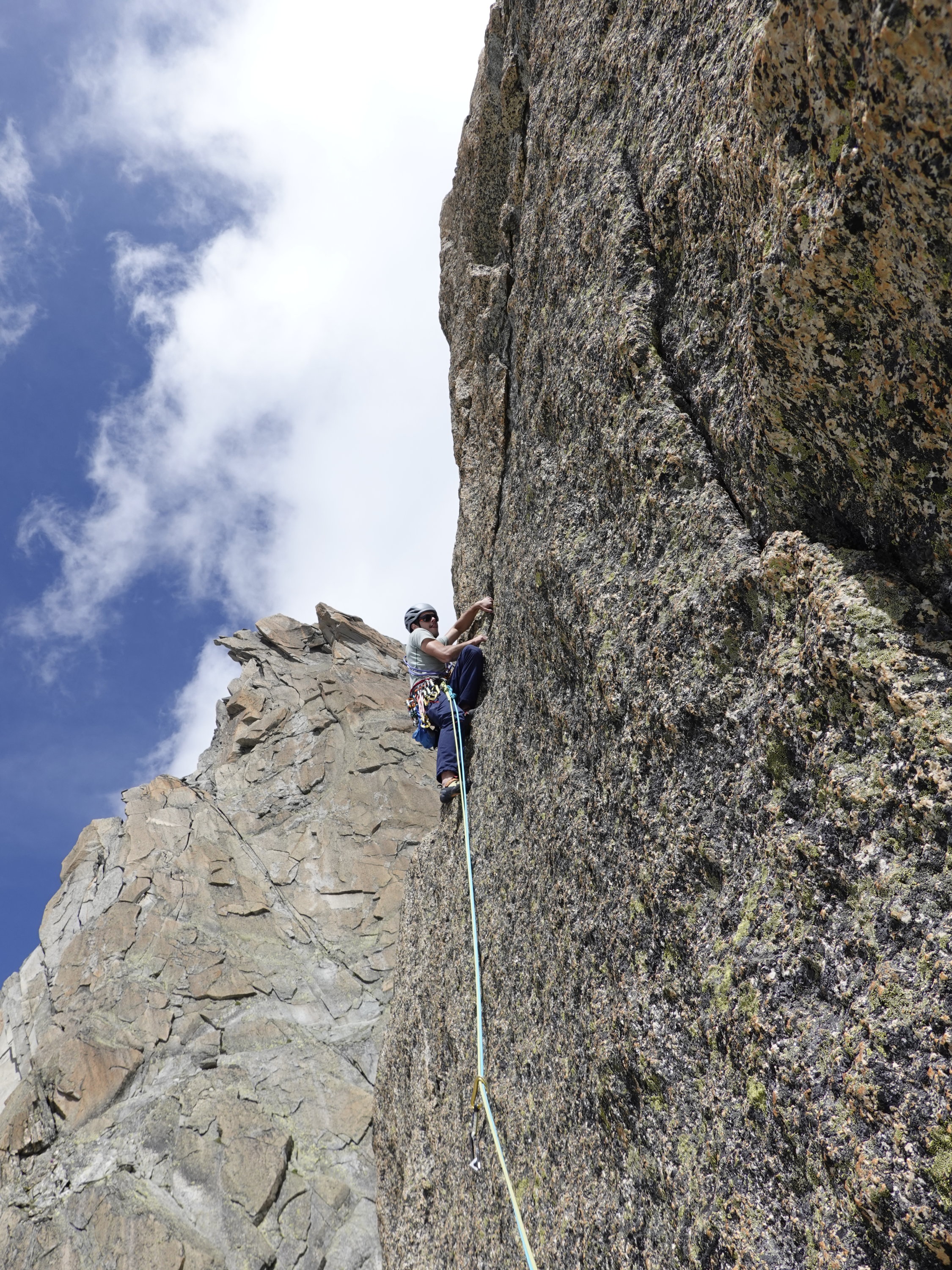 Die Route wurde mit einigen zusätzlichen Bohrhaken ergänzt. Auch die Einstiegsseillänge auf den Gletscherschliffplatten hat nun ein paar BH bekommen. Ein kleines Rack Friends (0.3-2) macht trotzdem noch Sinn. Leider wurden die alten Plättli nicht ersetzt. Das sind noch solche mit einer kleinen Bohrung, bei denen sich der Karabiner gerne verklemmt und deshalb bei einem Sturz ungünstig belastet werden könnte.