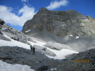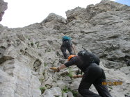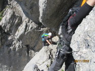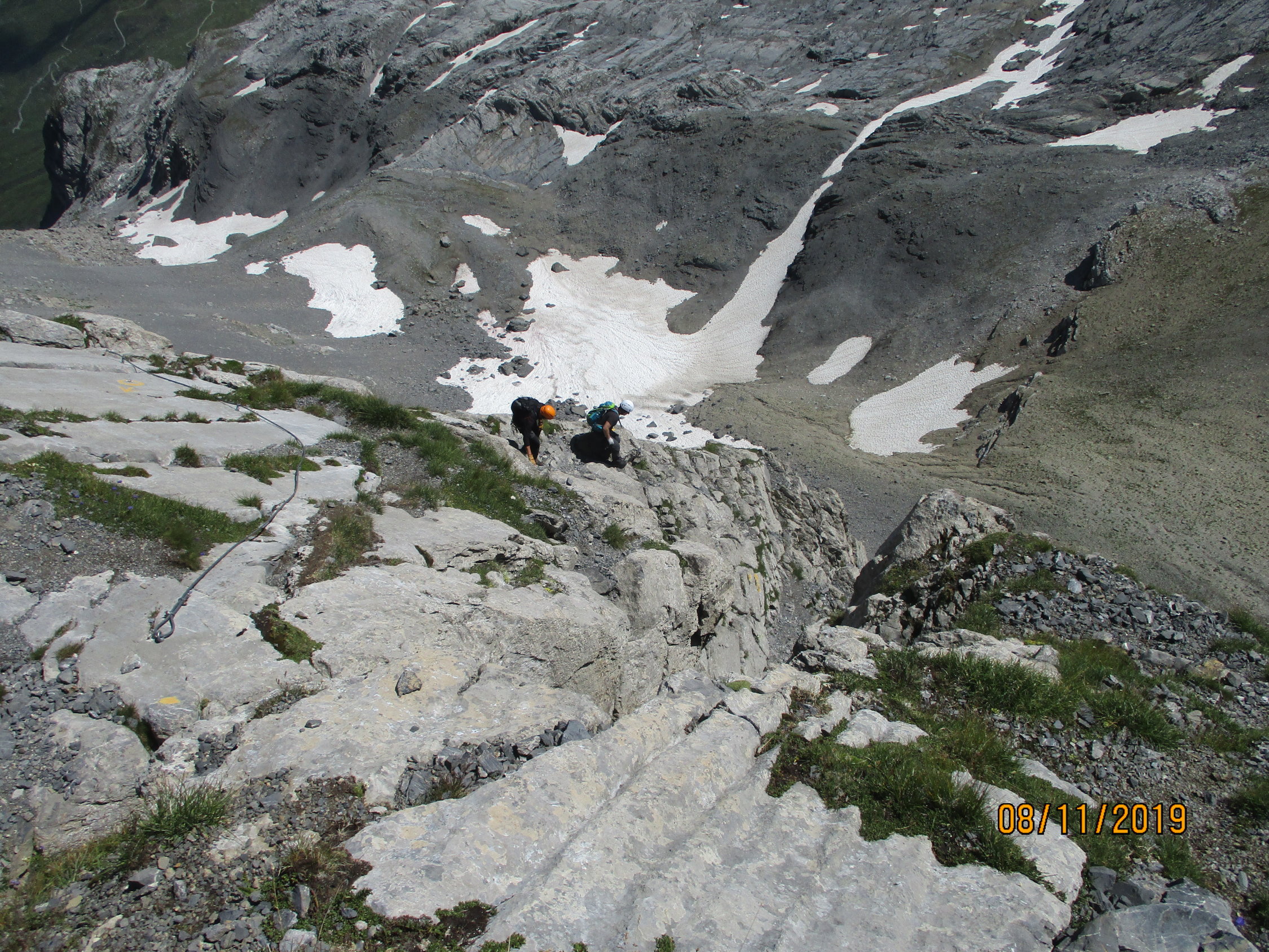 Je nach Exposition fanden wir uns von einem mitunter recht heftigen Südwind umtost. Ansonsten war´s perfekt. Außer den Wanderschuhen und Steinschlaghelm haben wir keine weiteren Hilfsmittel mehr gebraucht. Klettergurt mit Bandschlinge(n) zum zwischendurch mal sichern ist dennoch empfehlenswert. Es befinden sich auch Bohrhaken in der Route. Ob ein Seil eingesetzt wird, muss selbst entschieden werden (T5, II). Allerdings erhöht das gemeinsame Gehen am Seil auch die Steinschlaggefahr. Die Bewertung T6, die sich mehrheitlich in älteren Tourenberichten findet, ist nach meinem Dafürhalten zu hoch gegriffen, auch wenn man sich die neu in der Route angebrachten Stahlseile wegdenkt.