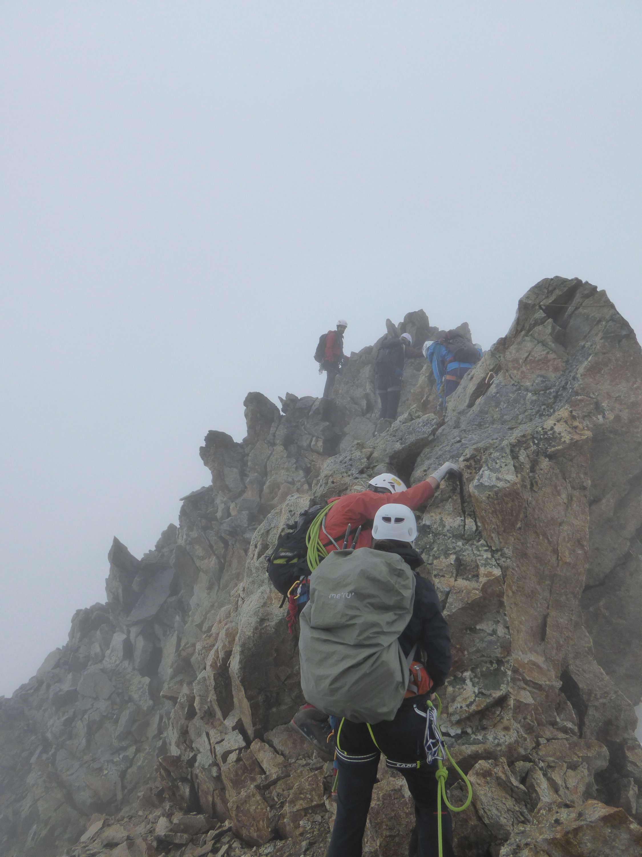 Dank Tipp von Teddy dem Gauli-Bergführer und Hüttenwart stiegen wir nicht auf das Joch hoch, sondern querten auf ca. 3160m nach rechts in die Felsen um von dort auf den Ostgrat, der dann in den SE-Grat mündet, zum Gipfelaufbau zu gelangen. Sehr elegante Variante um dem Steinschlag vom Joch auszuweichen. Merci Teddy!