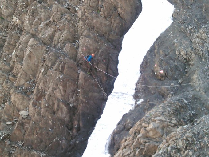 Drahtseile (wo es welche gibt) sind meist (aber nicht immer) in gutem Zustand, am Gelben Schartle mehrere Fixseile (kurze Querung ca. 50° steiles Firncouloir, siehe Bild), teilweise leicht beschädigt durch den dort sehr häufigen Steinschlag.