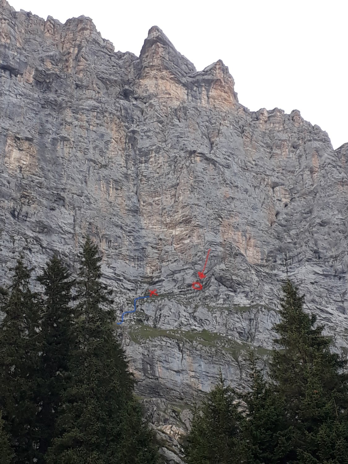 Eine Warnung an alle die das Topo aus dem SAC Kletterführer "Berner Oberland Süd" (Seite 272) verwenden. Die ersten 3 Seillängen der Routen 5 (Inwyler), 6 und 7 sind falsch eingezeichnet und starten ca. 50-100m weiter östlich! Dem Topo aus dem "Extrem West" fehlt zwar eine Seillänge aber es ist trotzdem besser. Ein Foto mit dem korrekten Einstieg ist unten angefügt. Wir sind zuerst dem SAC-topo gefolgt und haben 2 Seillängen geklettert (1 SL: schlecht absicherbar, ca. 4c/5a. alter NH-Stand. 2 SL: cooler Fels, ca. 6a, 2 schlechte NH bis es gut absicherbar wird). Evtl. kommt man auf diesem Weg auf die Inwyler wenn man weiter klettert aber wir haben umgekehrt um den original Einstieg zu suchen (es hat jetzt einen Keil beim Umkehrpunkt)