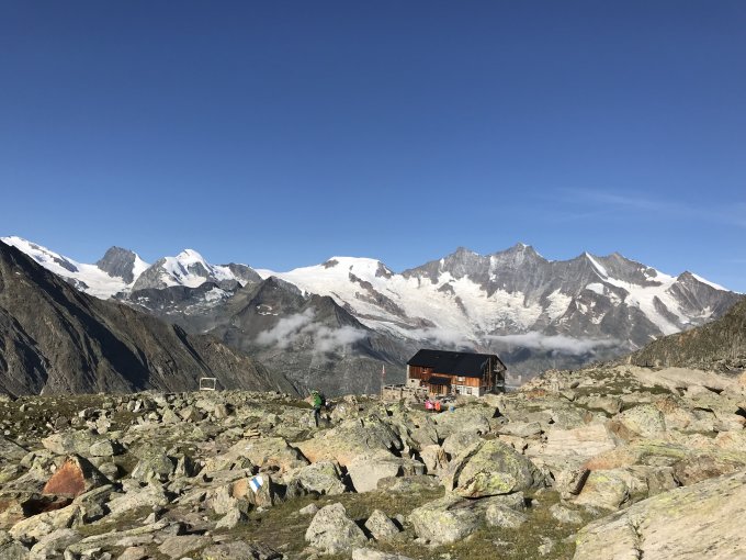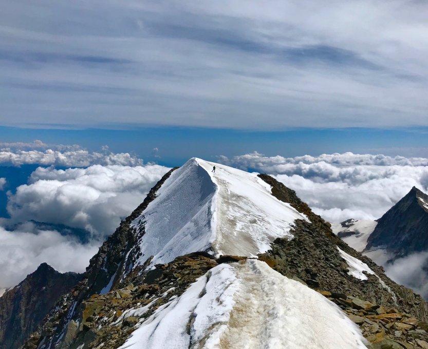 Die Idee hinter dieser Tour war einen 4-Tausender zu erklimmen und gleichzeitig auf Seilbahnen, Berghütten, Biwacks, Bergführer etc. zu verzichten. Wir starteten deshalb beim Tagesanbruch in Saas-Almagell und waren um den Mittag auf dem Gipfel. Der Abstieg ins Tal auf dem gleichen Weg dauert ca. 5 Std. Insgesamt waren es 12 Stunden und 2'430 Hm auf einer sehr lohnenden Route!