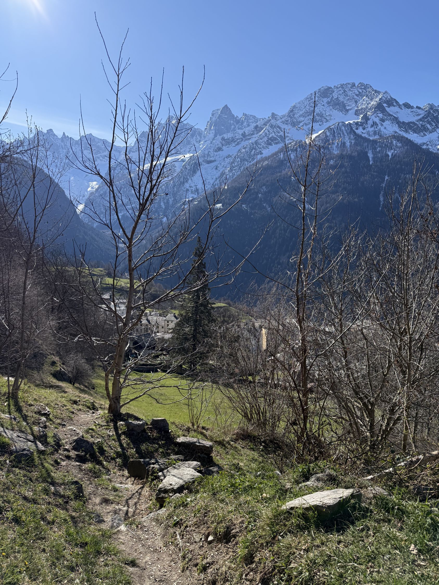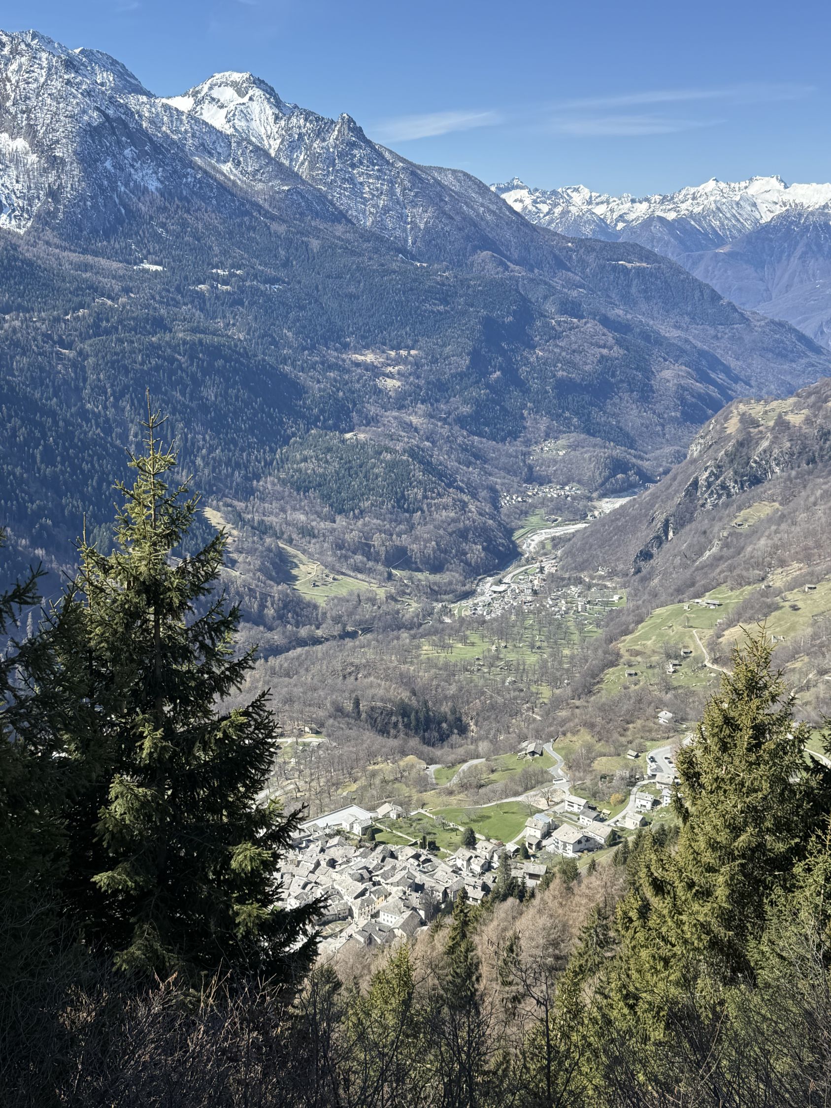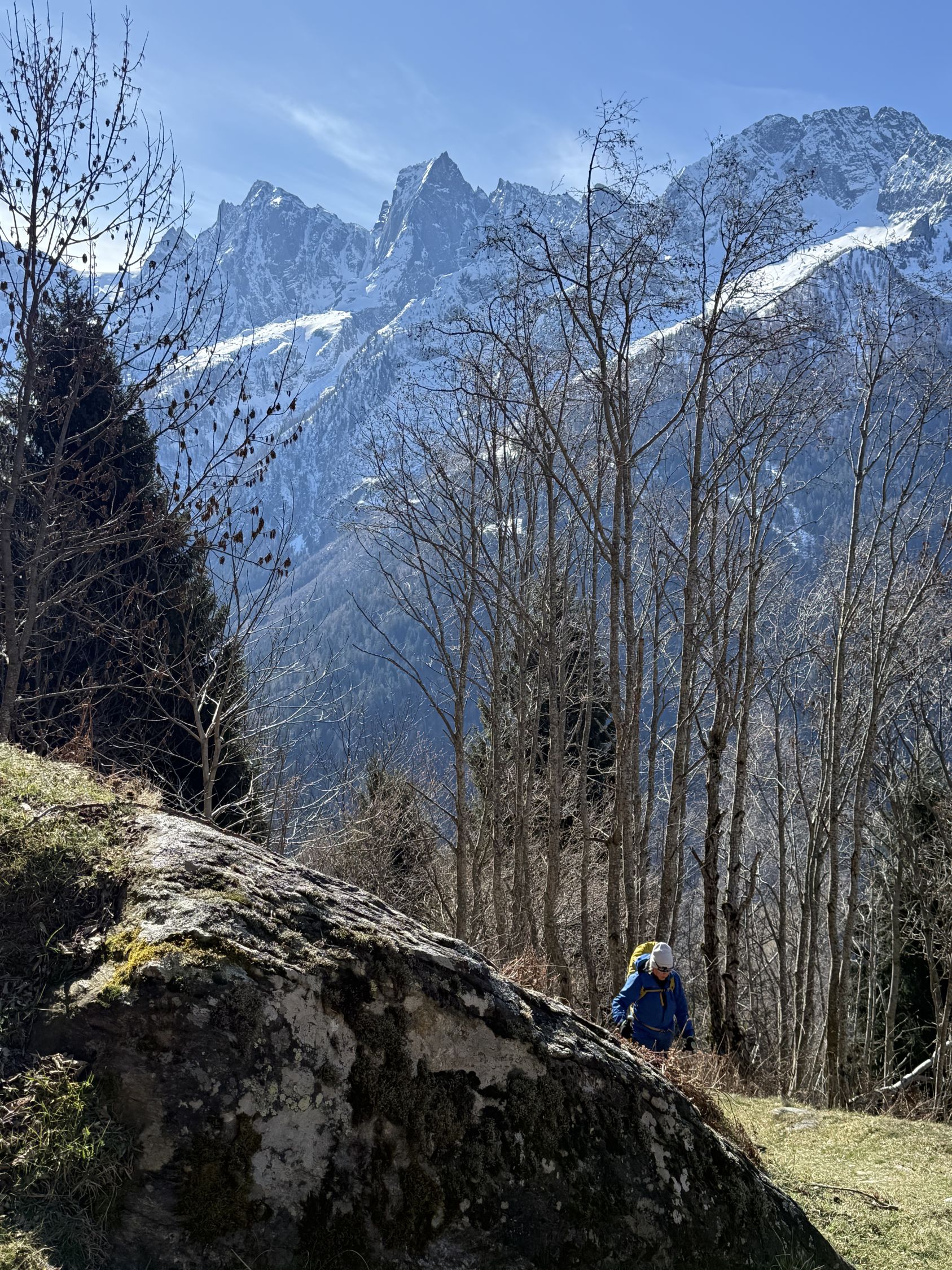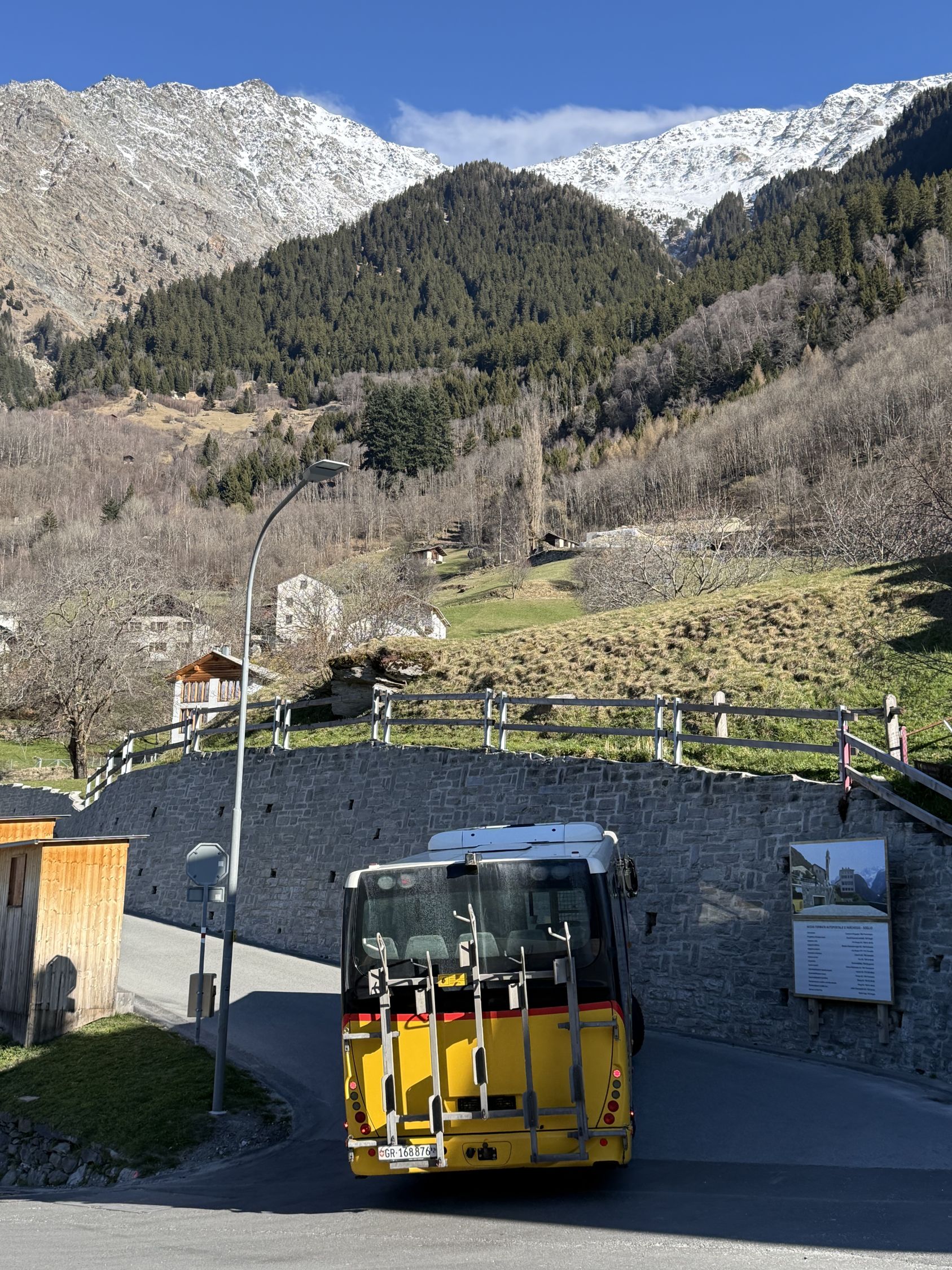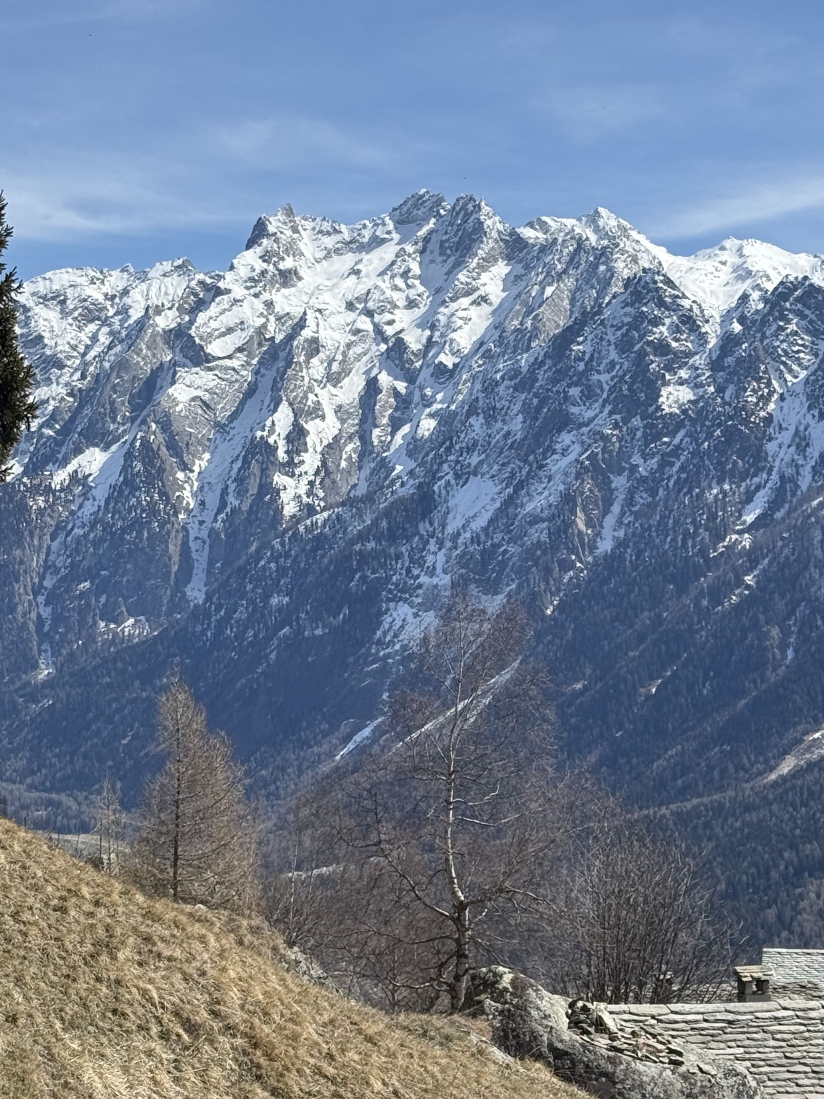 Frühlingstour auf die Aussichtsterrasse über Soglio mit spektakulärem Blick zum Pizzo Badile, ÖV Tour, T3. Start Soglio 10.00 Uhr, minus 3 Grad, starke unangenehme Bise, blauer Himmel. Den trockenen steilen gut angelegten und markierten Wanderweg bis auf die grosse Terrasse Tombal. Toller Blick zu den Kletterriesen Pizzo Badile und Sciora, alle noch weiss. Abstieg wie Aufstieg. Zvieri im Hotel Stüa Granda mit hervorragendem Marronikuchen!