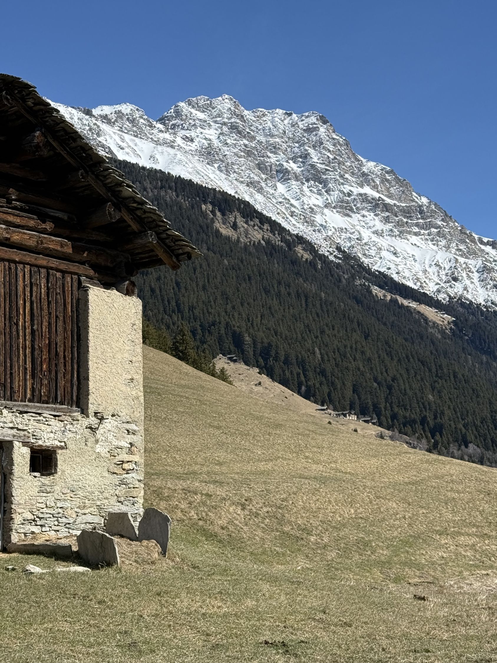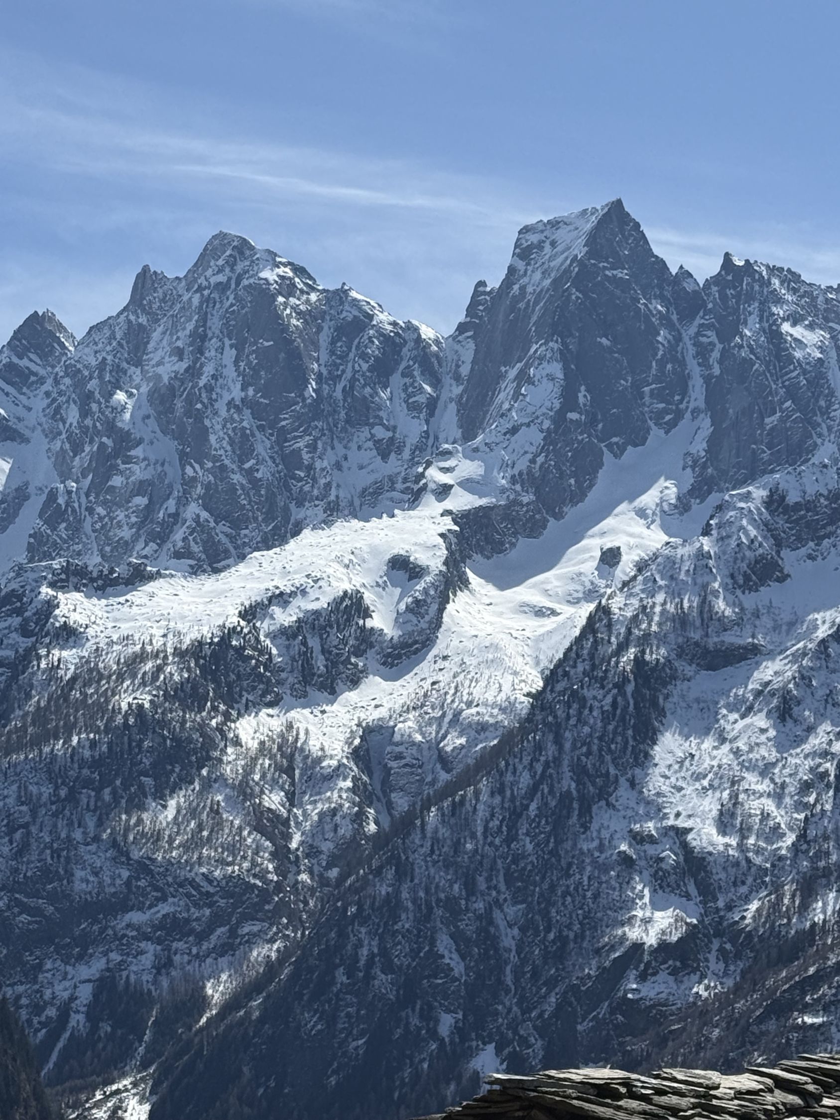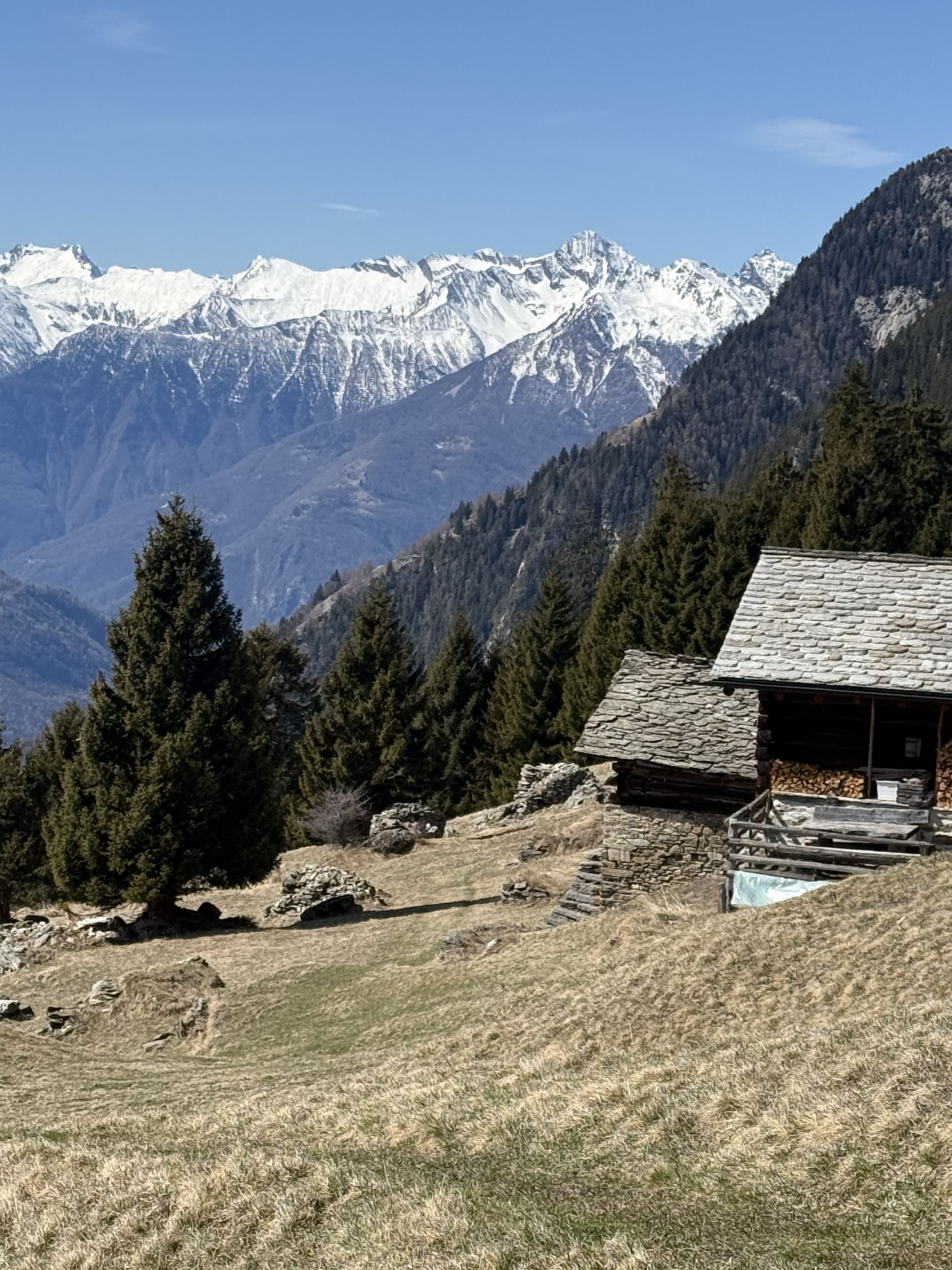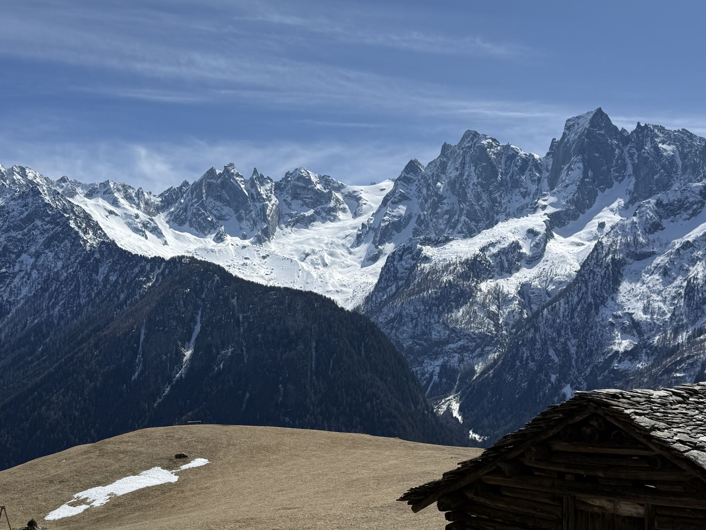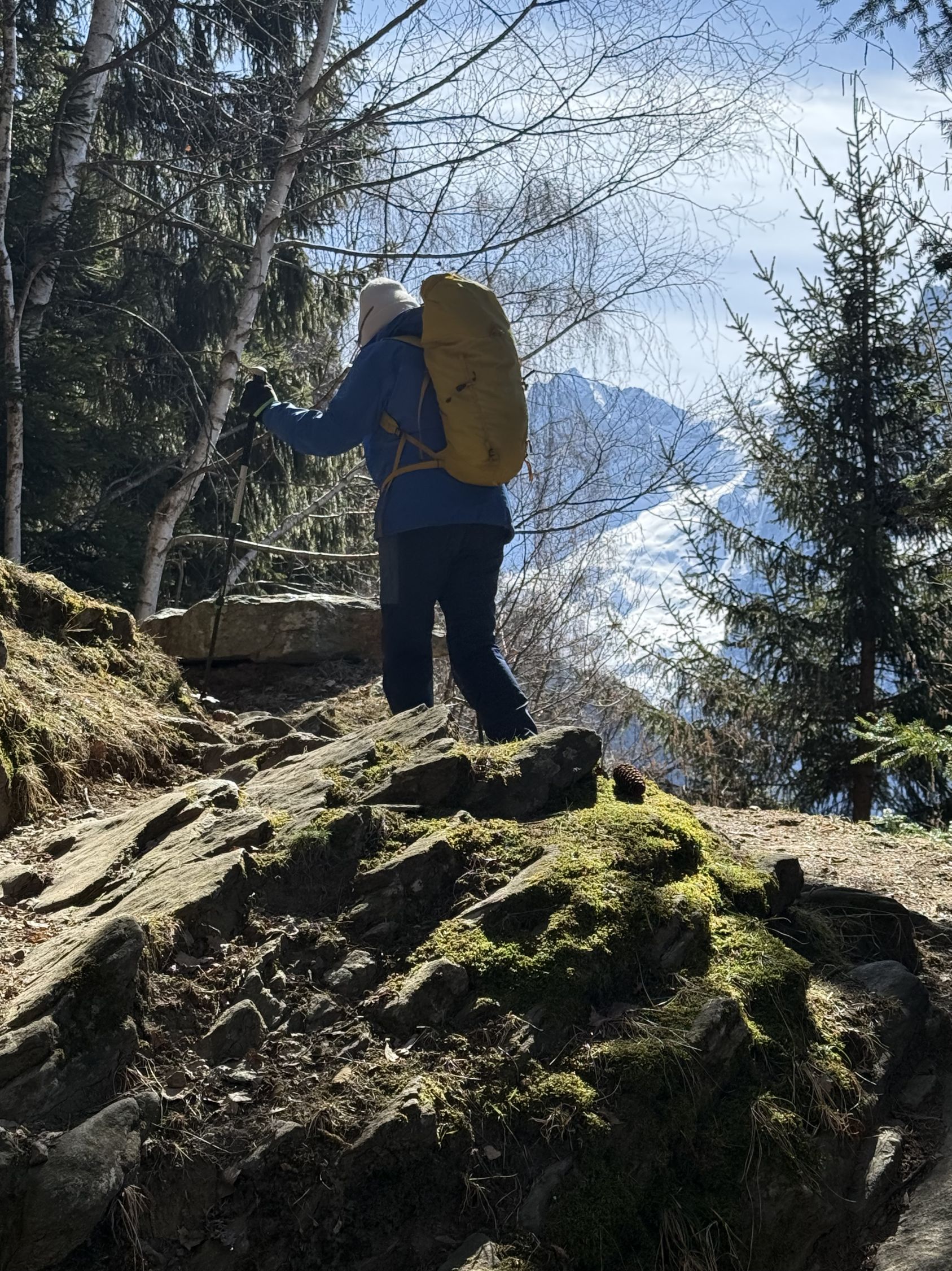 Frühlingstour auf die Aussichtsterrasse über Soglio mit spektakulärem Blick zum Pizzo Badile, ÖV Tour, T3. Start Soglio 10.00 Uhr, minus 3 Grad, starke unangenehme Bise, blauer Himmel. Den trockenen steilen gut angelegten und markierten Wanderweg bis auf die grosse Terrasse Tombal. Toller Blick zu den Kletterriesen Pizzo Badile und Sciora, alle noch weiss. Abstieg wie Aufstieg. Zvieri im Hotel Stüa Granda mit hervorragendem Marronikuchen!