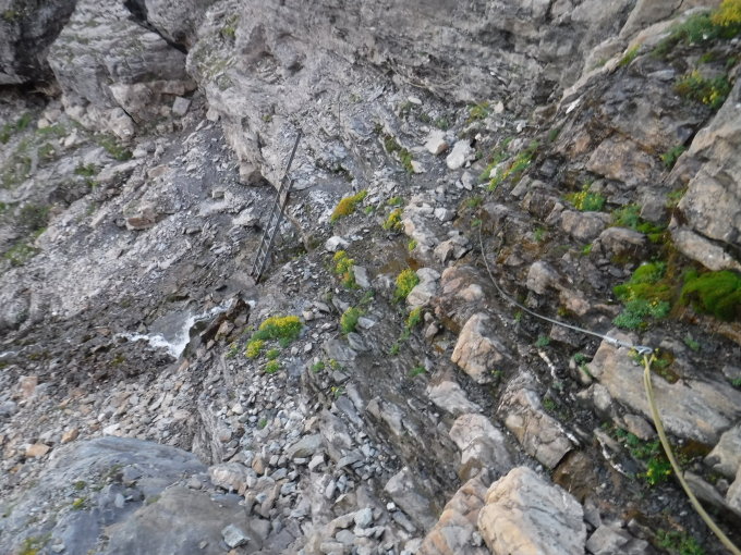 Nach der Dossenhütte sah ich 6 Leute vor mir am Nordgrat vom Dossen klettern, die sich auch alle ins neue dicke grüne Gipfelbuch vom 26.7.2019 eintrugen und mir im Aufstieg entgegenkamen. Danke dem Pärchen, welches das Buch hinauf trug. Ohne Seilsicherung wollte ich den 120 m hohen Nordgrat zum Dossen-Nordgipfel nicht testen (K 3). Drum lief ich lieber über den Bänderweg (Normalweg).