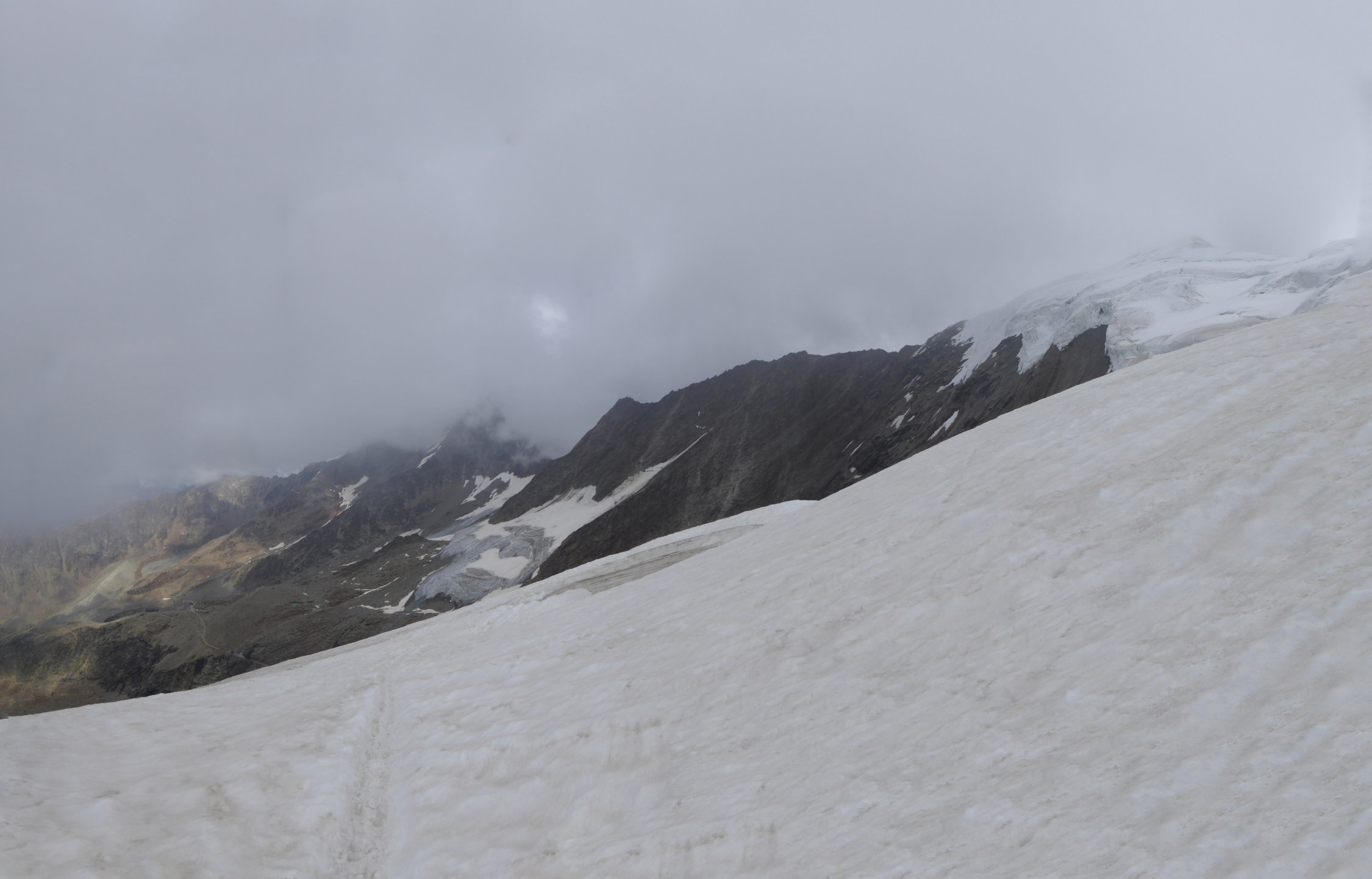 Oberer Teil des Zustiegs zum Lagginjoch ab Hohsaas mehrheitlich blank. Felsteil des Nordgrates schneefrei. Firngrat gut begehbar. Imposanter Abstieg über Normalroute durch den Abbruch. Eine Stelle mit Fixseil gesichert.