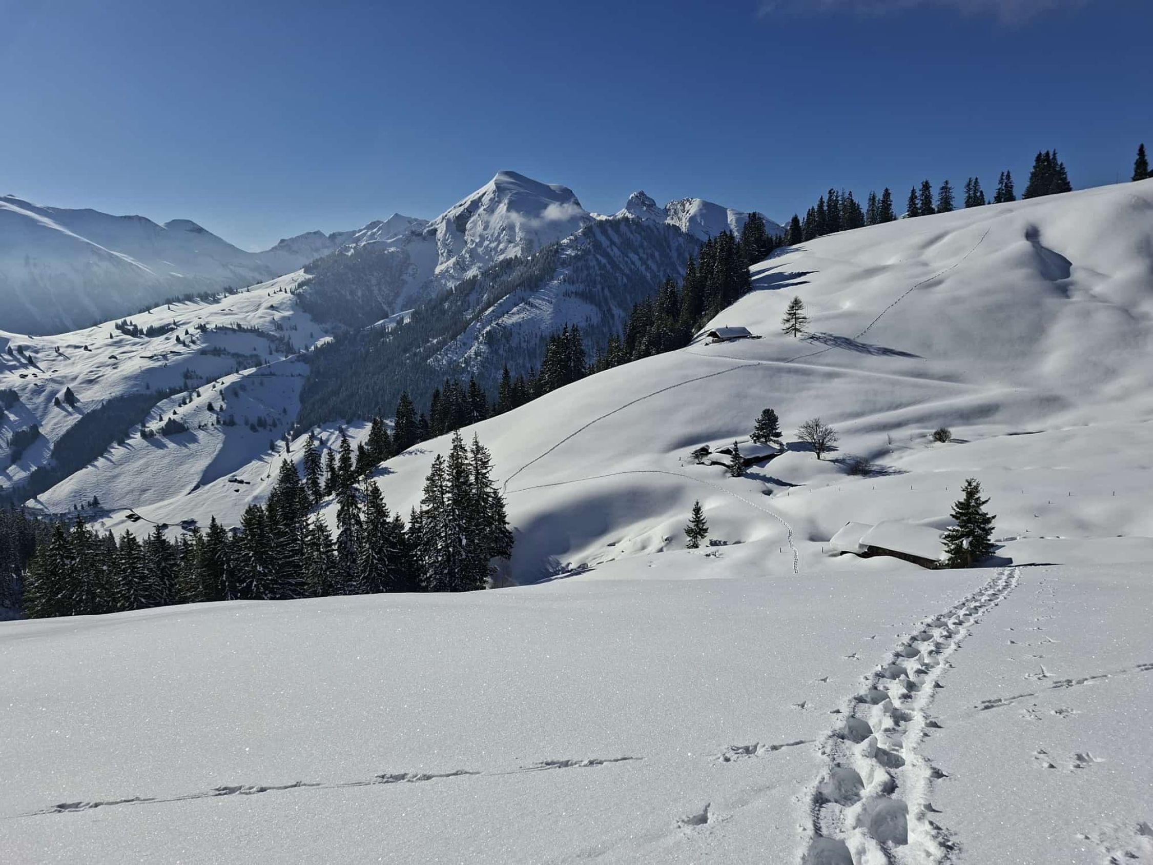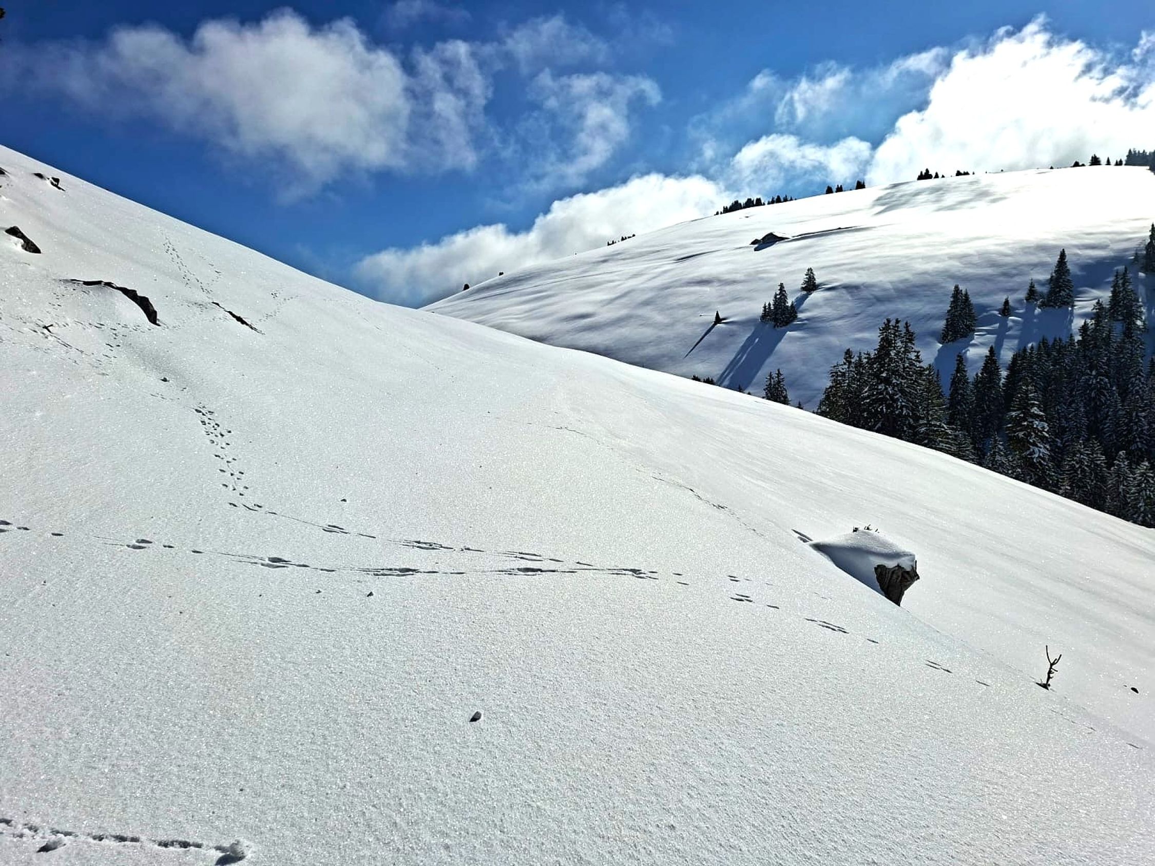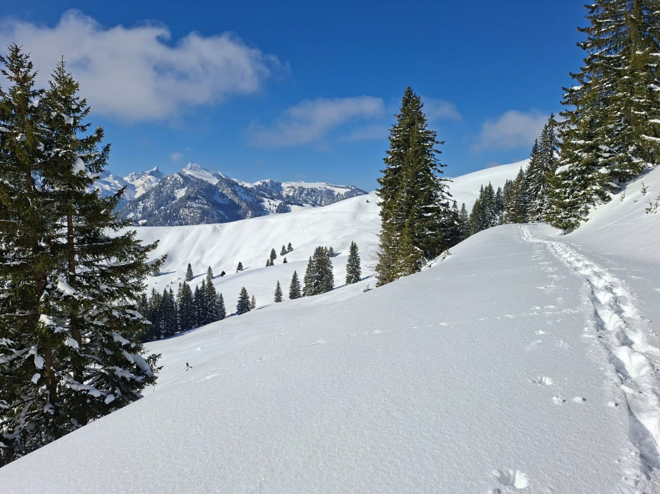 Schneedecke gefroren aber nicht ganz tragend (Deckel). Im Gandgrabe viel Pulverschnee. Erst ab Obers Blaachli wieder etwas Deckel. Der Osthang ab Rinderalp Pulver gut aber mit unangenehmer Stollenbildung. Strenge Spurarbeit. ABSTIEG zurück nach Zwischenflüh.