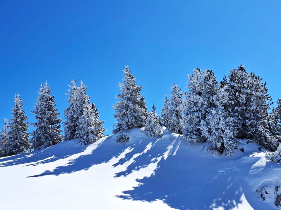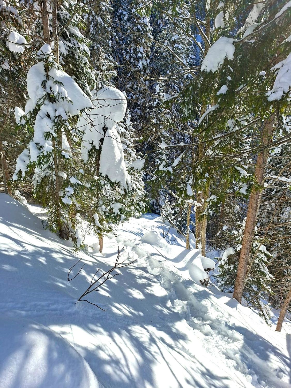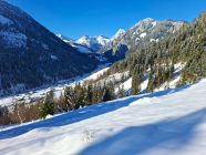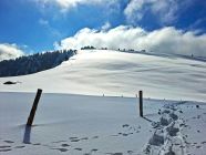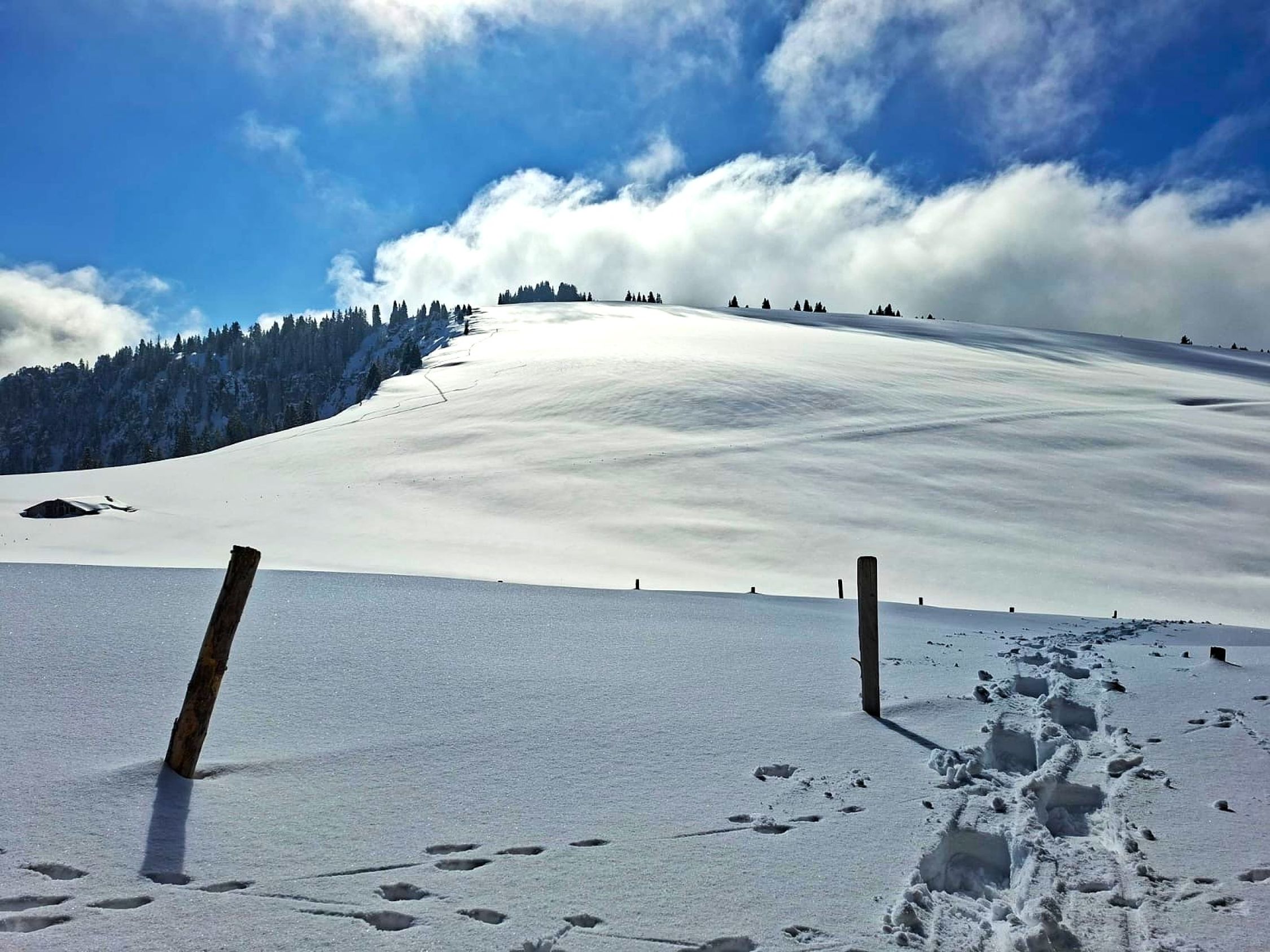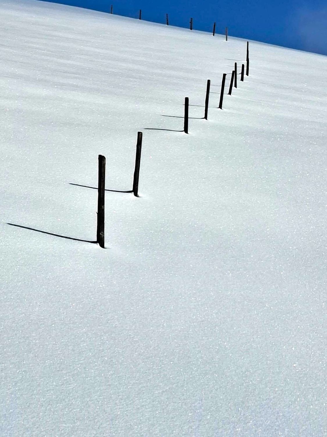 Schneedecke gefroren aber nicht ganz tragend (Deckel). Im Gandgrabe viel Pulverschnee. Erst ab Obers Blaachli wieder etwas Deckel. Der Osthang ab Rinderalp Pulver gut aber mit unangenehmer Stollenbildung. Strenge Spurarbeit. ABSTIEG zurück nach Zwischenflüh.